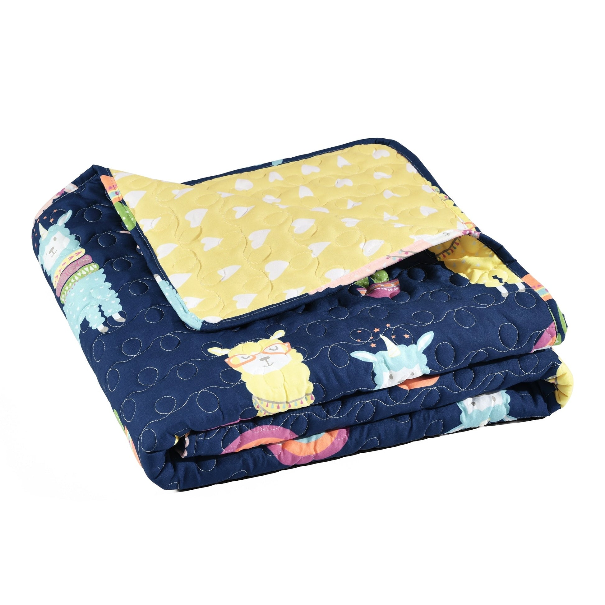 Update your child’s bedroom or baby’s nursery with the soothing colors of this throw which features a southwestern style llamas, cacti and rainbows on the front. Small hearts adorn the back side.