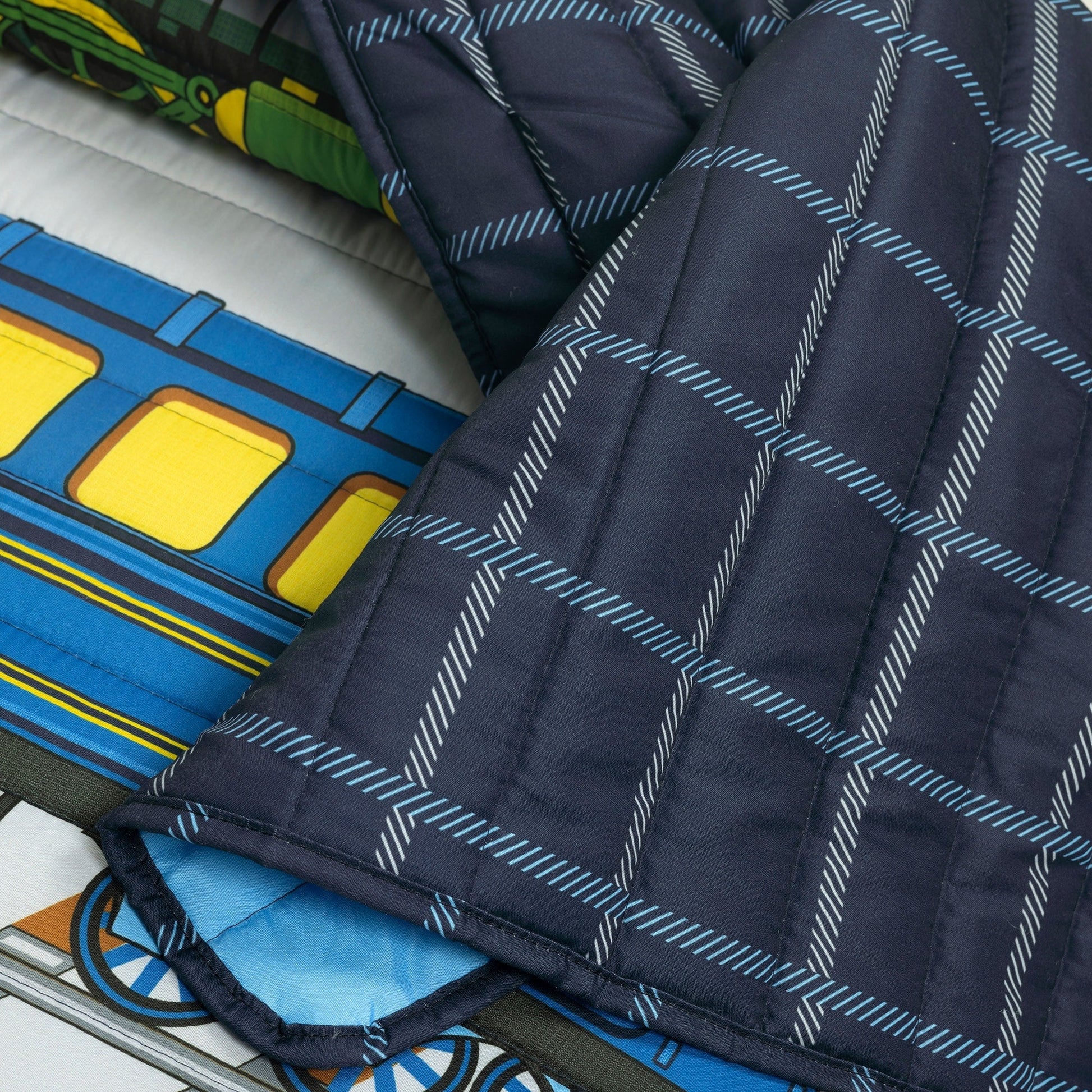 All Aboard! Your child will love being the conductor of this railway journey when you add our Steam Trains Reversible Quilt Set to their bedroom. This colorful pattern shows 3 vintage steam engine trains chugging along train tracks. The cool printed trains are accompanied with a grid patterned reverse for multiple ways of styling. . Inspire your child's imagination and creativity in retro steam trains with this locomotive themed reversible quilt set. Enjoy two looks in one set! Simply flip this kids bedding set over to reveal a dark blue grid pattern. The lightweight breathable quilt makes this bedding perfect for your child to stay comfortable during any season. This bedding set includes quilt and standard pillow shams. This microfiber bedding set offers softness and breathability. The polyfill is perfect for hot sleepers and great as an extra layer for those cold sleepers who layer-up to keep warm. This bedding set is STANDARD 100 by OEKO-TEX® certified, which means the fabric, dyes and all components have been tested in an independent laboratory and certified against a list of more than 350 harmful substances. Caring for the Steam Trains Reversible Quilt Set is easy, simply machine wash cold on the gentle cycle and tumble dry low for a quick refresh. Please refer to label for full care instructions.