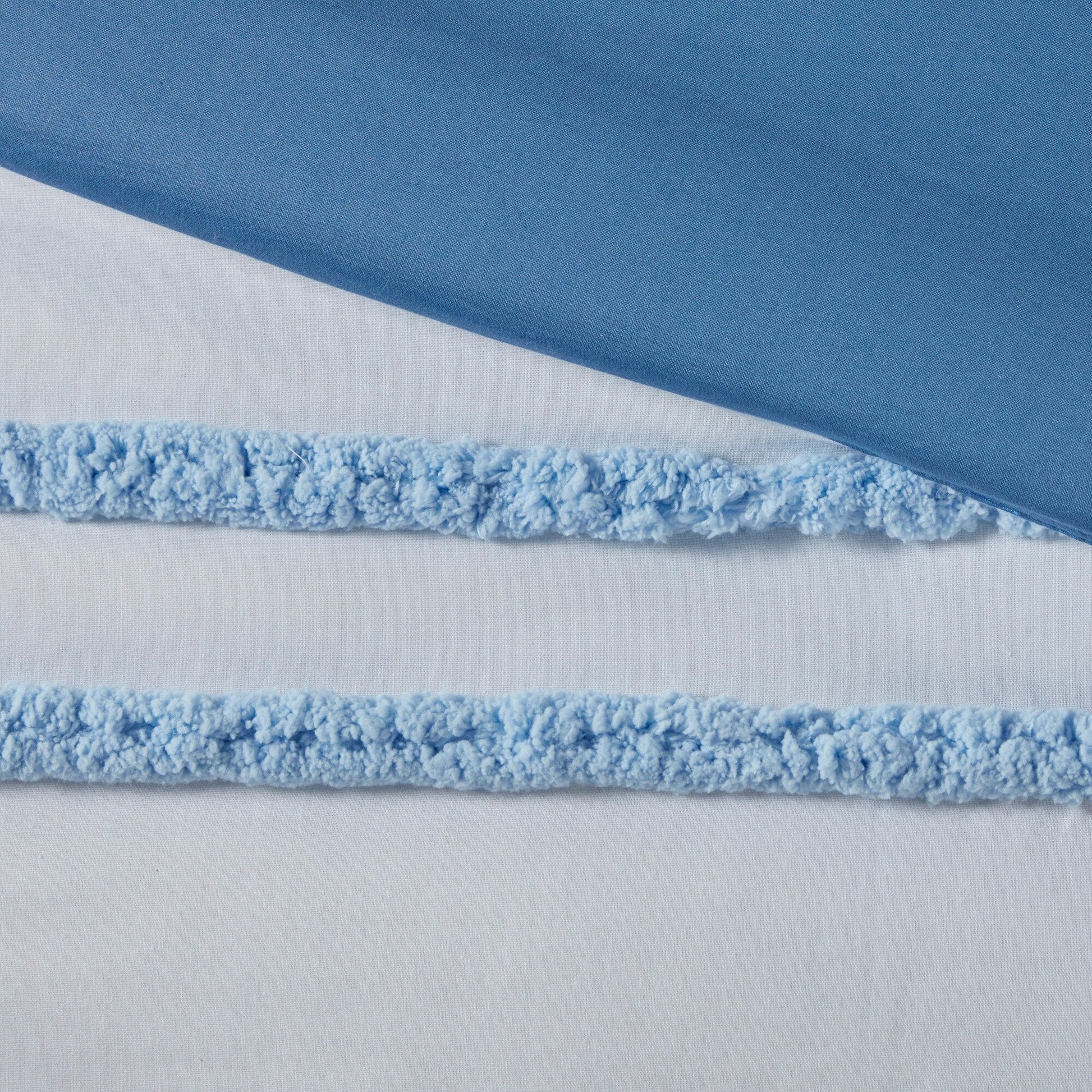 - Duvet/ Sham: 100-percent cotton solid face and reverse, with chenille trims on the face