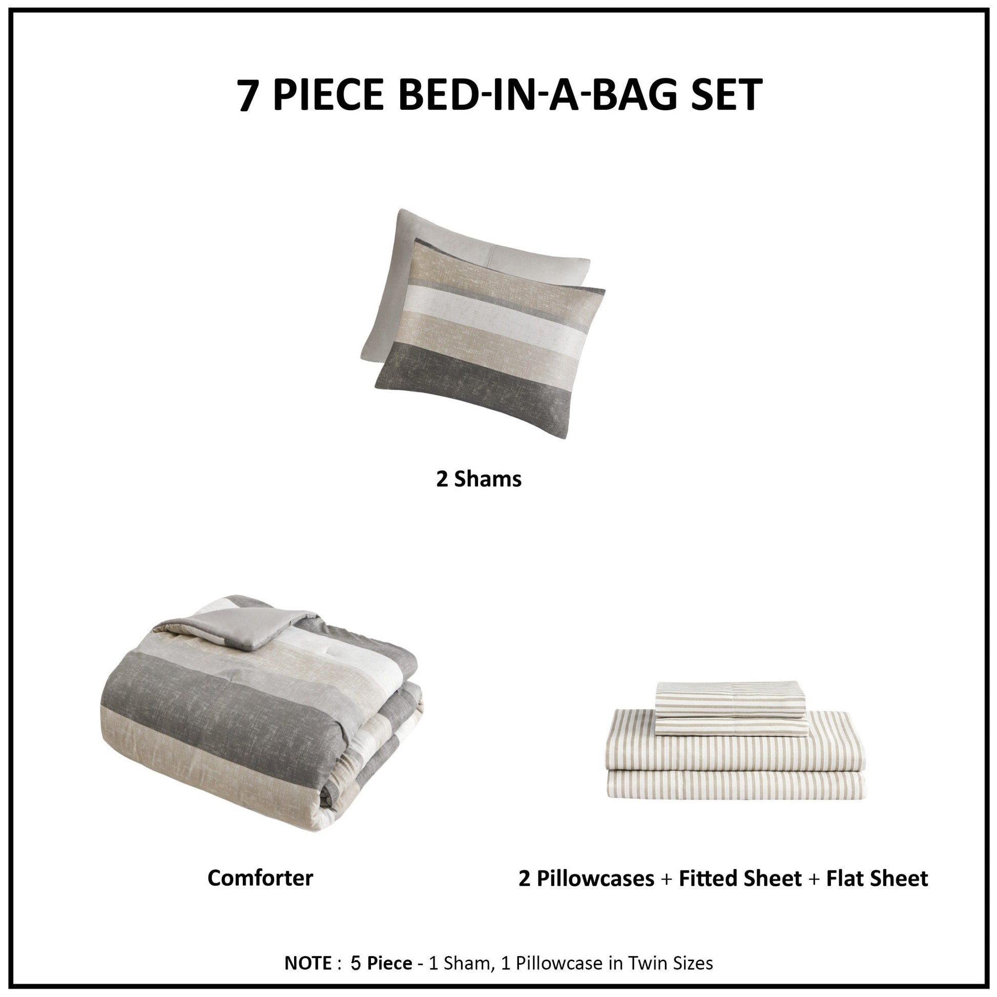 - Bed in a Bag Set includes comforter, 2 shams (1 in Twin), 1 flat sheet, 1 fitted sheet, 2 pillowcases (1 in Twin)