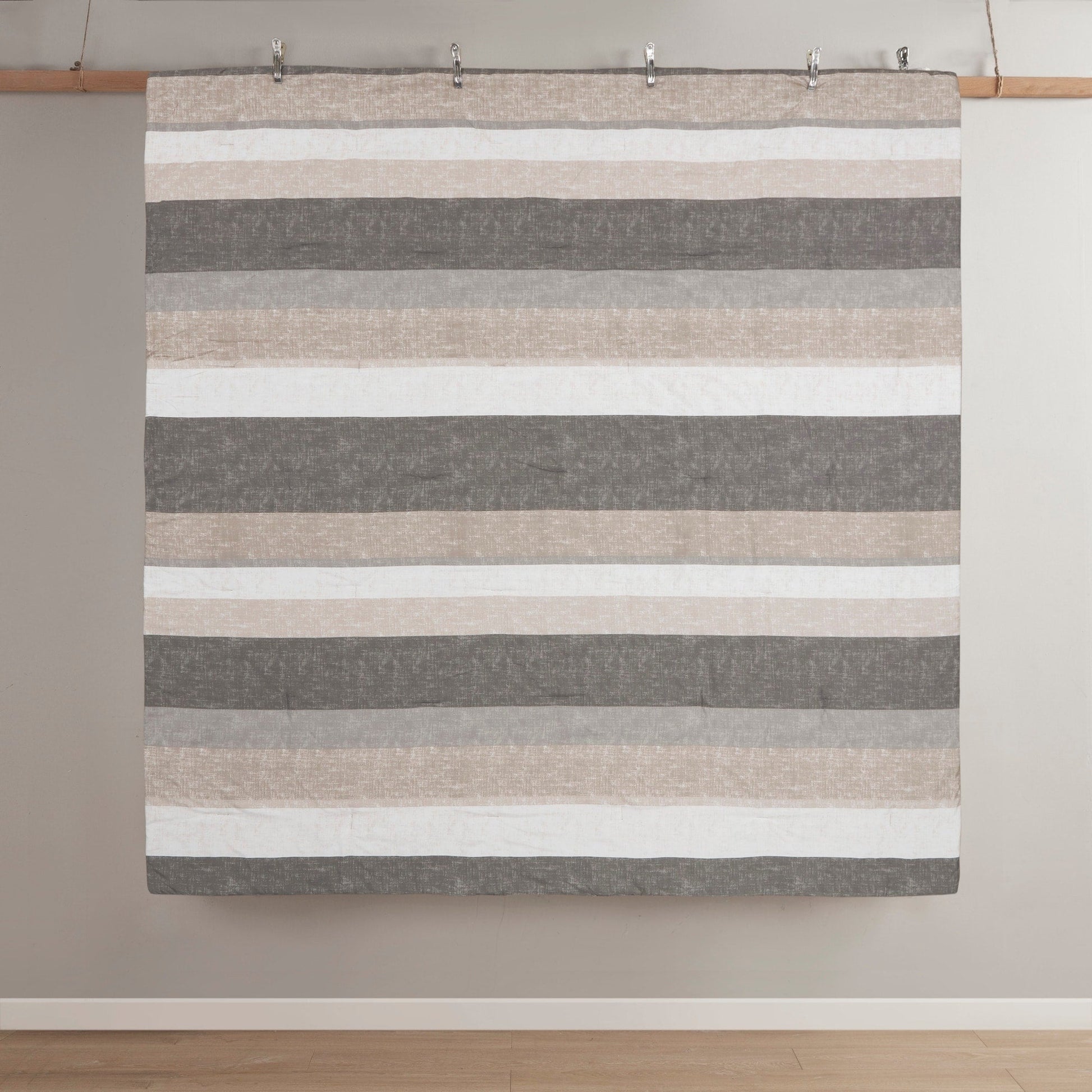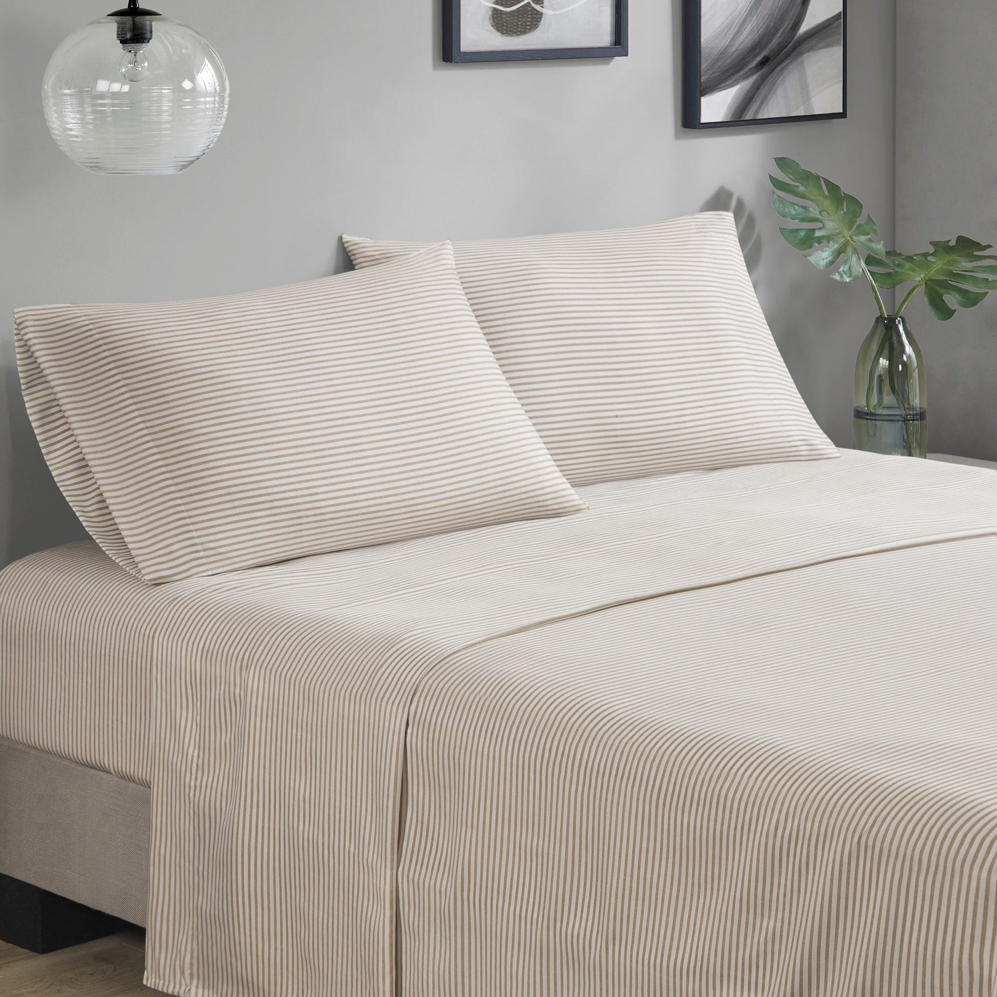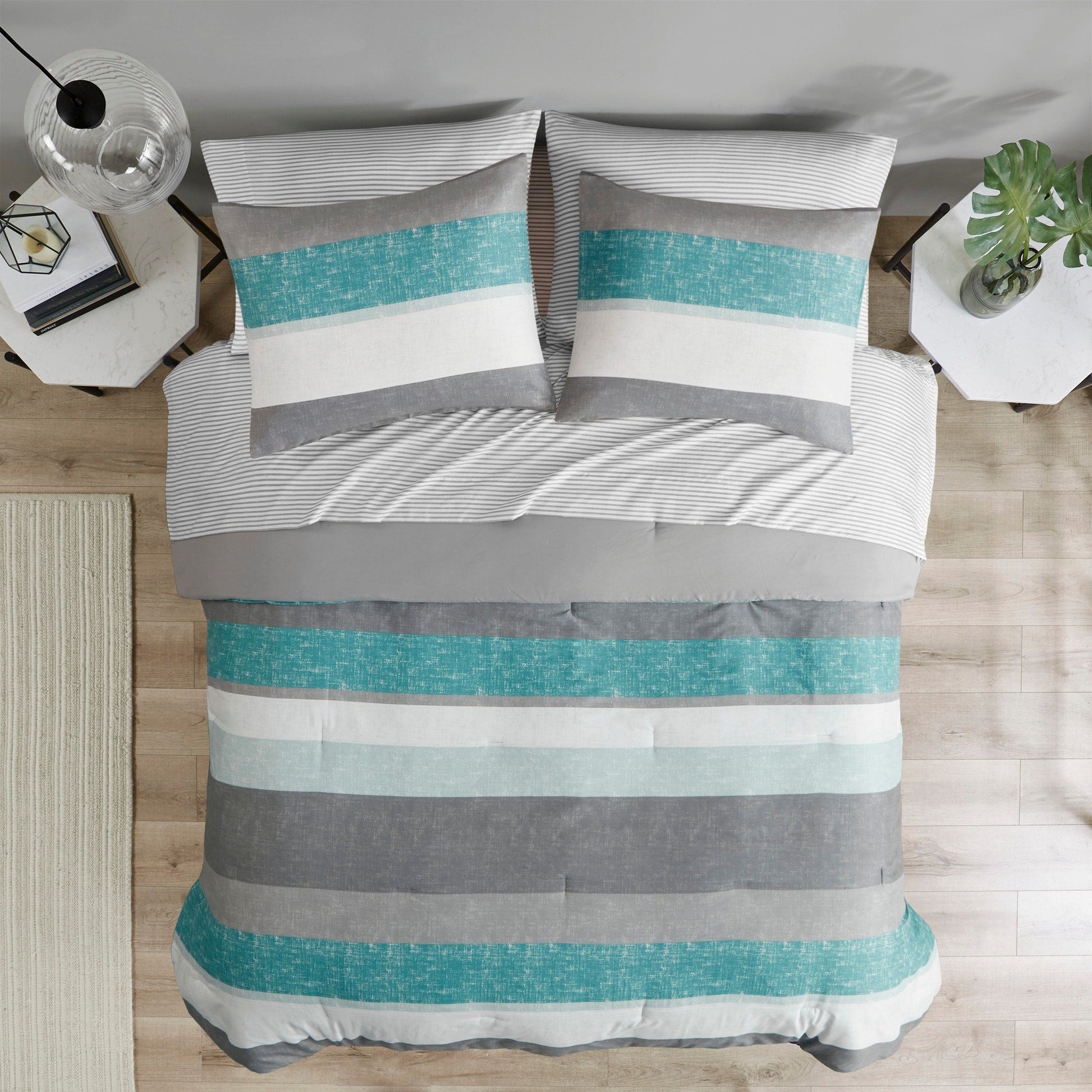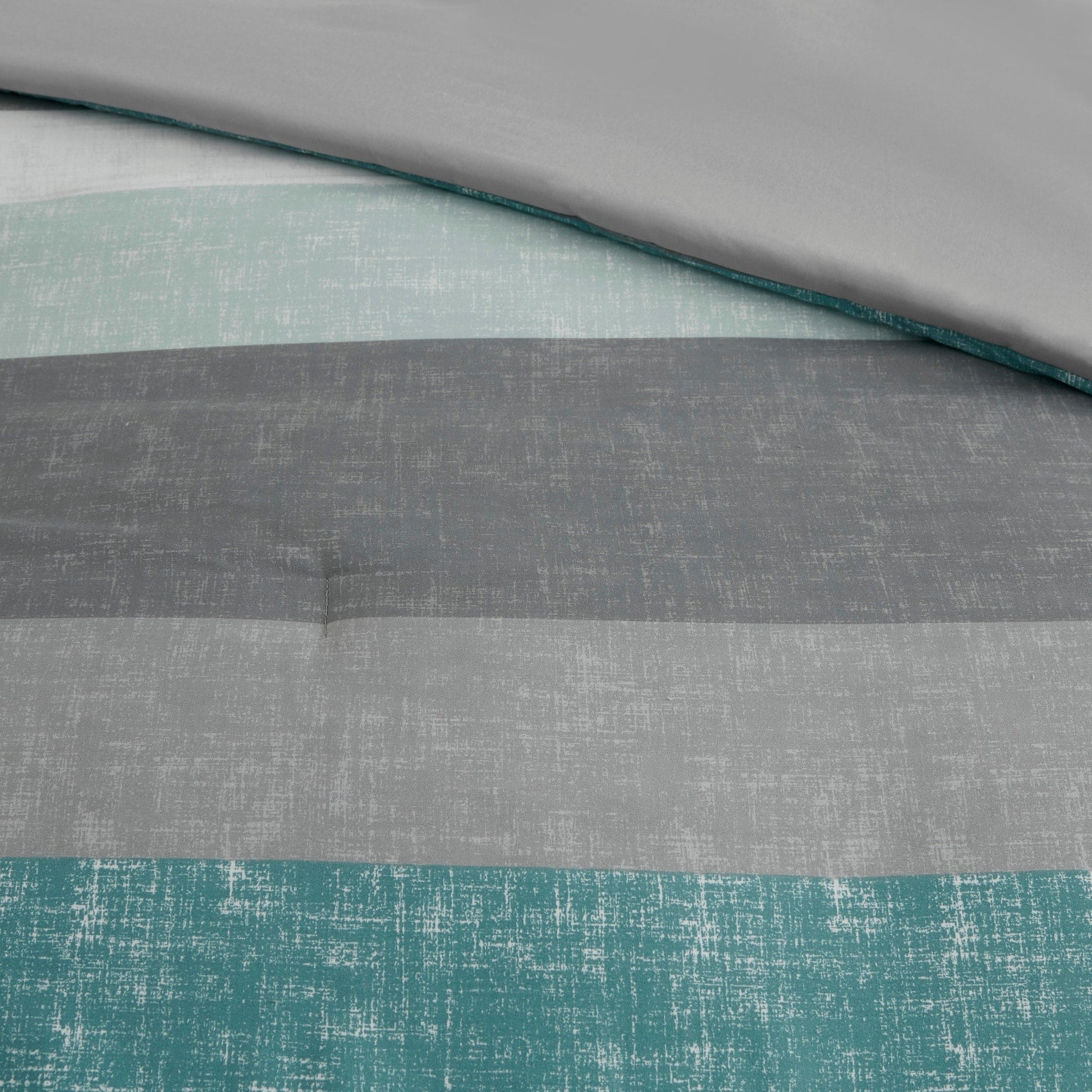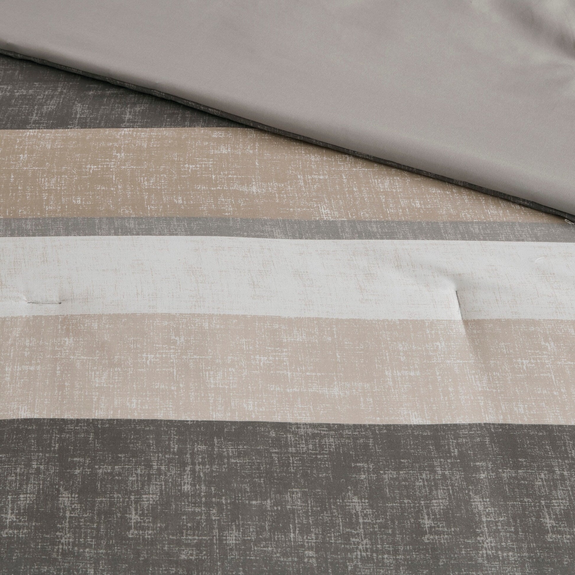 Revamp your bedroom style with the Madison Park Essentials Deacon bed in a bag. This modern comforter set features a stripe pattern in alternating grey, white, and taupe colors that’s pair with a solid grey reverse to create a casual vibe. The included sheet set has a coordinating stripe design to complement the soft and cozy comforter’s look. Included in the set is 1 comforter, 2 shams (1 in Twin), 1 flat sheet, 1 fitted sheet, and 2 pillowcases (1 in Twin). The fitted sheet fits up to 14'(12'for Twin size) mattress depth. This machine washable bedding set is OEKO-TEX certified and features an antimicrobial treatment, which inhibits bacteria growth and keeps the bedding fresher for longer. Totally refresh your space without breaking the bank with this complete comforter set with bed sheets.