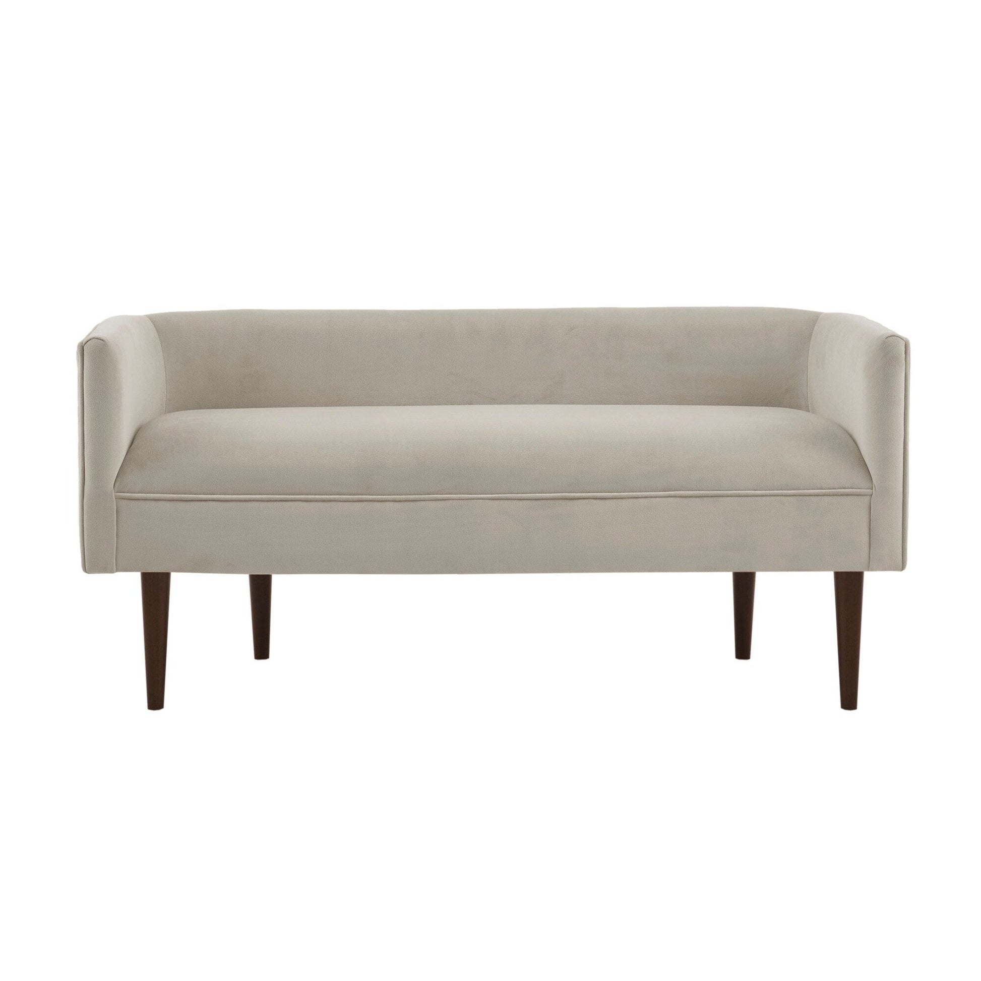The Madison Park Lovisa Accent Bench offers a fashionably unique update to your living room or entryway. This accent bench is upholstered in a rich cream velvet fabric and features a low back and sides, for a chic transitional look. The solid wood legs flaunt a dark brown finish that adds a bold contrast to the upholstery. Leg assembly is required and a tool is included.