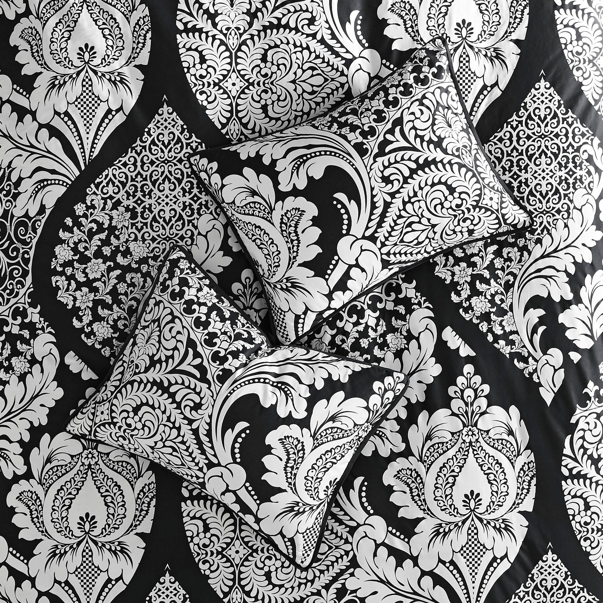 - Transitional style with intricate damask design in contrasting colors and solid color reverse