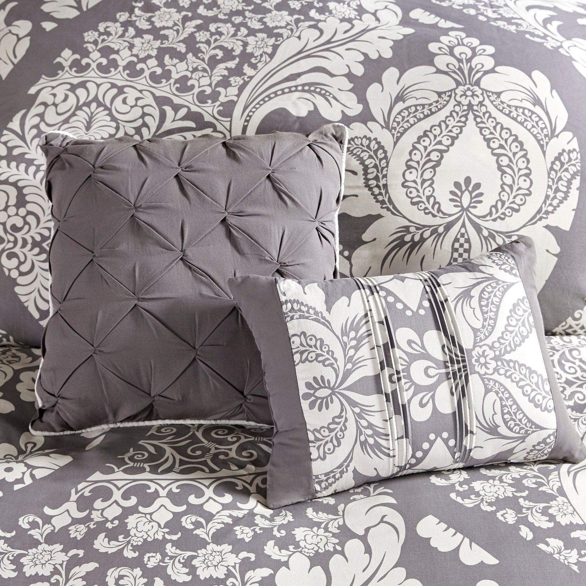 Transform your bedroom into a chic oasis with the Madison Park Marcella 7 Piece Cotton Printed Comforter Set. The intricate damask pattern on the comforter and shams, along with the solid reverse and charming flange border, create a transitional look that is sure to impress. Made from 100% cotton sateen, this set is incredibly comfortable and OEKO-TEX certified to contain no harmful substances or chemicals. Three decorative pillows with embroidered details and fabric manipulation, plus a solid bed skirt, complete the look. Hypoallergenic polyester filling in the comforter and pillows make this set perfect for those with allergies. Machine washable for easy care.