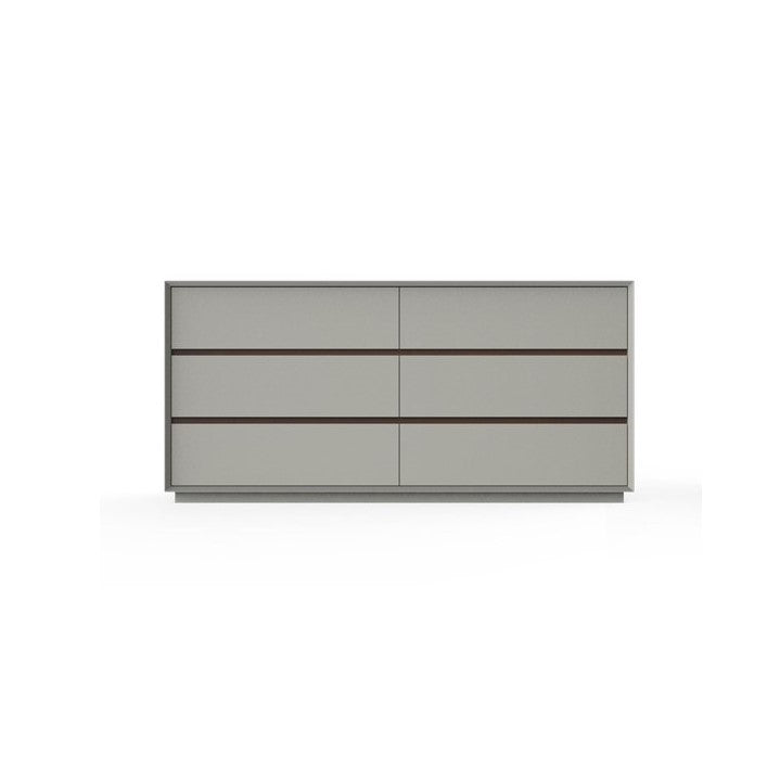 [description] Embellissez votre chambre et soulignez votre style contemporain avec la commode Magda. Cette commode spacieuse dispose de six tiroirs de rangement. Parfaite pour les chambres modernes, elle est laquée gris clair mat avec des détails en noyer.