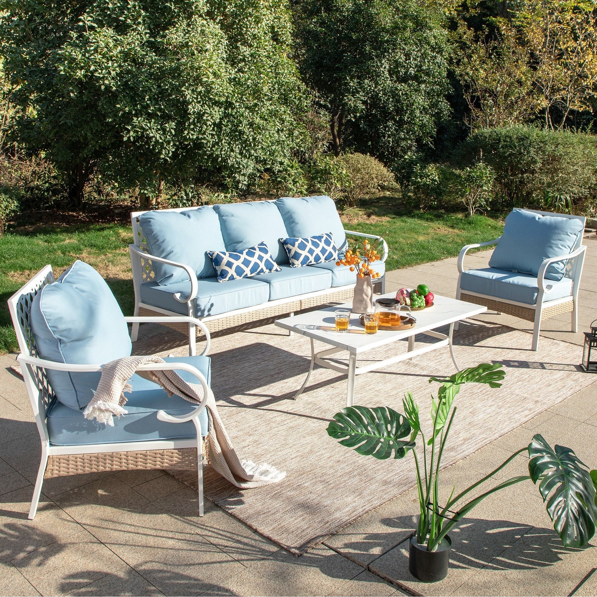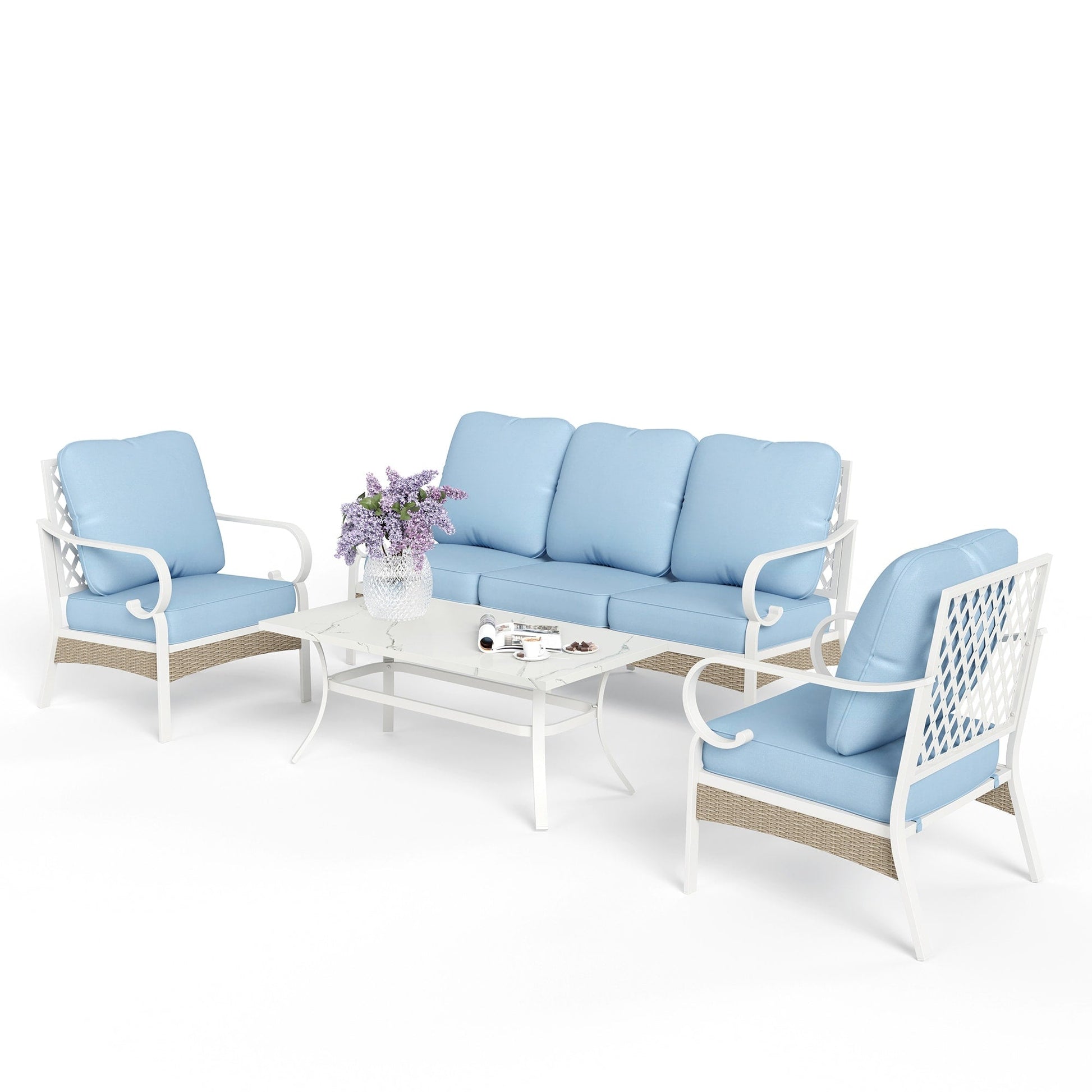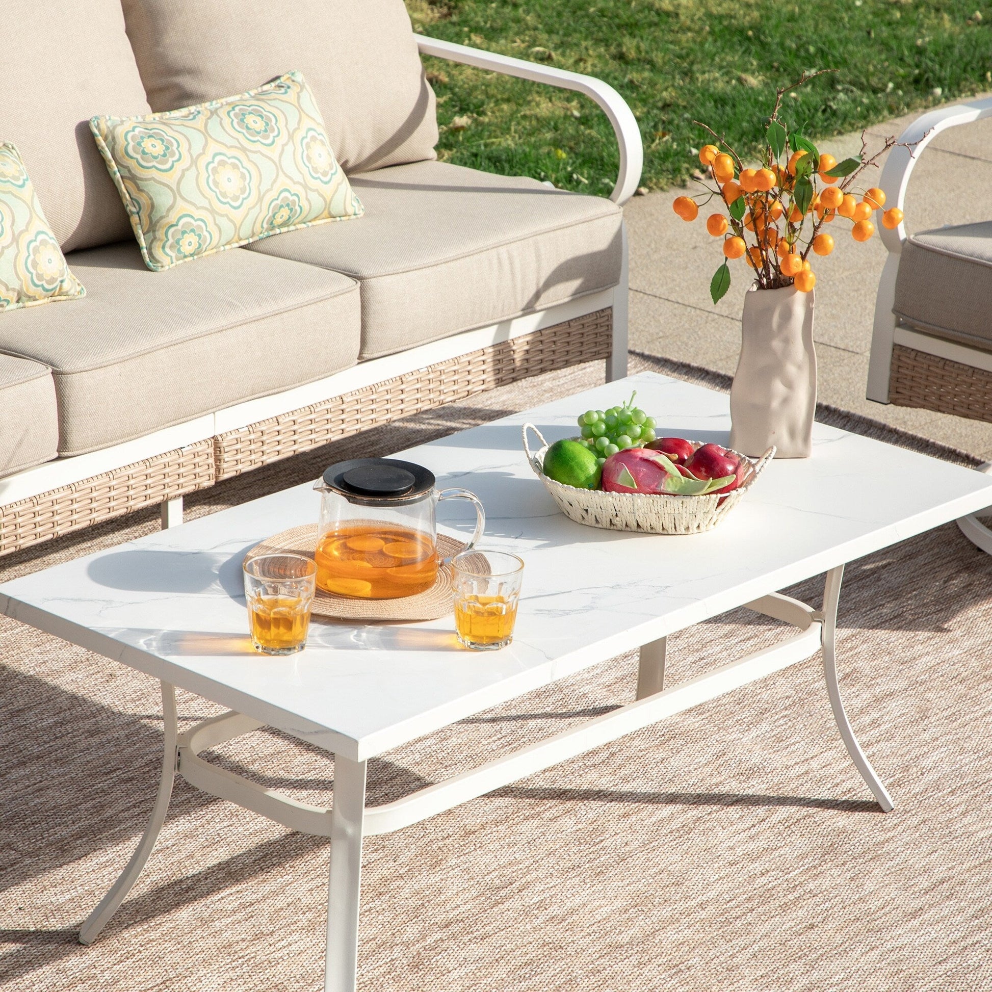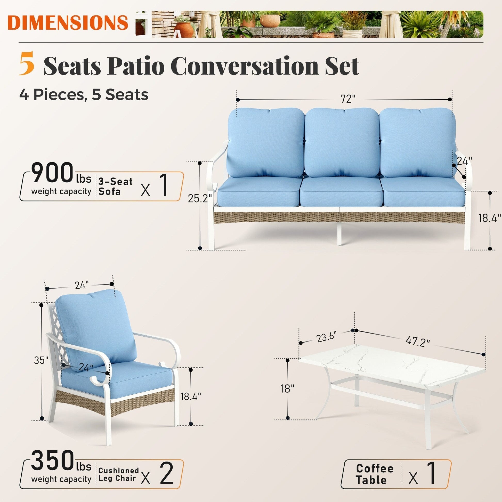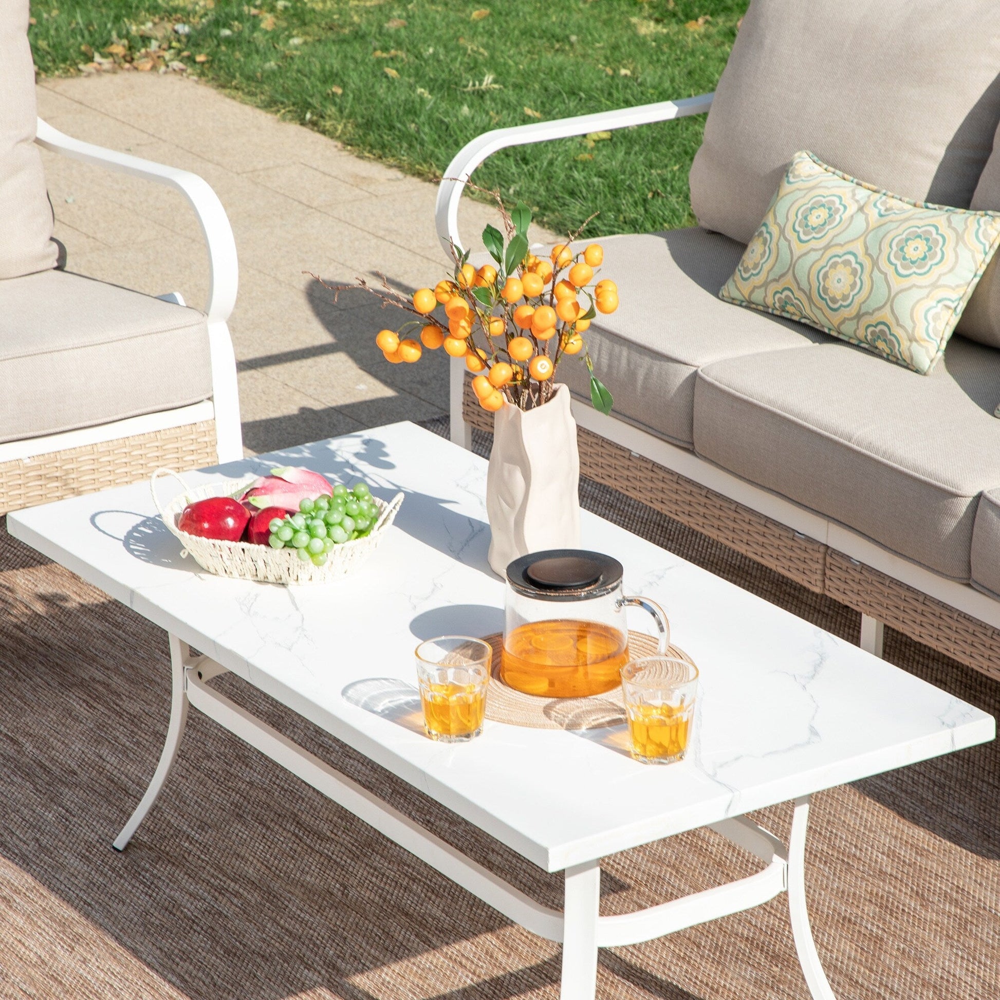 MAISON ARTS 5-Seat Patio Furniture Set, 2 x Cushioned Metal Chair, 1 x 3-Seat Sofa with Marbling Coffee Table
