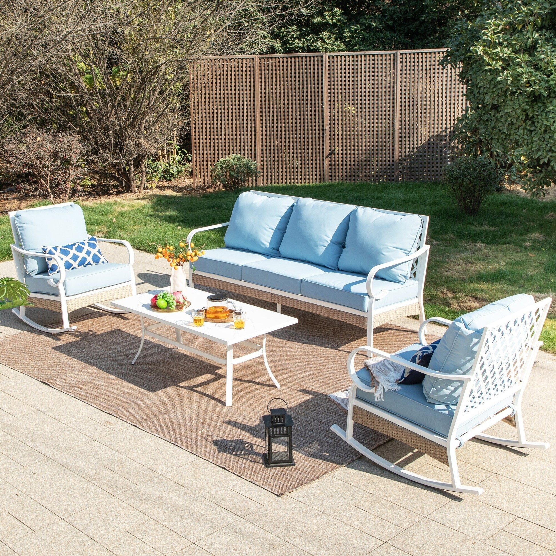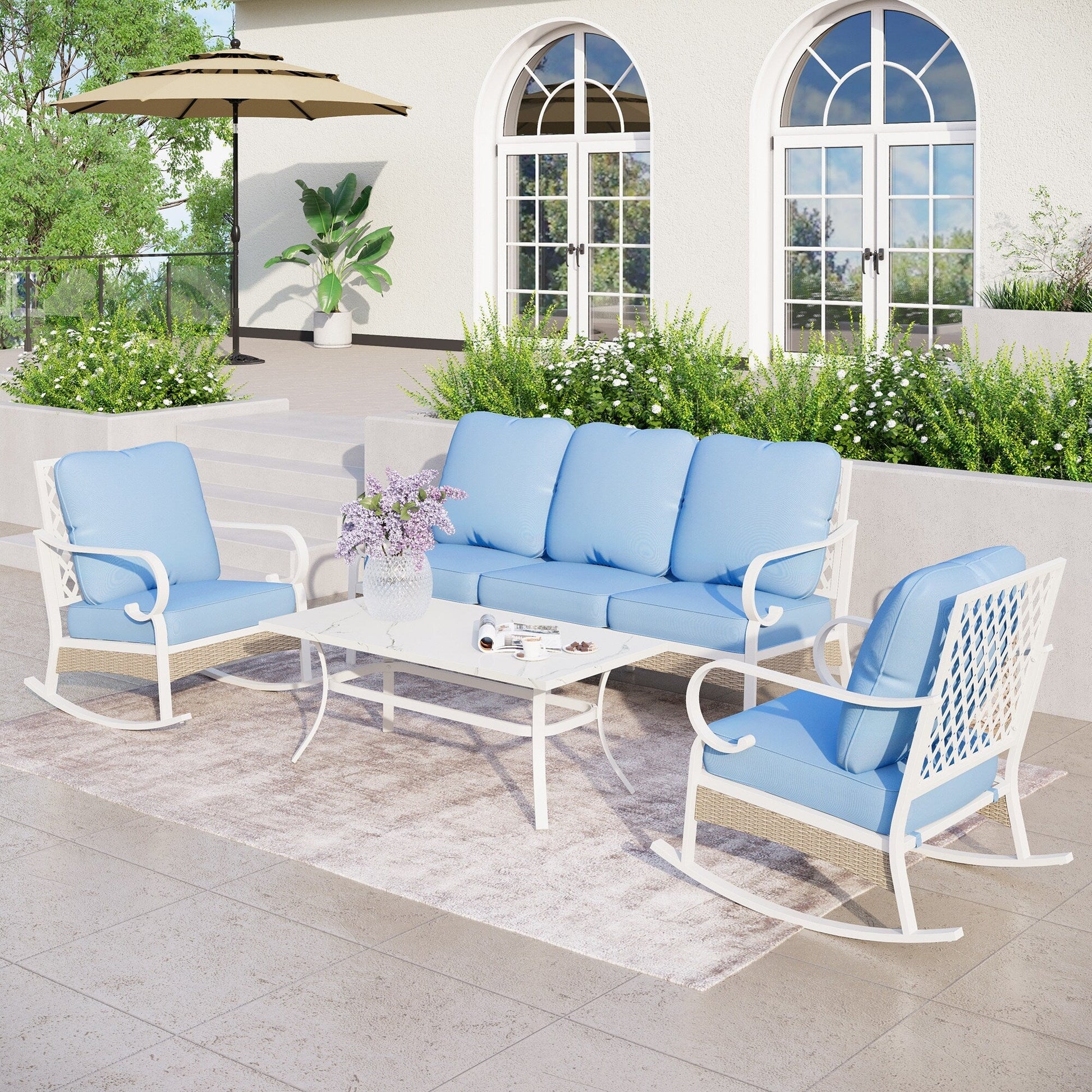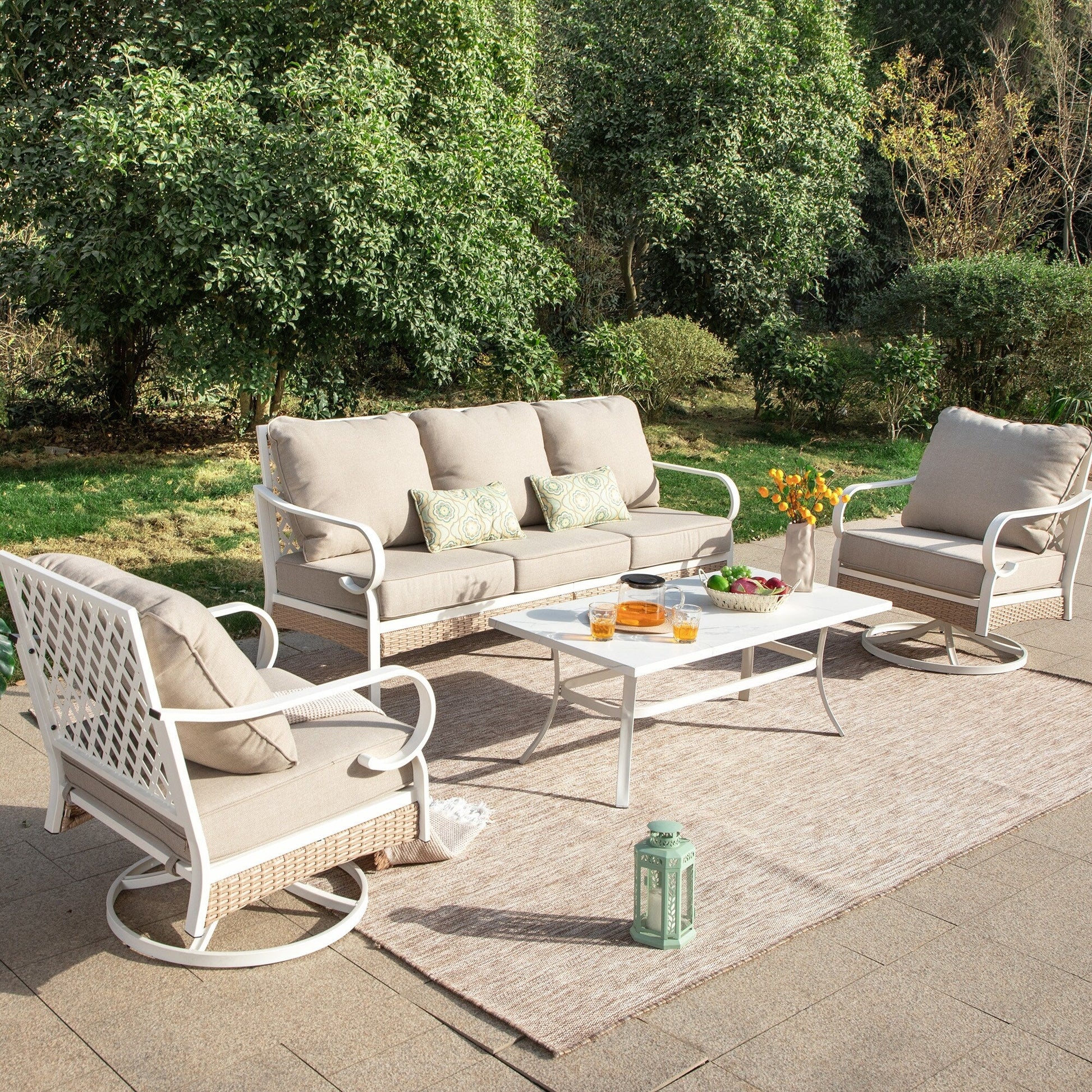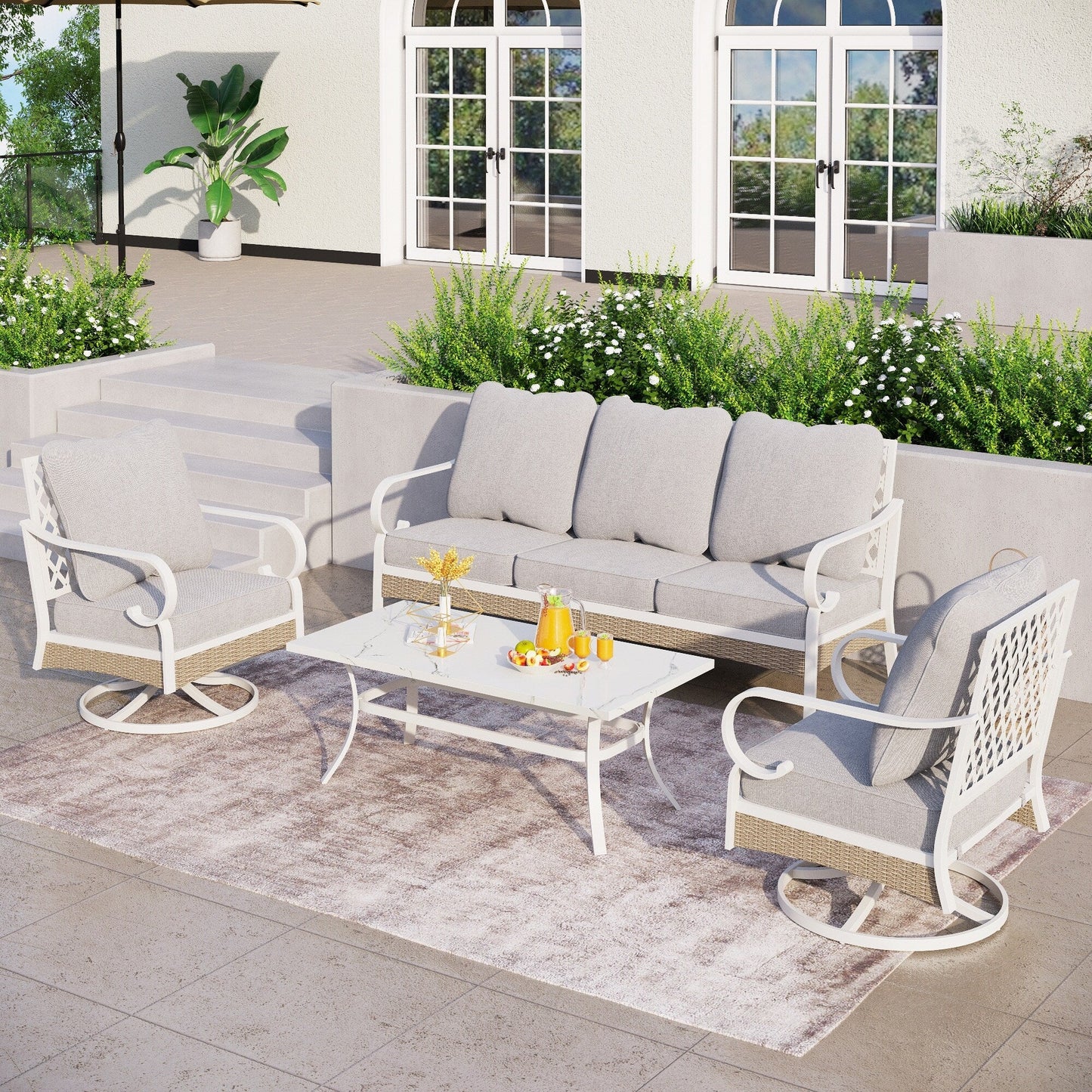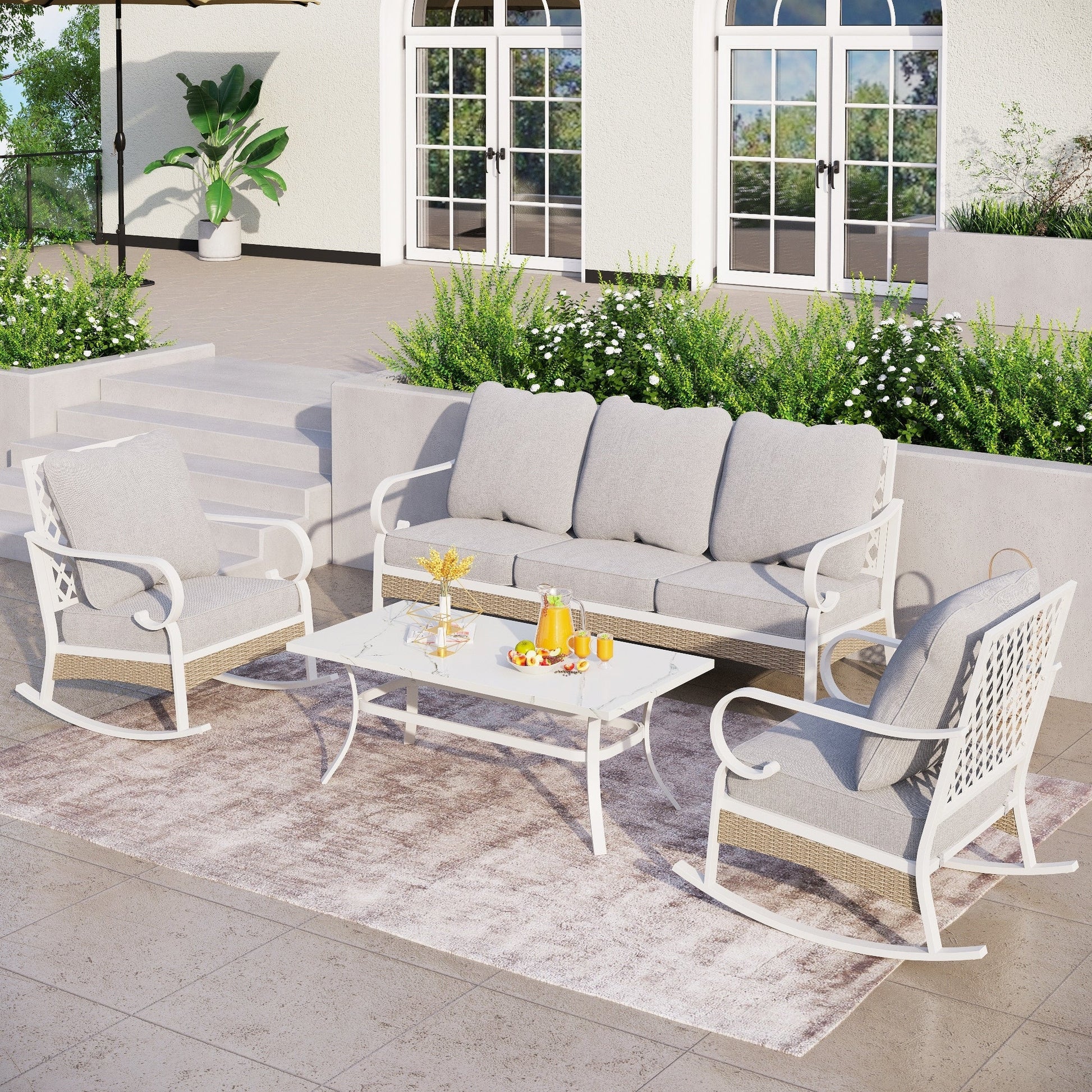 MAISON ARTS 5-Seat Patio Furniture Set, 2 x Cushioned Metal Chair, 1 x 3-Seat Sofa with Marbling Coffee Table