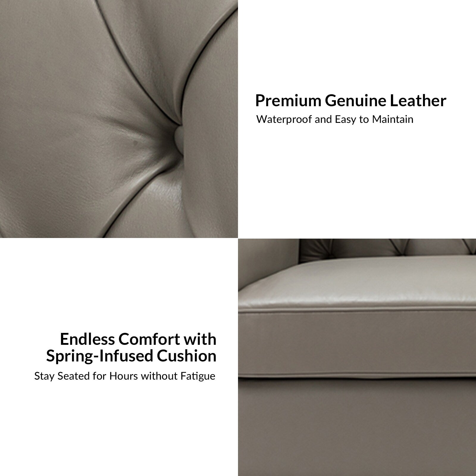 Upgrade your living space with the sophisticated and elegant Mateo Genuine Leather Sofa. Made with genuine leather in all seating areas, this sofa exudes comfort and beauty. Perfect for any room, this piece is crafted with meticulous attention to detail, featuring button tufting, sloped arms, and delicate nailhead trim. Constructed with a sturdy frame made of solid and manufactured wood and solid legs, this sofa is built to last. With its cozy and roomy seating, this sofa provides a comfortable and stylish spot to relax and unwind. Assembly is a breeze, and our shipping and after-sale service ensure your satisfaction.