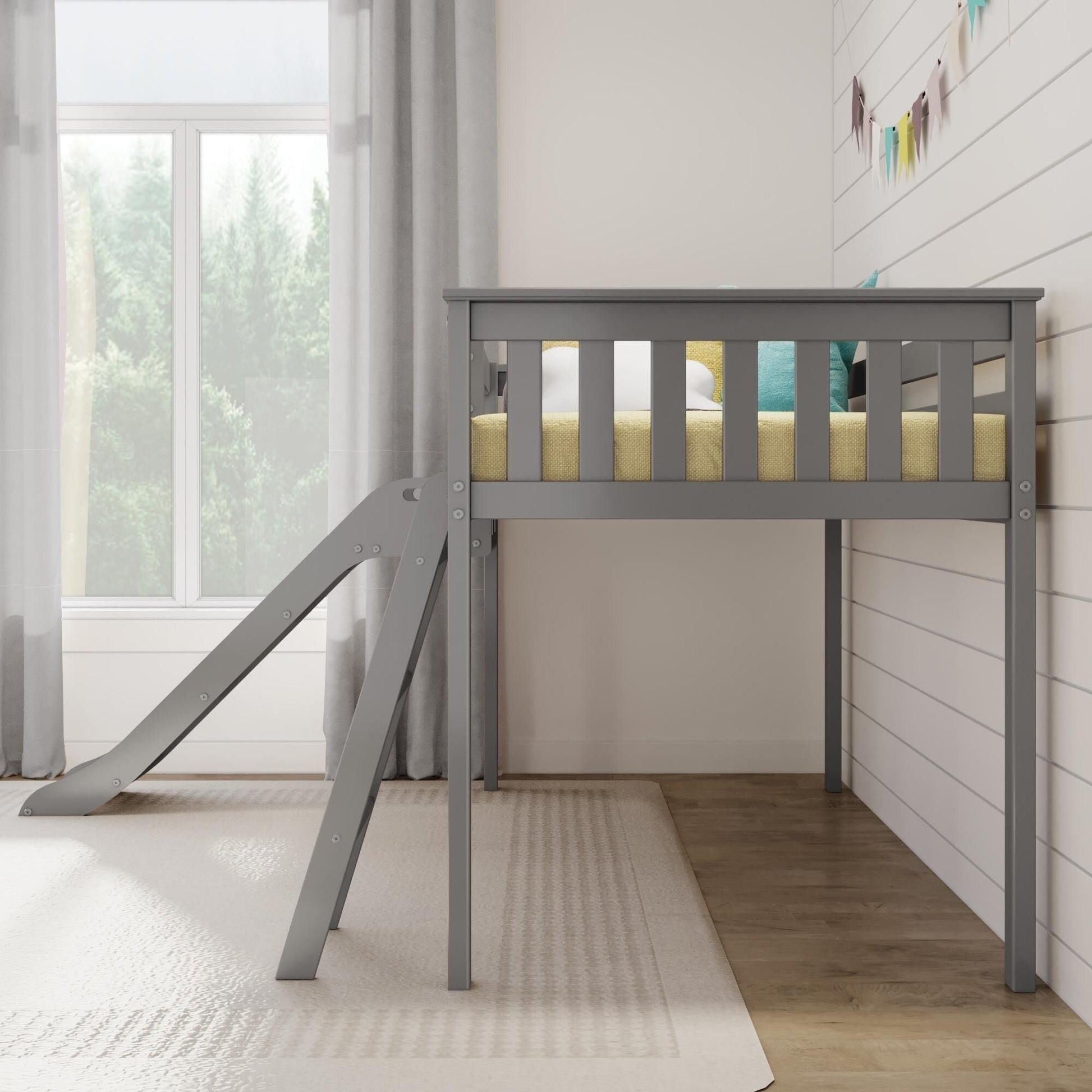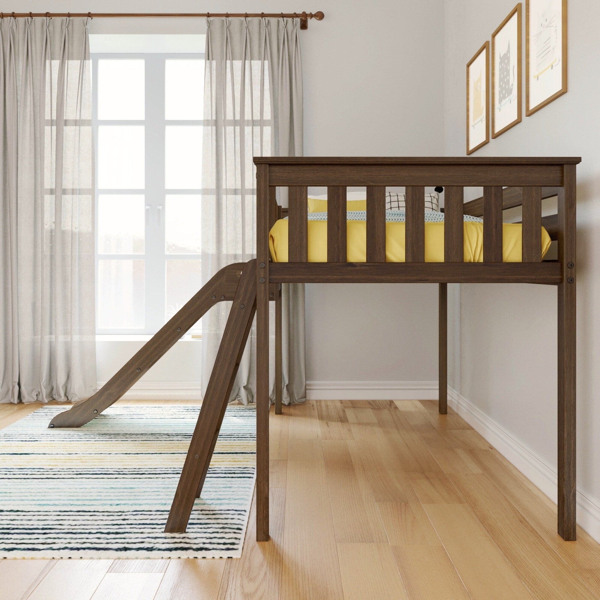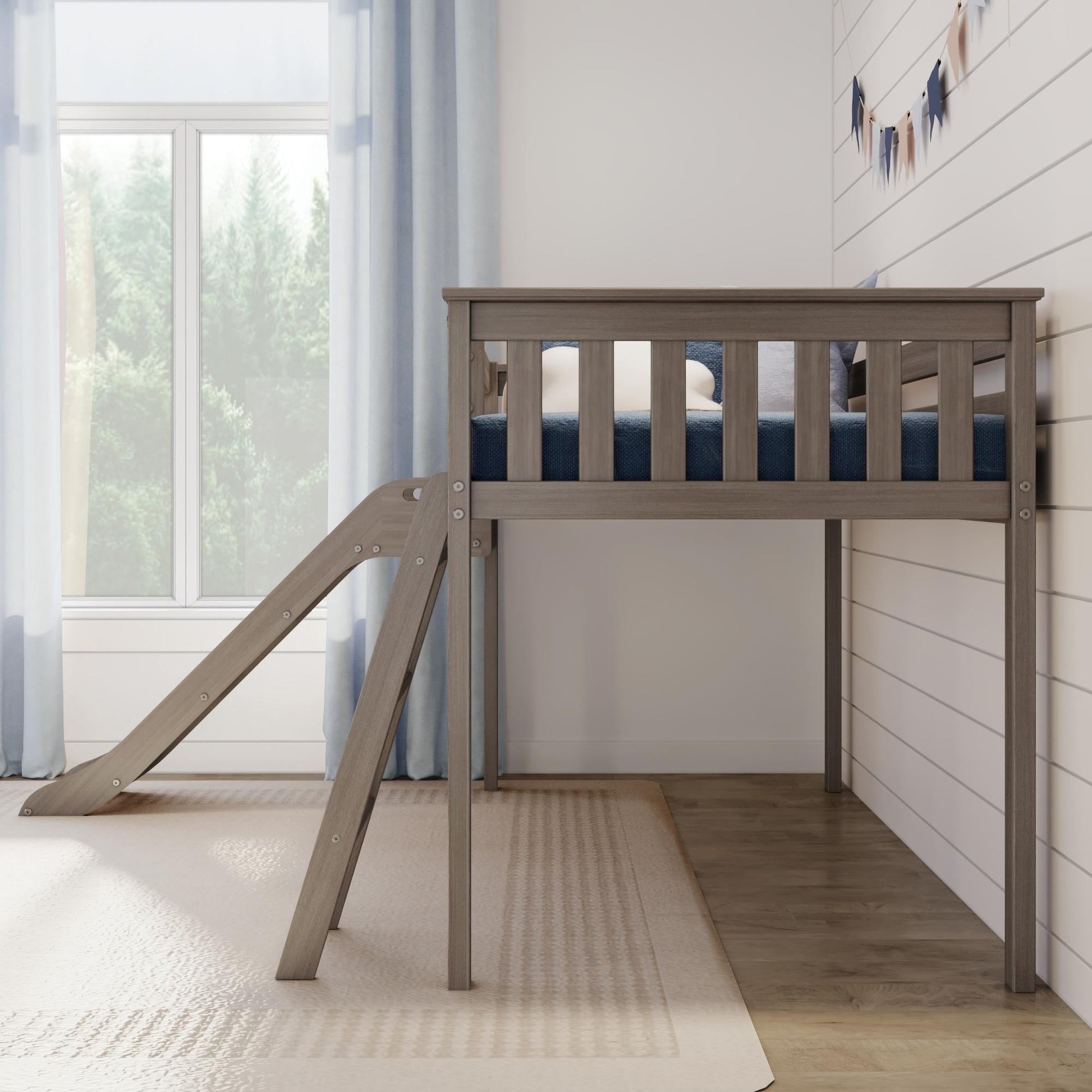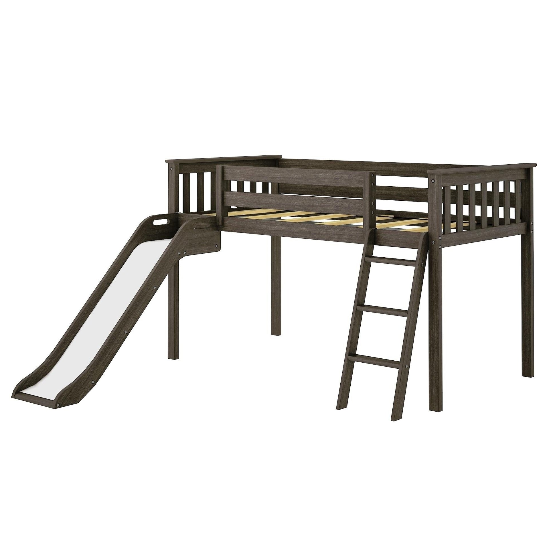 Experience the ultimate blend of functionality and joy with the Max & Lily Twin Size Low loft Bed featuring an easy slide. Designed to create a fun and space-saving environment, this loft bed guarantees an exciting haven for your children.Crafted with meticulous care from knot-free solid wood, this loft bed with slide ensures exceptional durability and stability. The use of non-toxic, low VOC finishes not only adds to its allure but also provides a healthy sleeping haven for your child.With a remarkable capacity of up to 400 lbs, this bed ensures secure support for every slumbering moment. The robust plywood slats, reinforced by a metal support bar and metal-on-metal bolt connections, ensure lasting stability and safety.The modern aesthetic is evident in the elegant slatted headboards, flush color-matched hardware, and a clean finish, elevating your child's room with a touch of contemporary charm.Setting up this loft bed with a slide is hassle-free, thanks to the included tools and instructions. Customize your room layout with versatile ladder and slide placement options, ensuring the perfect fit for your space.Slumber and play in style with the Max & Lily Low Loft Bed with easy slide, designed to meet or exceed federal safety standards for kid's furniture. This versatile loft bed with a slide bed creates a world of possibilities for your child, offering quality, safety, and endless entertainment.