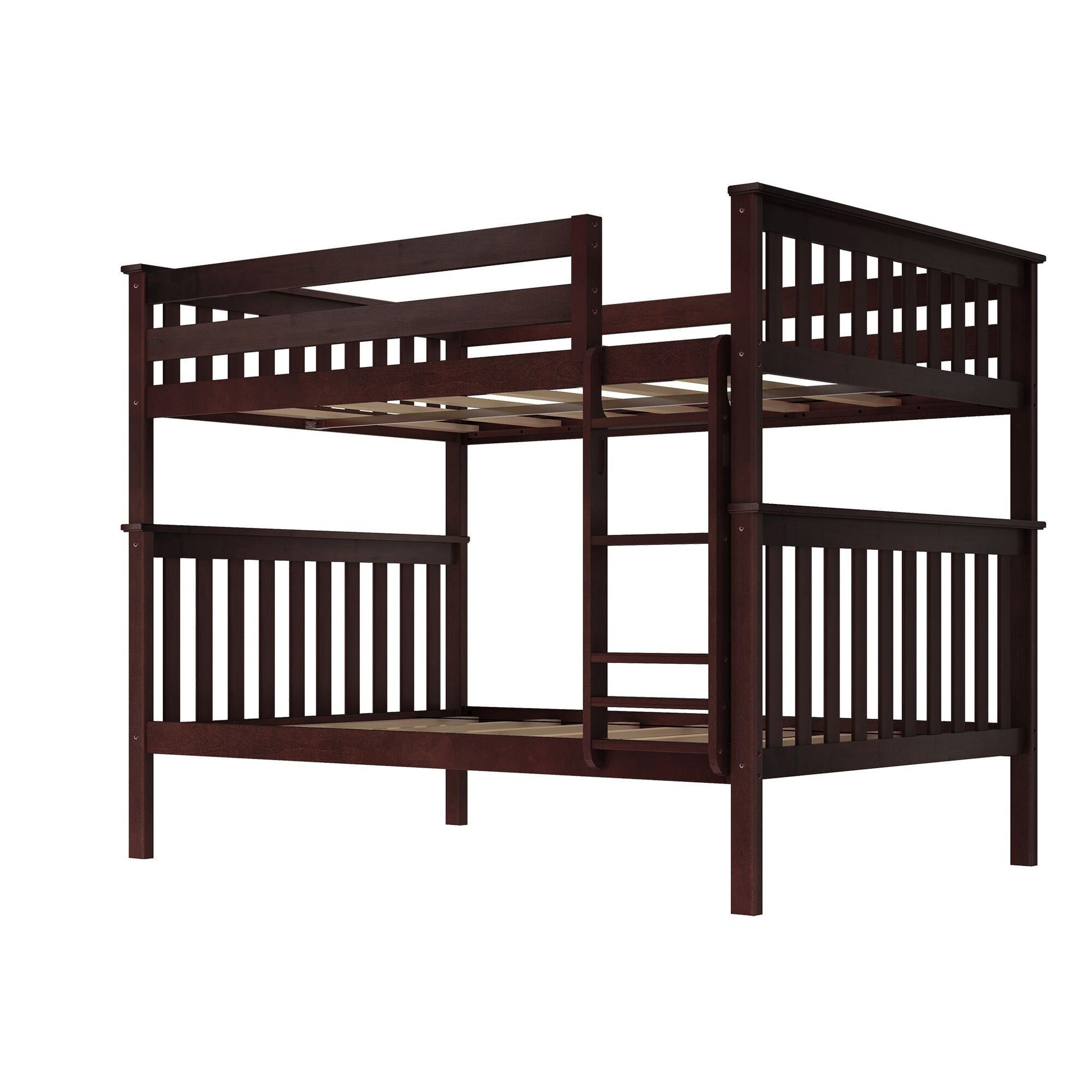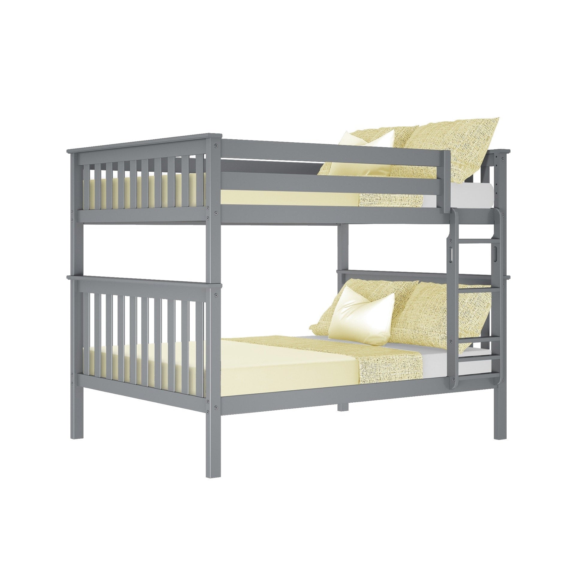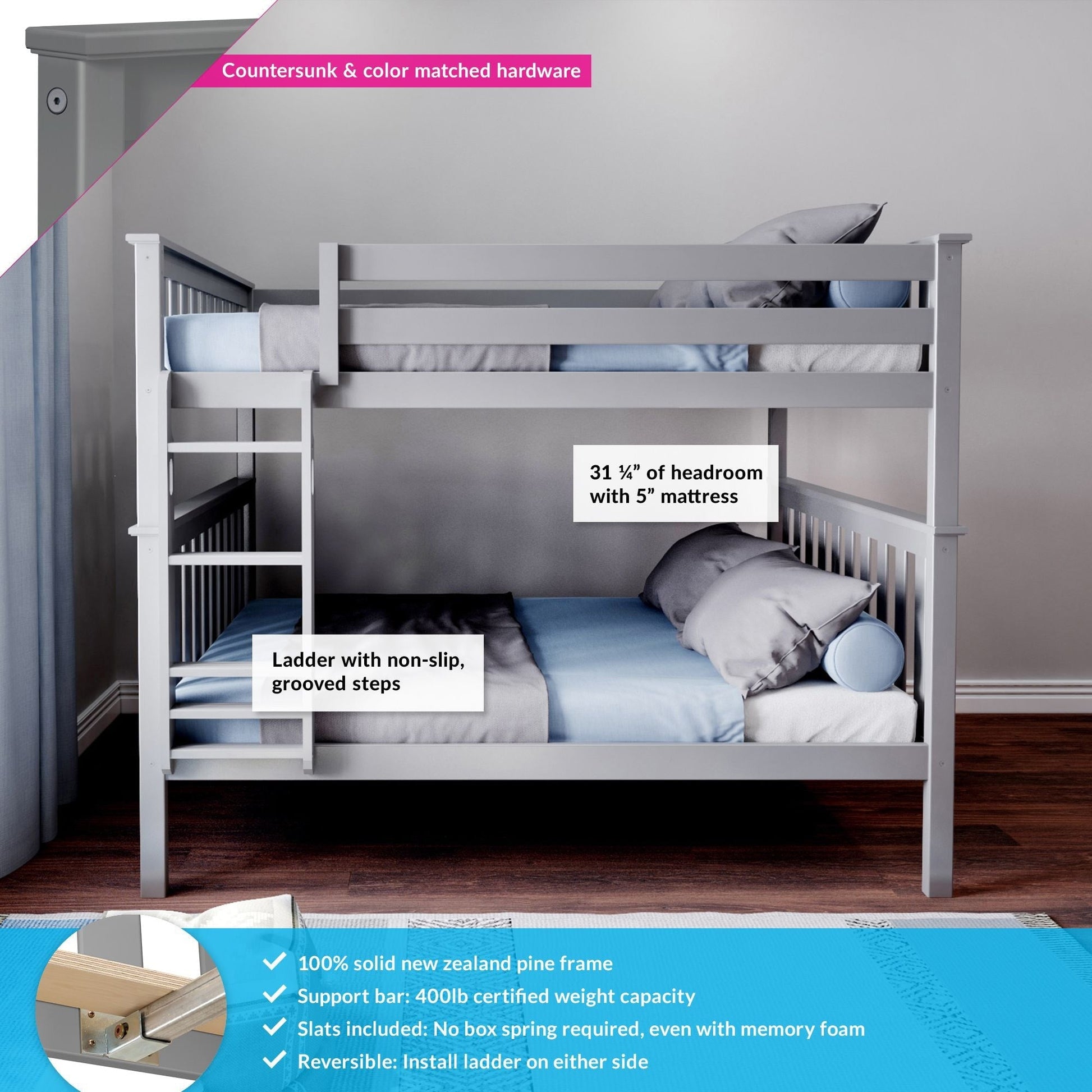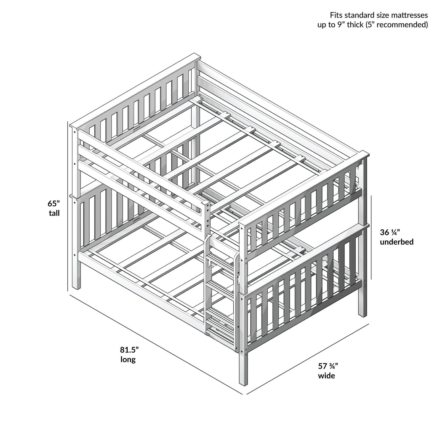 Plenty of room for sleep and play? Now that’s a win-win! The Max & Lily Full Over Full Bunk Bed is the perfect combination of functional and fun that both kids and parents love. Top bunk features tall 14” guardrails, so the bed safely fits standard mattress sizes. Angled ladder with rounded edges offers comfortable, easy climbing. Added bonus - ladder is both reversible and removable, so it is flexible to work with any space. Solid, knot-free New Zealand pine wood adds strength and stability. All Max & Lily products use a durable, low VOC finish. The slatted head and footboards and flush, color-matched hardware give this bunk bed a clean, modern look. Instructions, upper/lower slat rolls, and required hardware are included. With solid plywood slats and a metal support bar for the top bunk, each sleeping surface can support 400 pounds of resting weight. This bed meets or exceeds Federal safety standards for kids furniture. When it’s time for play, this bunk bed’s space saving design frees up plenty of floor space by stacking two sleeping surfaces. Add storage drawers or trundle to make this bed even more functional. 2+ adults make assembly simple and easy. This bunk bed is compatible with standard full size mattresses between 5 and 8 inches thick. No box spring or bunkie board is required for this bed. The Full Over Full Bunk Bed from Max & Lily offers exceptional quality and affordability that kids and their parents will enjoy for years to come. Max & Lily is a member of the Maxwood family of brands - the kids furniture experts bringing a tradition of superior quality, safety and fun!