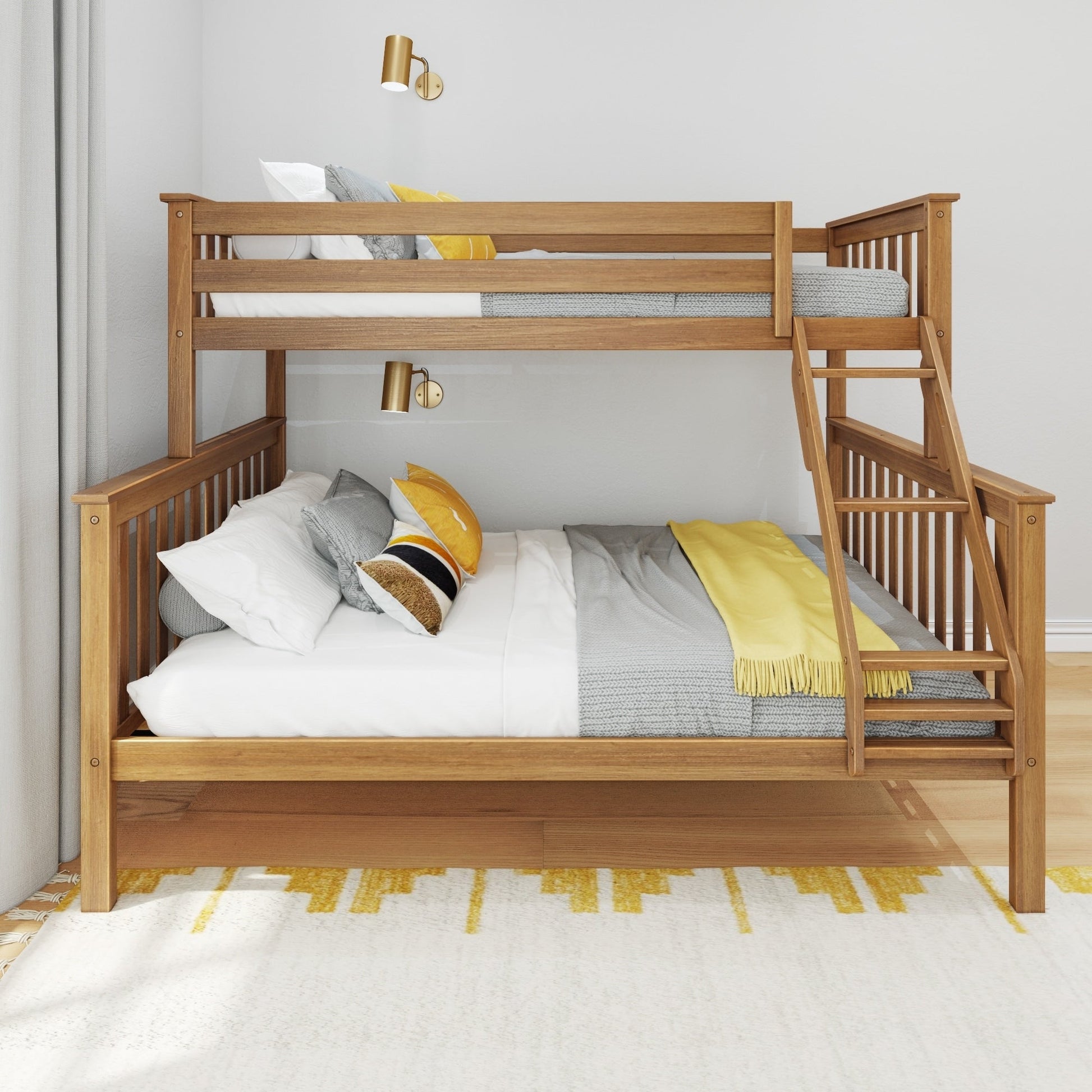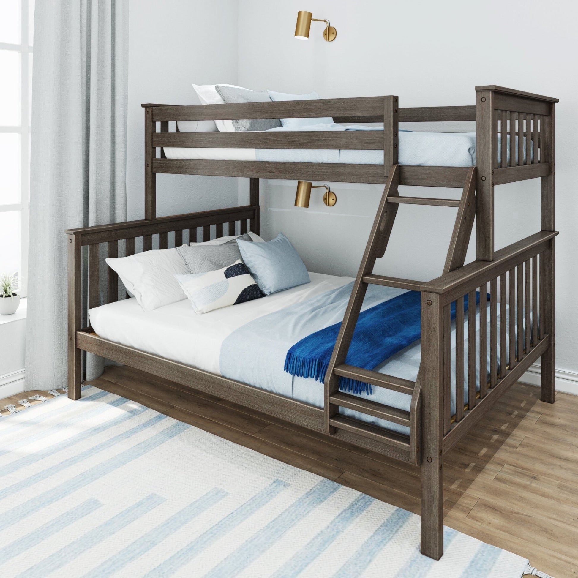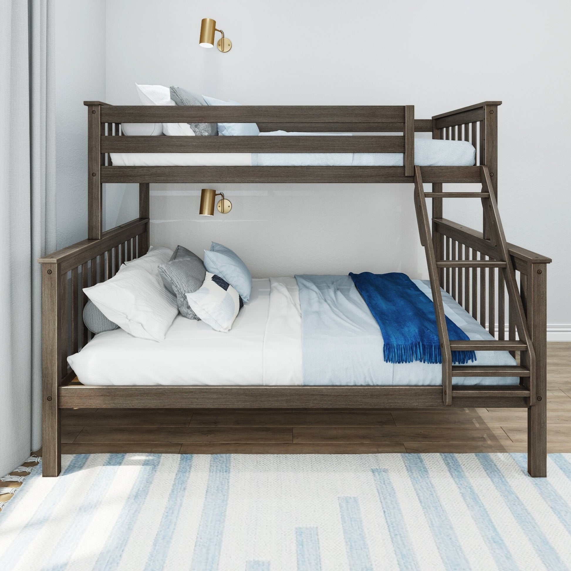 The Max & Lily Twin XL over Queen Bunk Bed perfectly combines fun and function for a design that both kids and parents love. The knot-free, solid wood bunk bed frame adds superior strength and stability. This twin XL over queen bunk bed for kids used a durable, low VOC finish that is ideal for your clean and healthy kid’s room. The bunk bed features tall, 14-inch guard rails, so the bunk bed safely fits standard mattress sizes up to 8 inches thick. A ladder with rounded edges offers comfortable, easy climbing. The versatile ladder can attach on either side of the bunk bed to fit your room perfectly. A queen size bed on the bottom and twin XL size bed on the top give plenty of room for growing kids to stretch out and read or sleep. The slatted headboards and footboards and flush, color-matched hardware create a clean, modern look. With solid plywood slats and a metal support bar, each sleeping surface can support 400 lbs. of resting weight. This bunk bed twin XL over queen includes easy-to-read instructions, hardware and all the tools you need for a quick setup. 2+ adults are recommended for assembling the bunk bed. This bunk bed is compatible with standard twin XL and queen size mattresses between 5 and 8 inches thick. No box spring or bunkie board is required for this bed. This kids bunk bed meets or exceeds Federal safety standards for kid’s furniture. The Twin XL over Queen Bunk Bed from Max & Lily offers exceptional quality and affordability that kids and their parents will enjoy for years to come. Max & Lily is a member of the Maxwood family of brands – the kids furniture experts brining a tradition of superior quality, safety and fun!