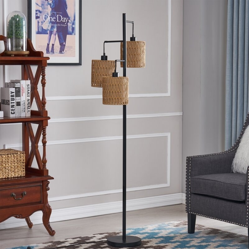 Bring a coastal vibe to your living room or bedroom with the Maxax 65' Tree Floor Lamp. With a sleek pole and three straight arms, this lamp features three drum-shaped lamp shades with woven rattan exteriors that diffuse warm light from standard 60W bulbs. Perfect for relaxation, reading, or adding extra illumination to any space. The cord and foot switch make it easy to turn on and off. Bulbs are not included.