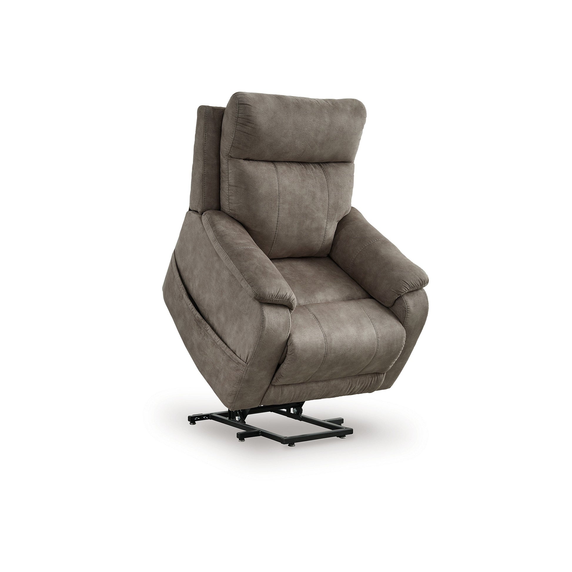 Enjoy unmatched comfort with this power lift recliner chair, featuring heat and massage settings for relaxation. Dual motors allow independent control of the footrest and back while the power lift smoothly transitions you to standing. Upholstered in gray faux suede leather, it offers a modern aesthetic with practical side pocket storage and USB charging. Explore our Mead collection for more.