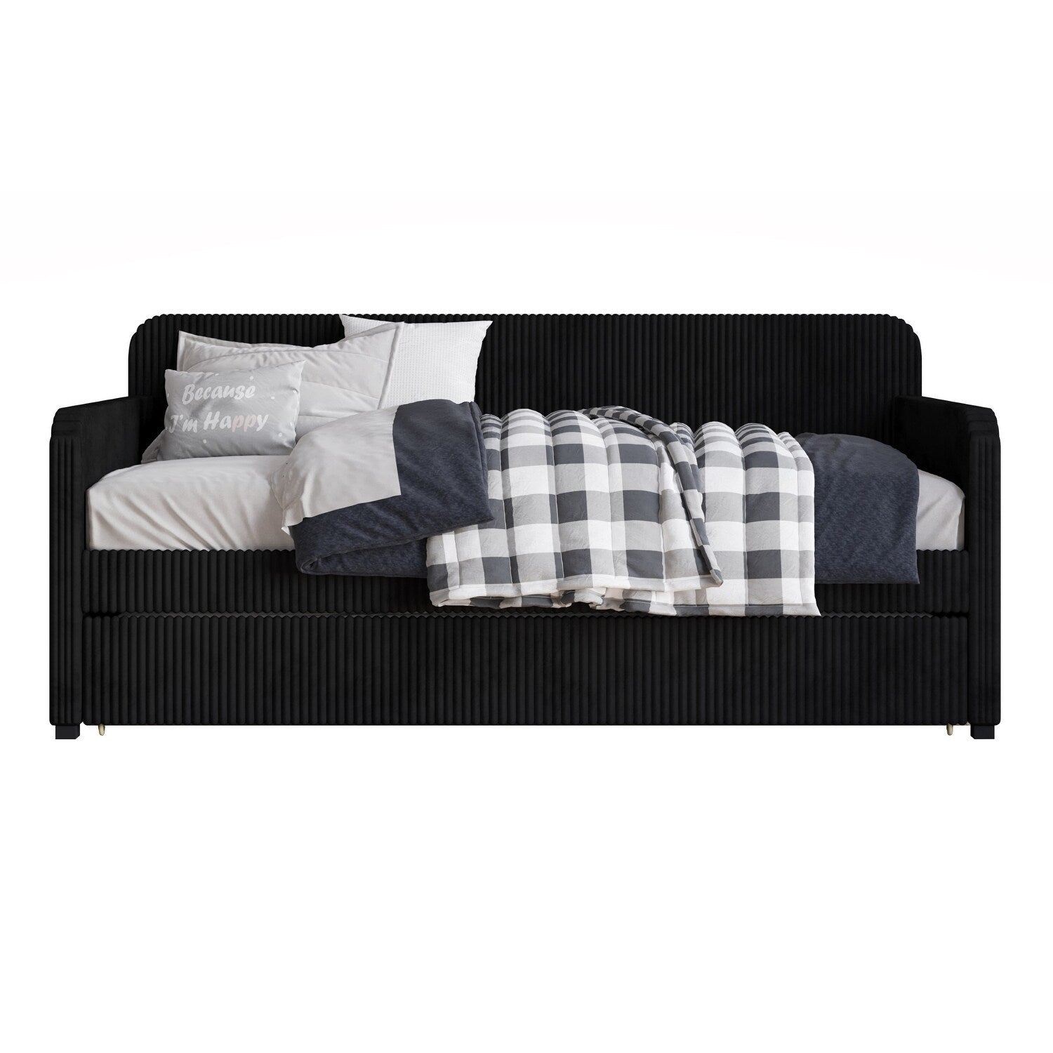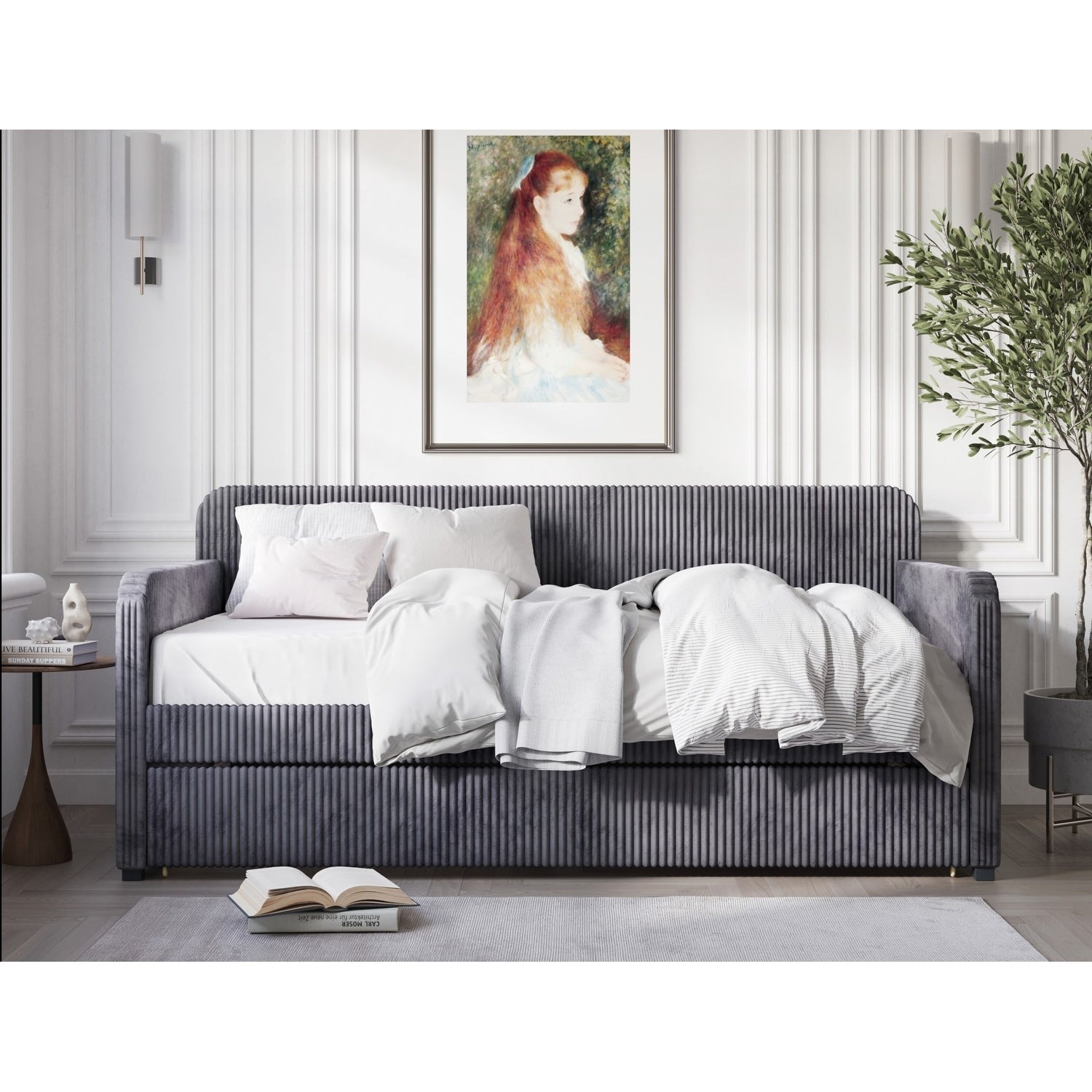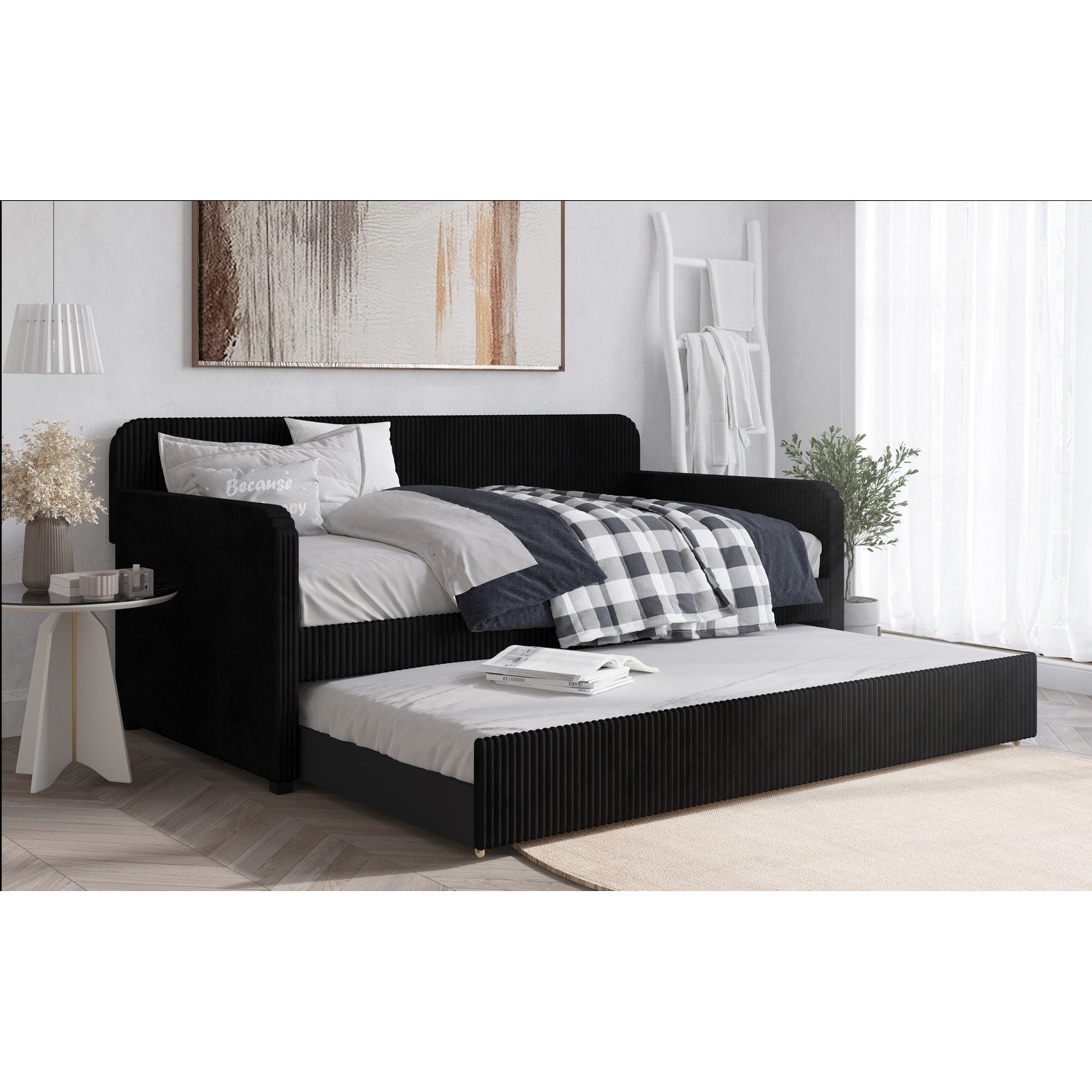 Create a cozy and functional space with our Melissa Twin Upholstered Daybed with Trundle. Upholstered in luxurious velvet with elegant vertically-stitched tufting, this daybed is a versatile piece that maximizes your space by providing extra sleeping space for guests. The trundle accommodates two twin mattresses, making it perfect for small living rooms, reading rooms, guest rooms, or even offices. Available in three colors - gray, blue, and black - our daybed is easy to assemble and will be shipped in two boxes.