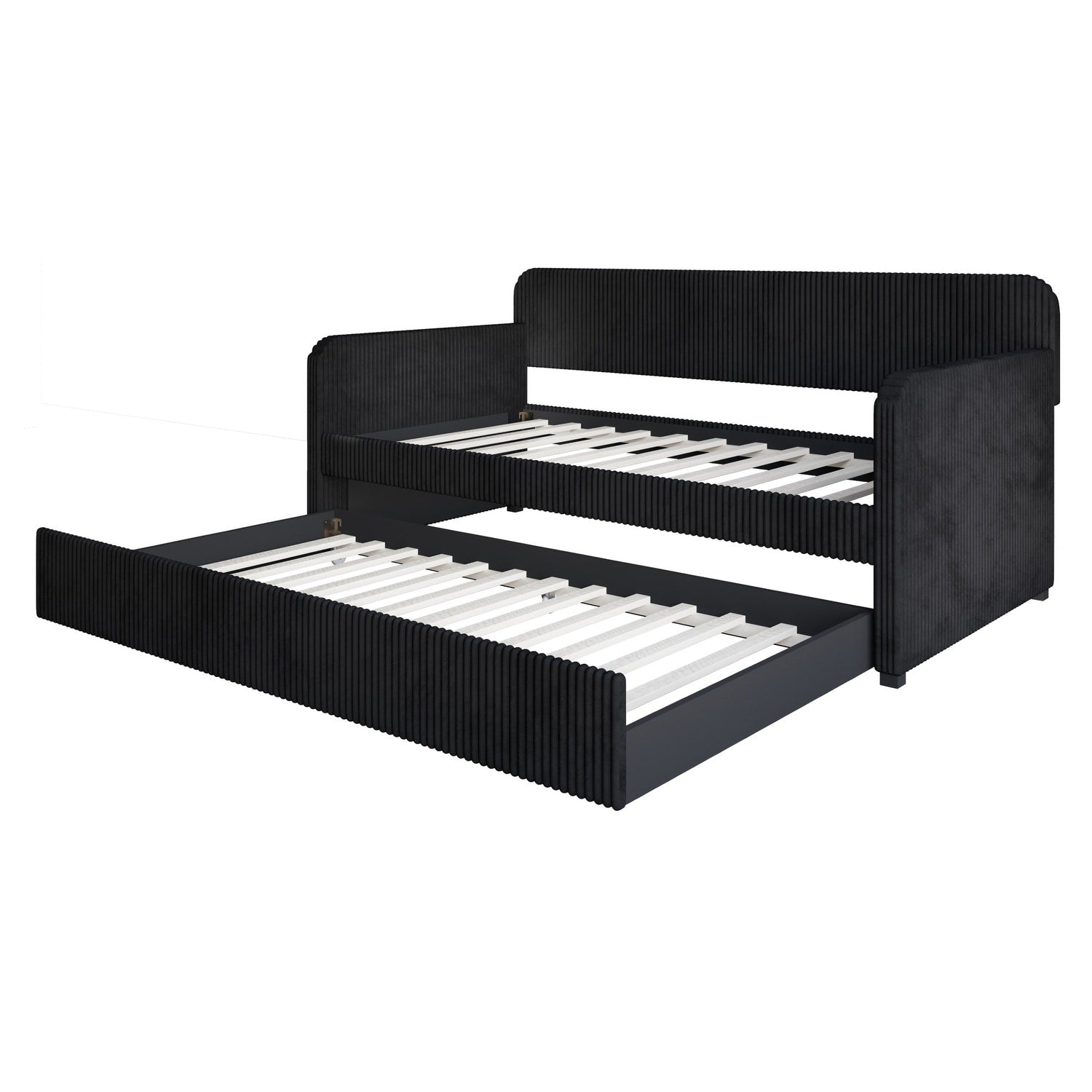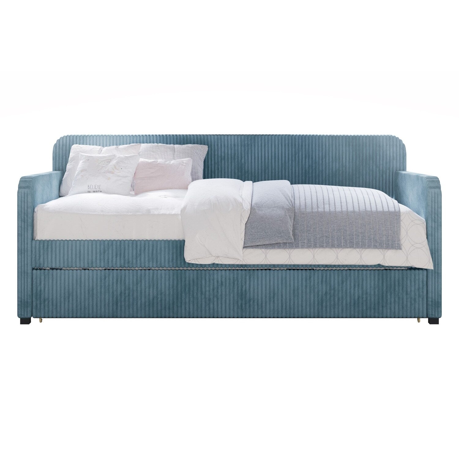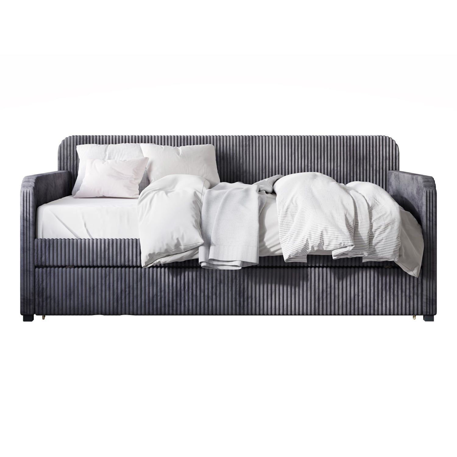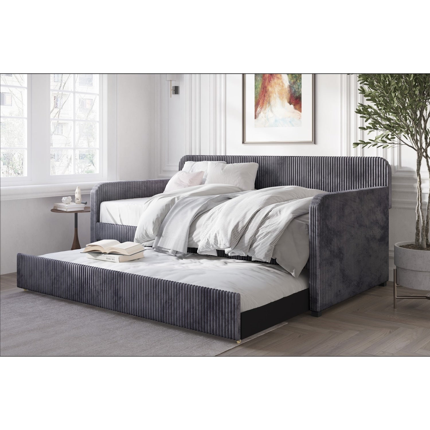 Create a cozy and functional space with our Melissa Twin Upholstered Daybed with Trundle. Upholstered in luxurious velvet with elegant vertically-stitched tufting, this daybed is a versatile piece that maximizes your space by providing extra sleeping space for guests. The trundle accommodates two twin mattresses, making it perfect for small living rooms, reading rooms, guest rooms, or even offices. Available in three colors - gray, blue, and black - our daybed is easy to assemble and will be shipped in two boxes.