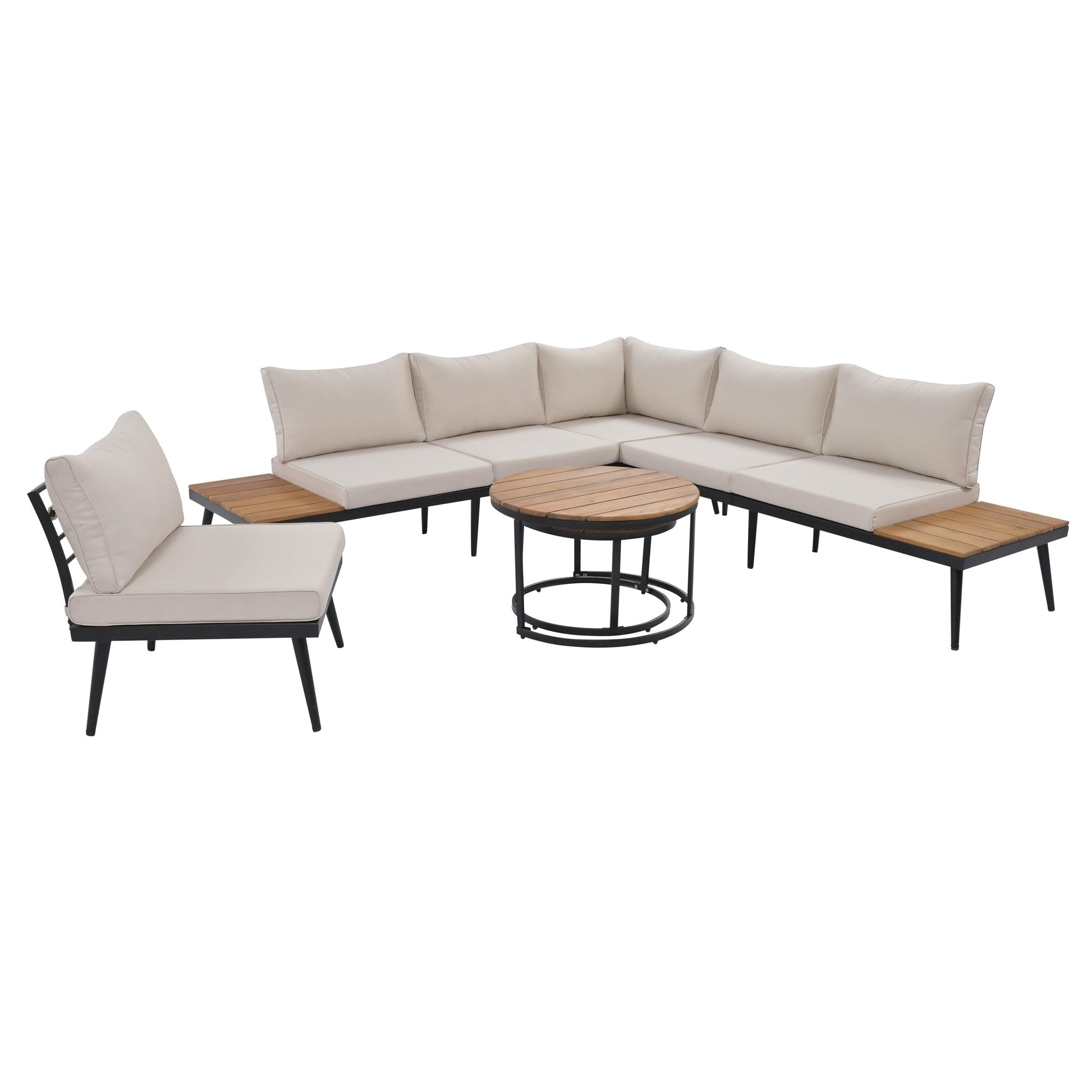 - Charming Modern Style] Soft sofa set and a sophisticated wooden coffee table add a functional and stylish element to your patio. The color of acacia wood is paired with gray or beige upholstery. The striped wooden table top also brings a natural and rustic feel. This modern patio sectional sofa set creates a strong summer atmosphere. It will become a great decoration that suits your outdoor style.