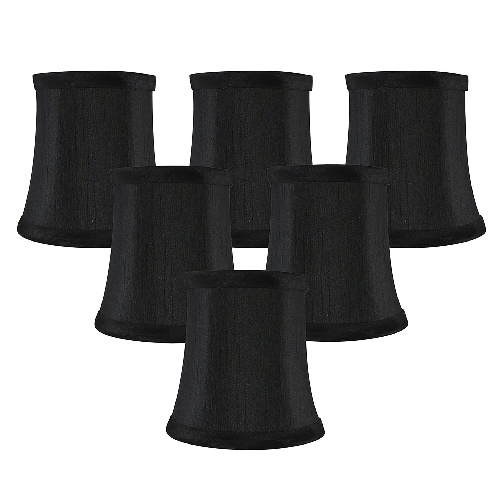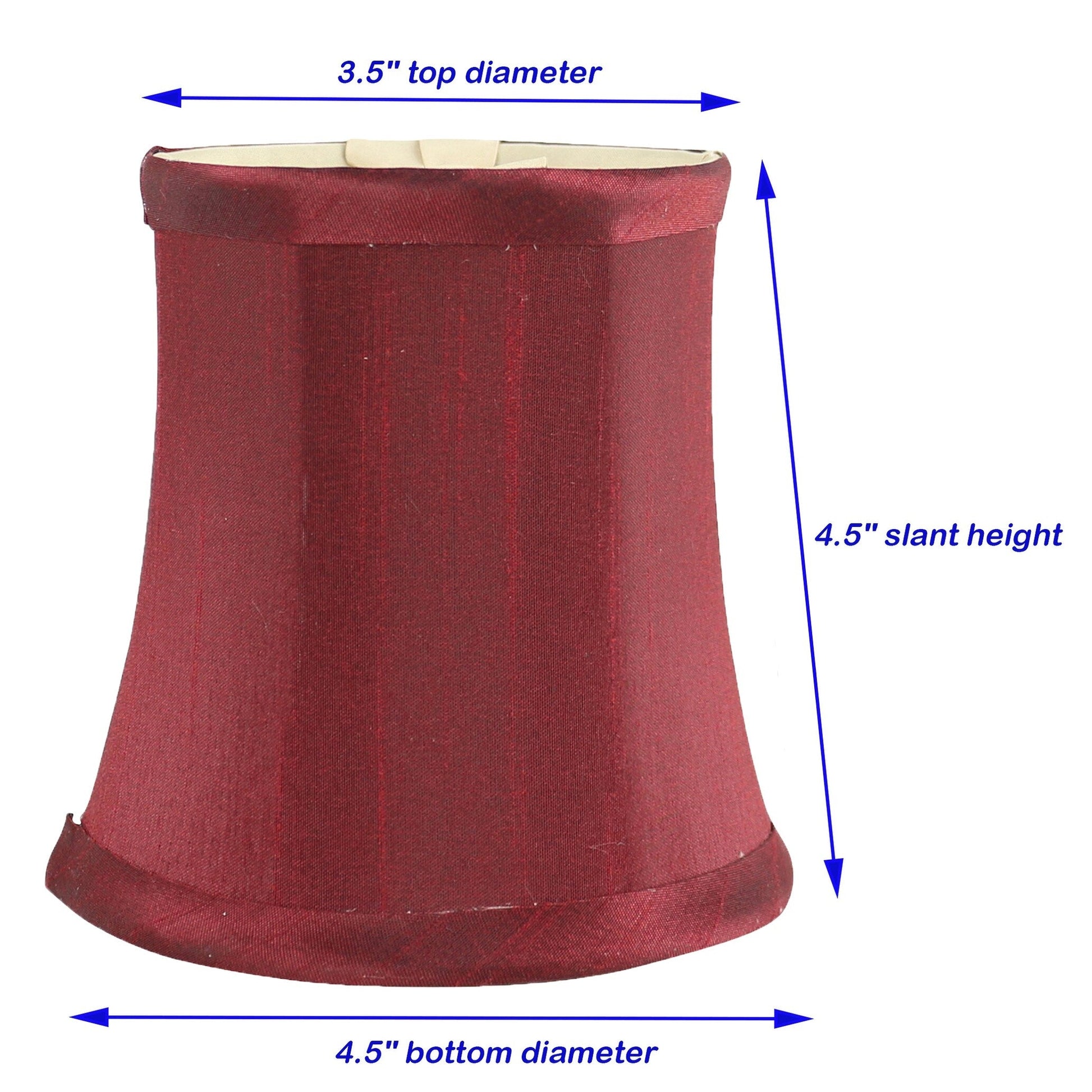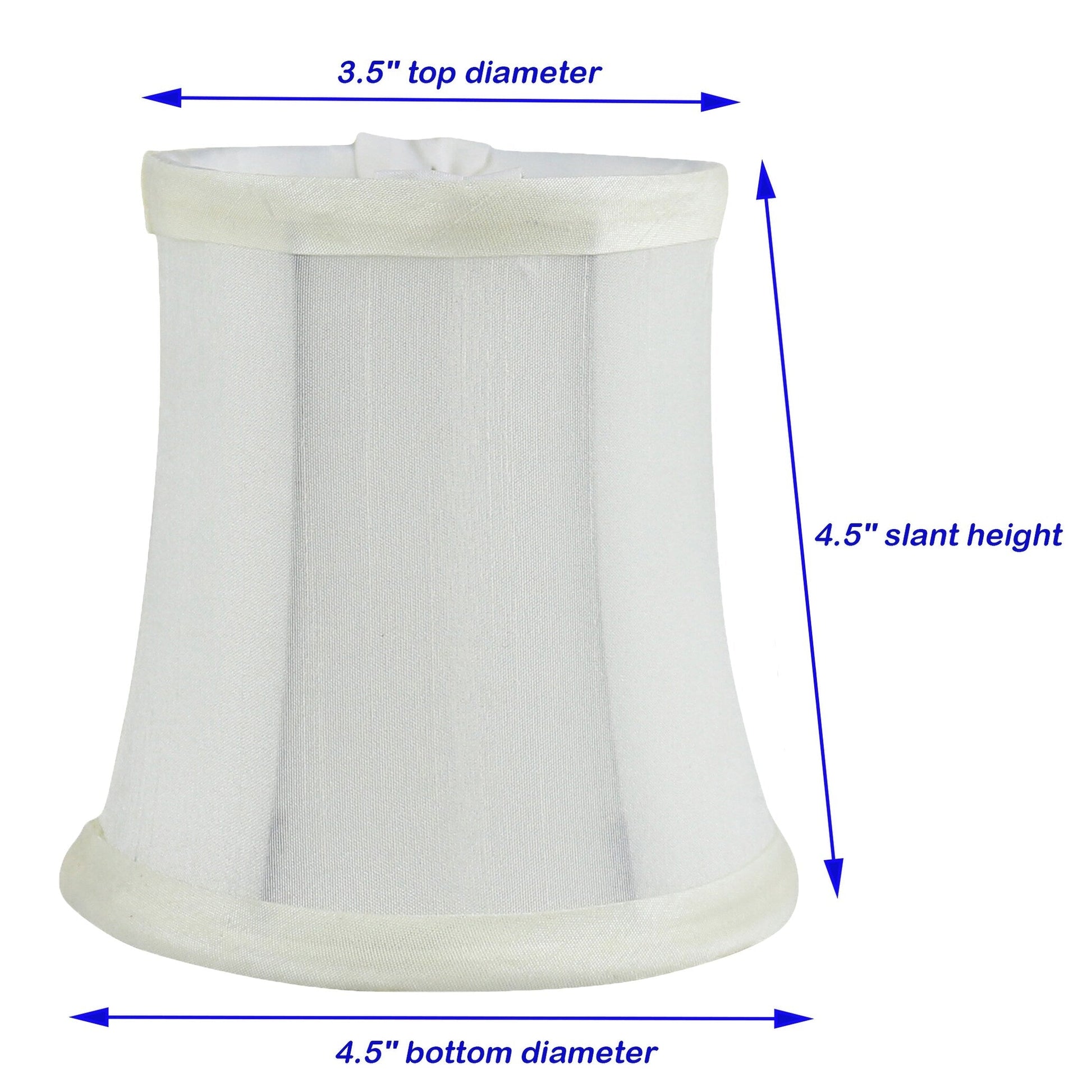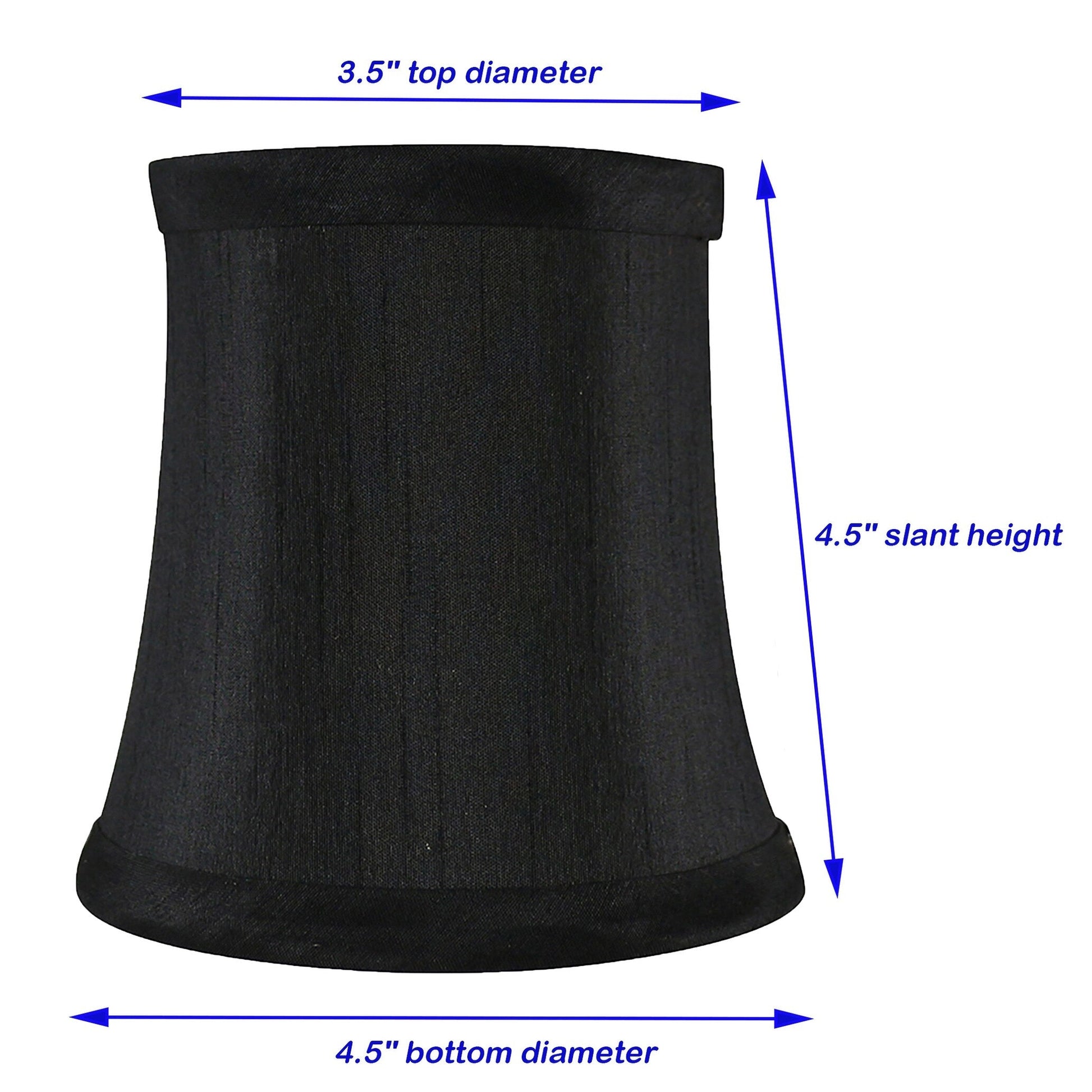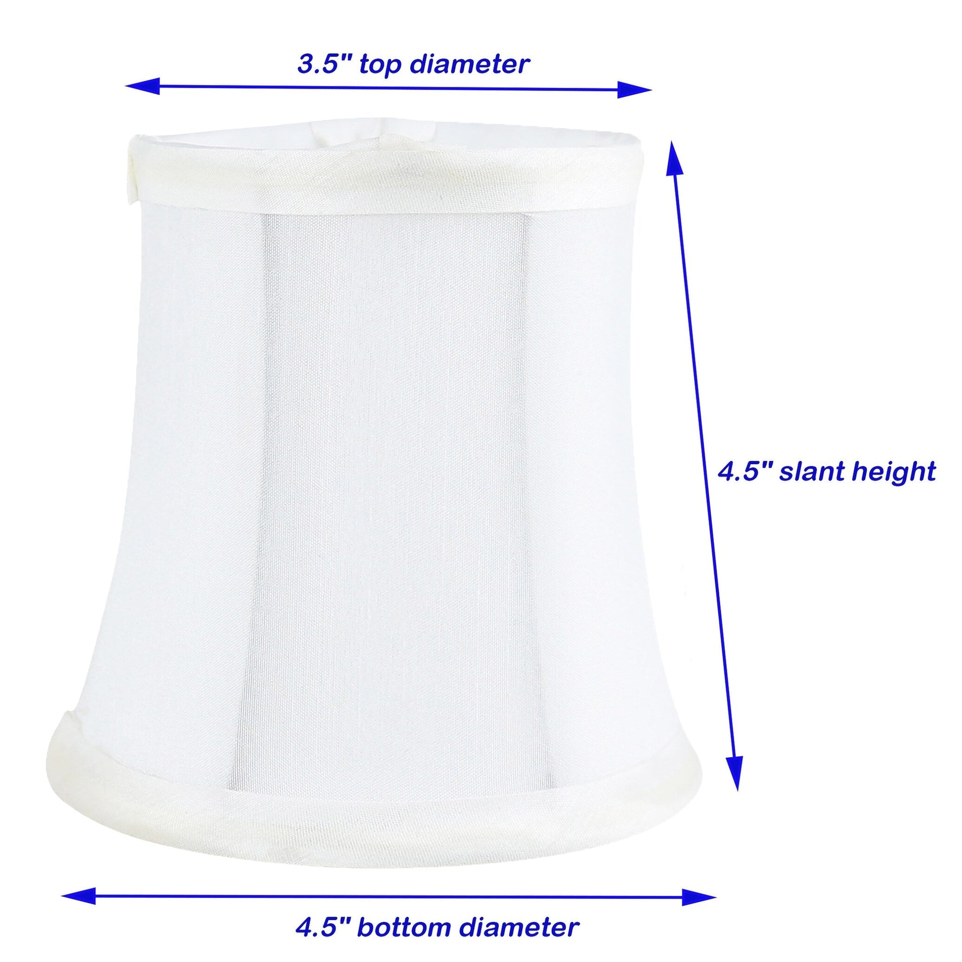SHADES DIMENSIONS: 3' top diameter, 4.5' bottom diameter, and 4.5' height.FABRIC: Faux silk.SoftbackFITTER: Clip-on fitter designed to fit teardrop or torpedo candelabra bulbs.NOT for standard regular light bulbs.SUGGESTED MAXIMUM WATTAGE: 40 watts.