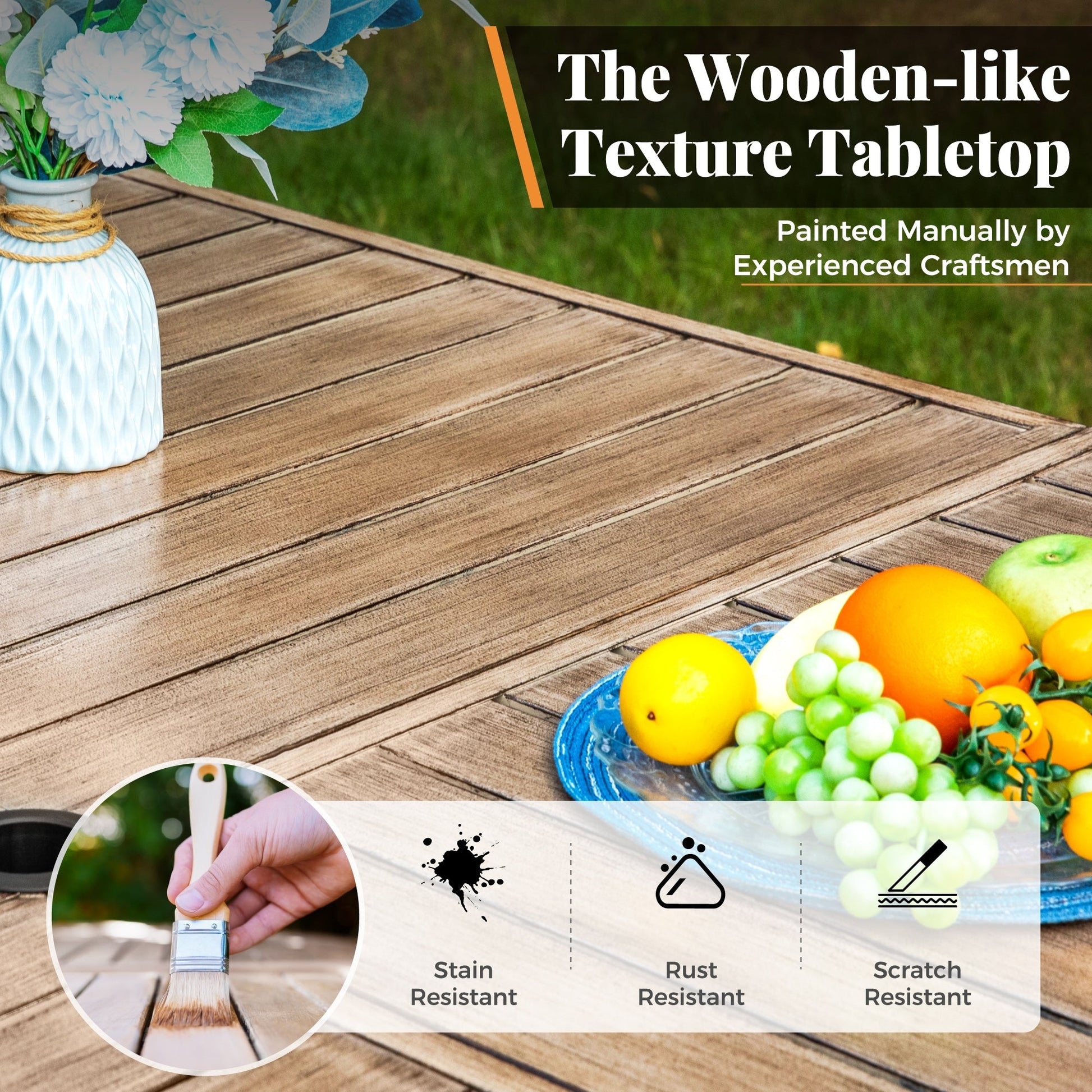 Spacious & Elegant Design: The 60'L x 60'W x 29'H square table provides ample space for dining or leisure, comfortably seating up to 8 people. Its rustic brown metal slatted tabletop adds a touch of elegance to any patio while allowing easy cleaning and water drainage.