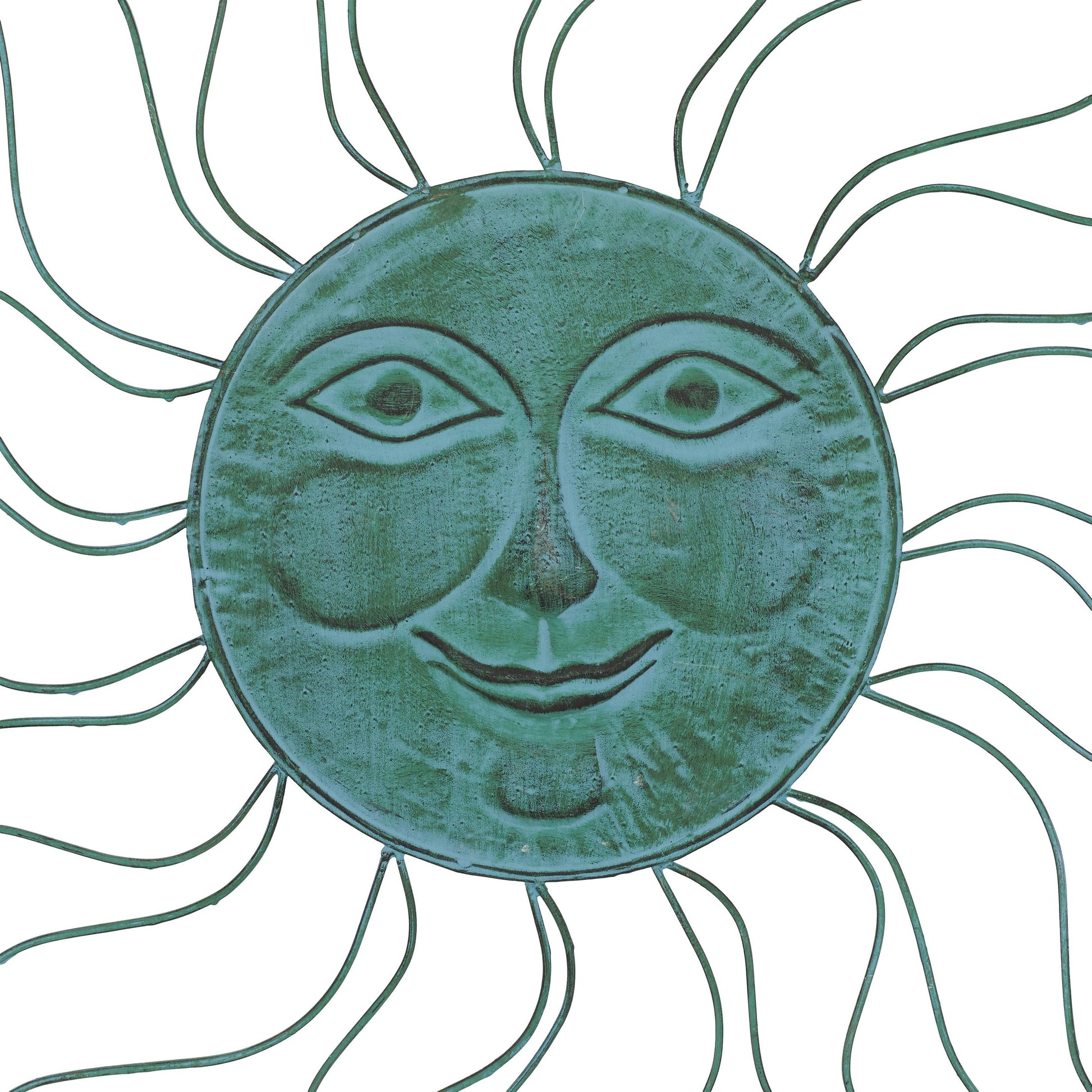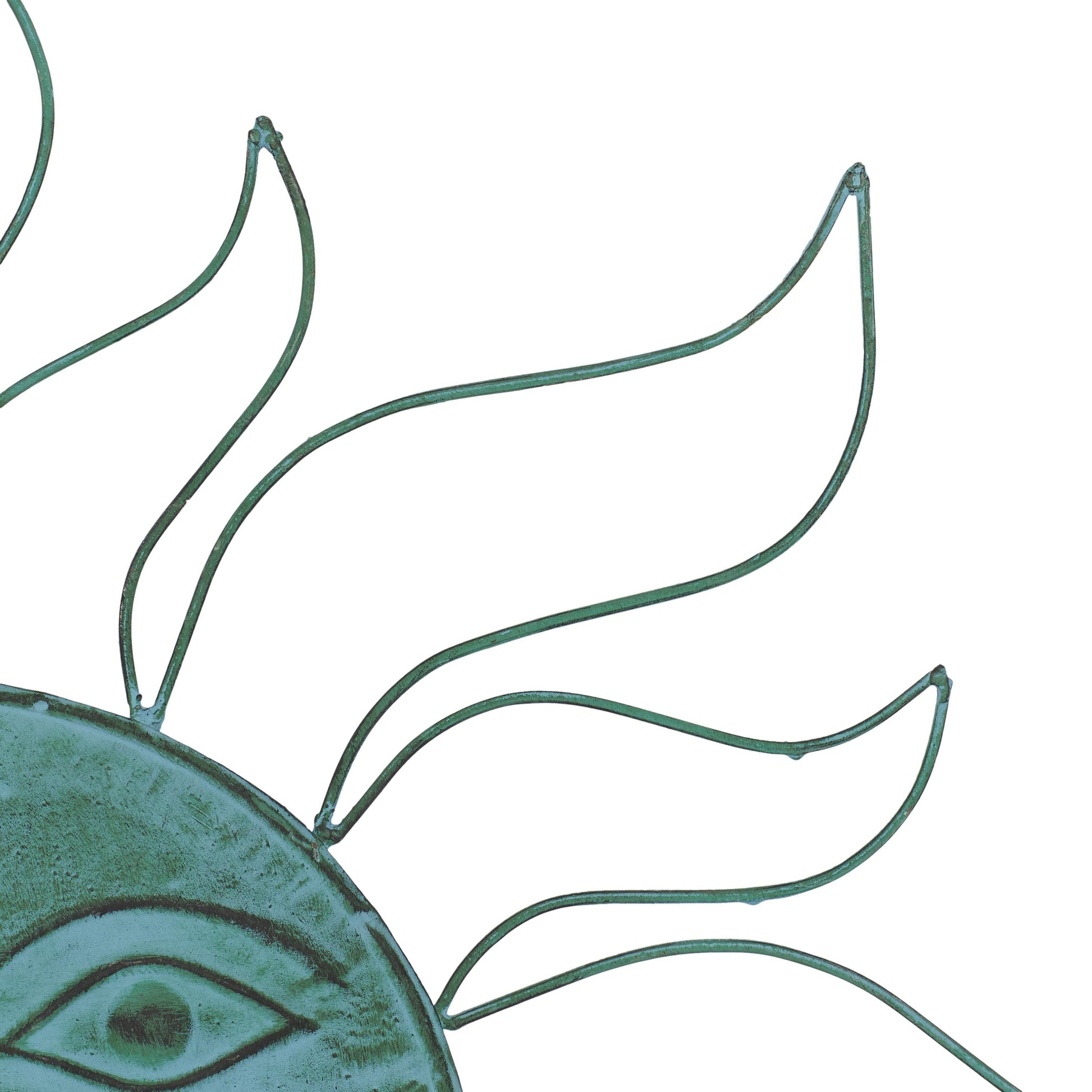 Transform any blank wall into a captivating focal point with this sun wall sculpture, adding both texture and depth to your home decor. Perfect for living rooms and bedrooms, this piece infuses life and dimension into any space. Shipped in a single carton, this iron wall art makes an excellent gift for any occasion. Easily hang it vertically using the built-in hooks; please note that nails and screws are not included. Versatile enough for indoor or outdoor display, though it is not rust or weather resistant. This item arrives fully assembled in one piece. Crafted in India, this unique teal-colored wall sculpture embodies an eclectic style.