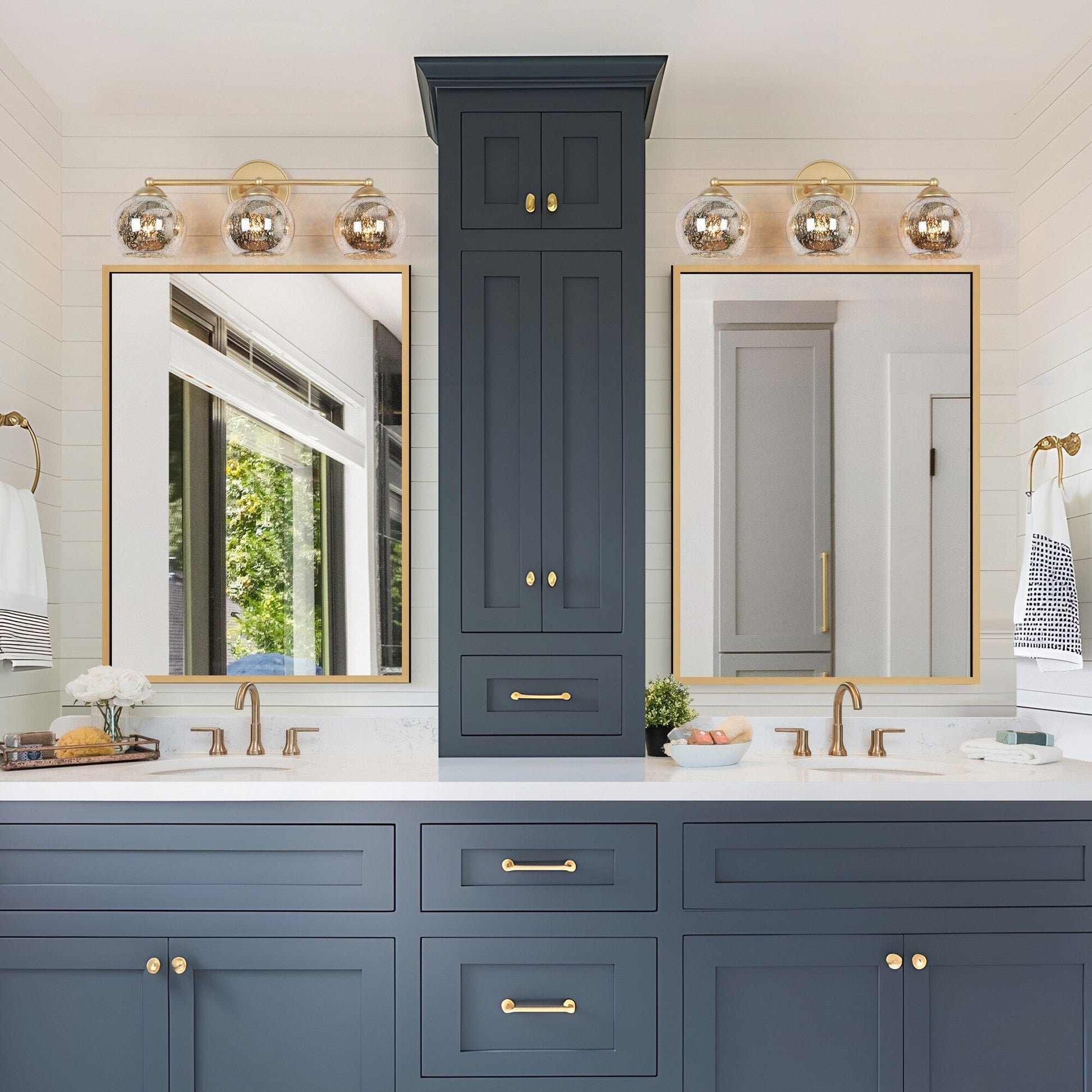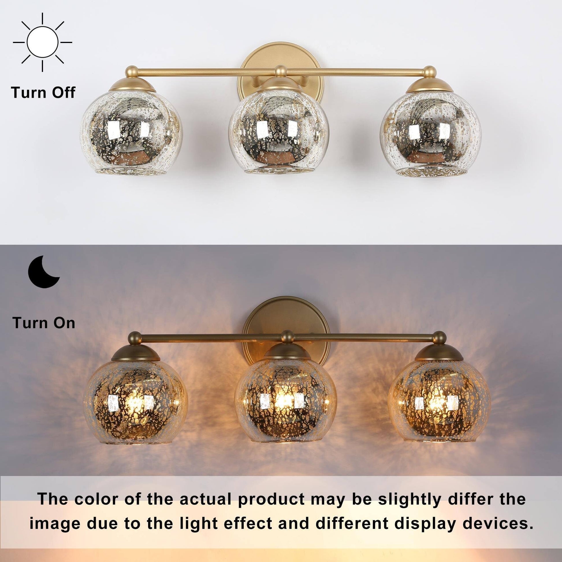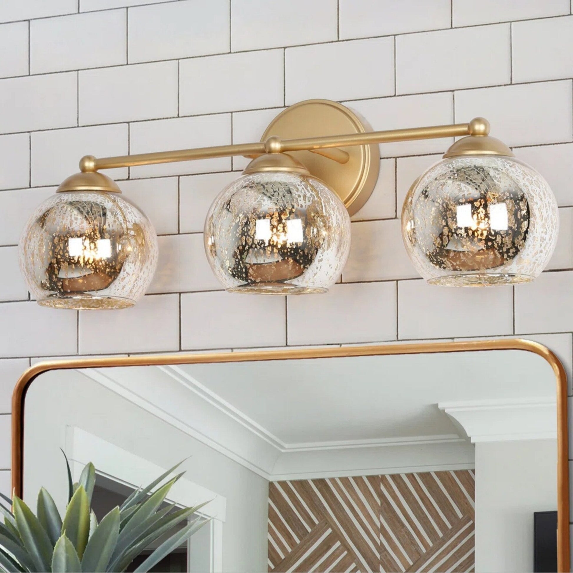 Transform your bathroom into a luxurious retreat with this exquisite 3-light gold vanity fixture. The design features stunning mercury-polished glass shades that emit a warm and charming glow, creating a captivating visual contrast. The sleek, modern appeal is enhanced by its crafted metal construction, featuring a round backplate and a straight, balanced arm that effortlessly supports the lights.