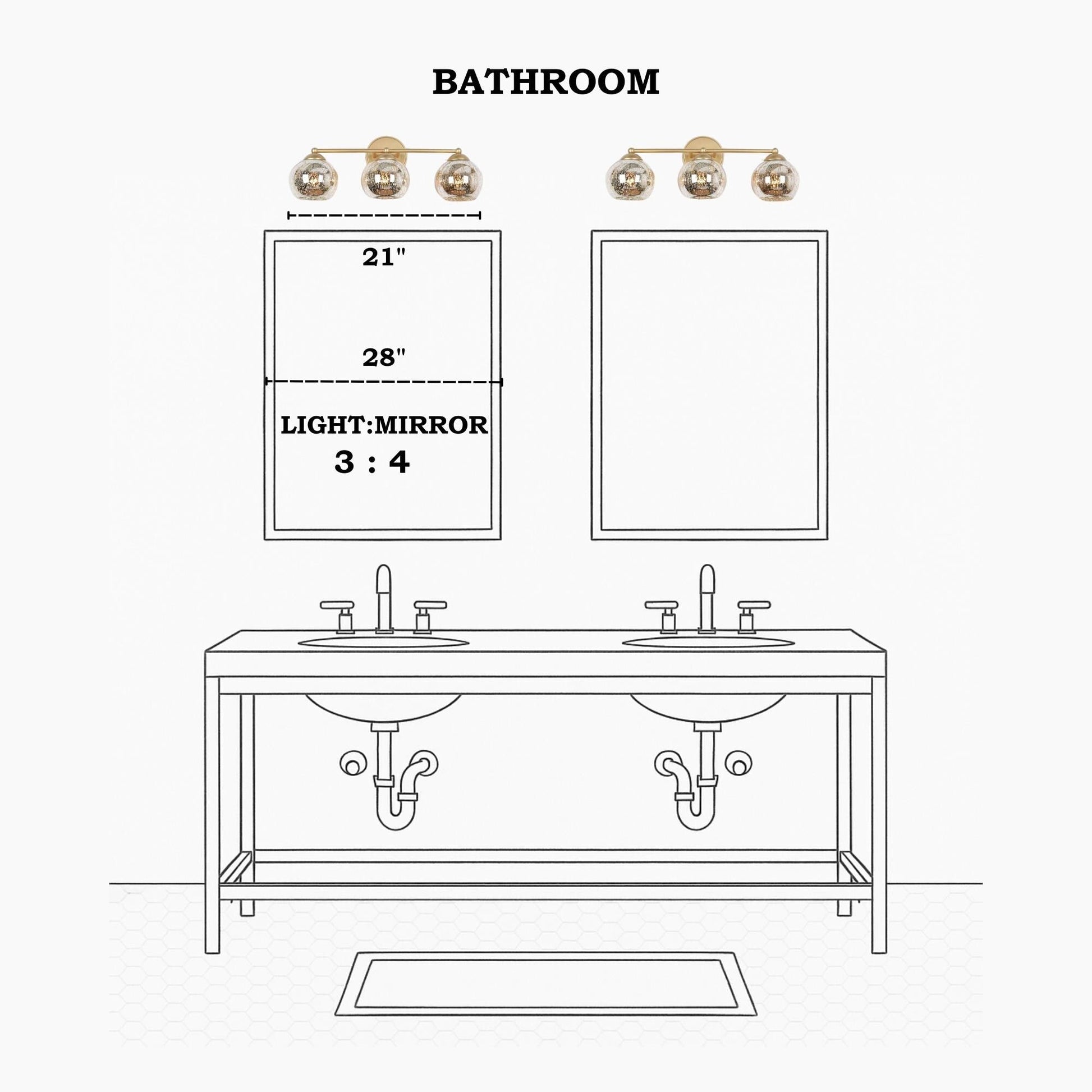 Mid-Century Modern Glam Gold Bathroom Vanity Light 3-Light Wall Lamp with Mercury Glass - 21 L x 7 W x 8 H