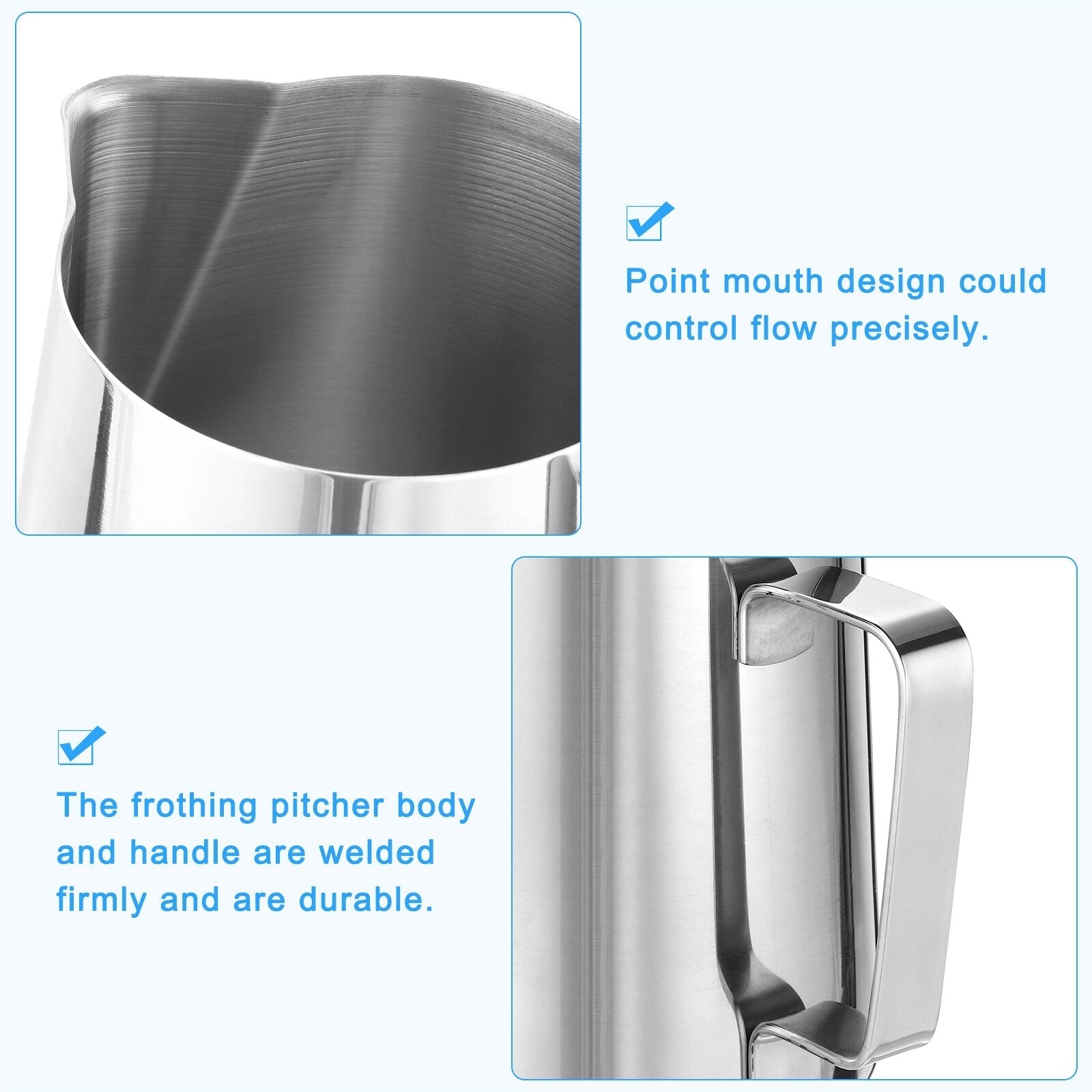 [Design] The frothing pitcher body and handle are welded firmly, and durable using. Point mouth design could control flow precisely, making the coffee pattern pretty. Etched measurement lines on the inside of the milk steaming pitcher could let you clearly watch the right amount of milk required.
