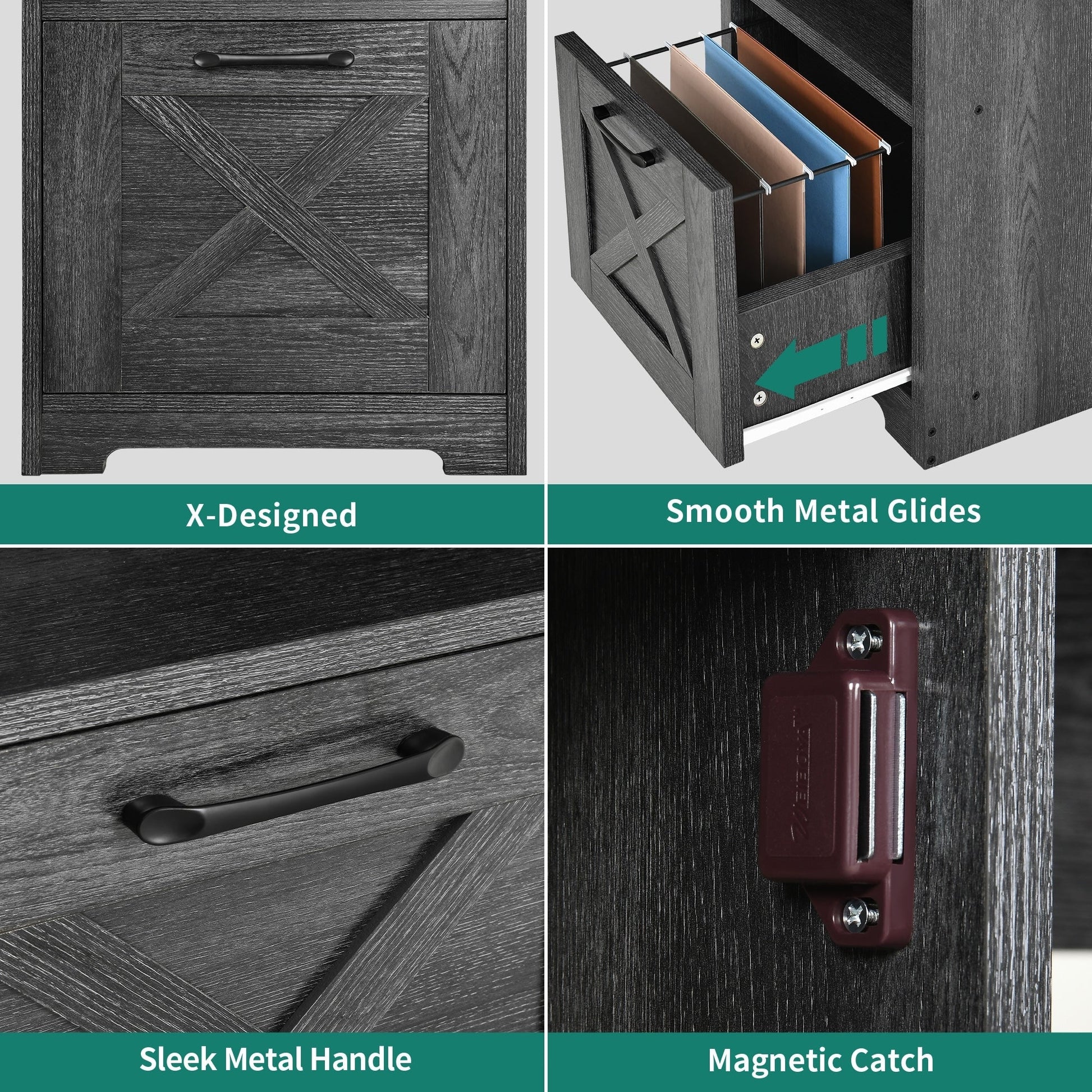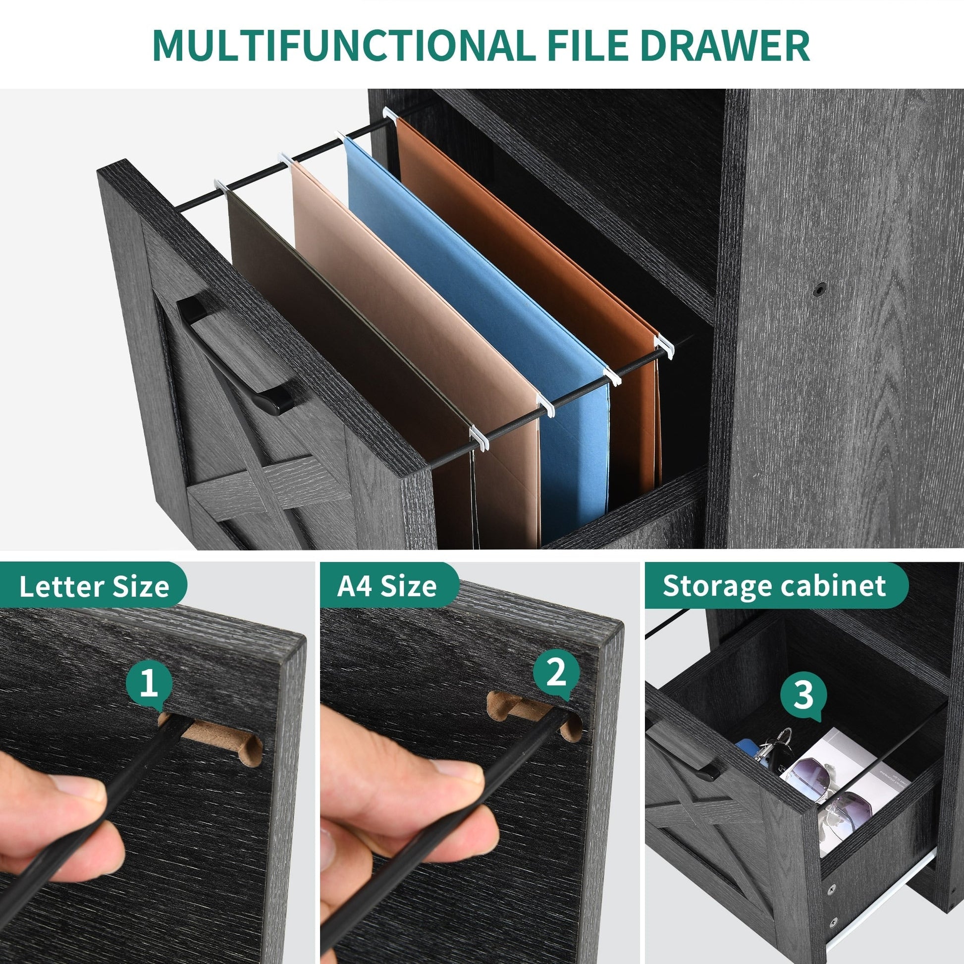 - 4. Keep your things organized and save space with this L-shaped computer desk. It has 1 file drawer with adjustable hanging bars for letter / A4 size documents, 1 storage cabinet, and 2 open storage shelves for storing books, magazines, files, letters, and other supplies.