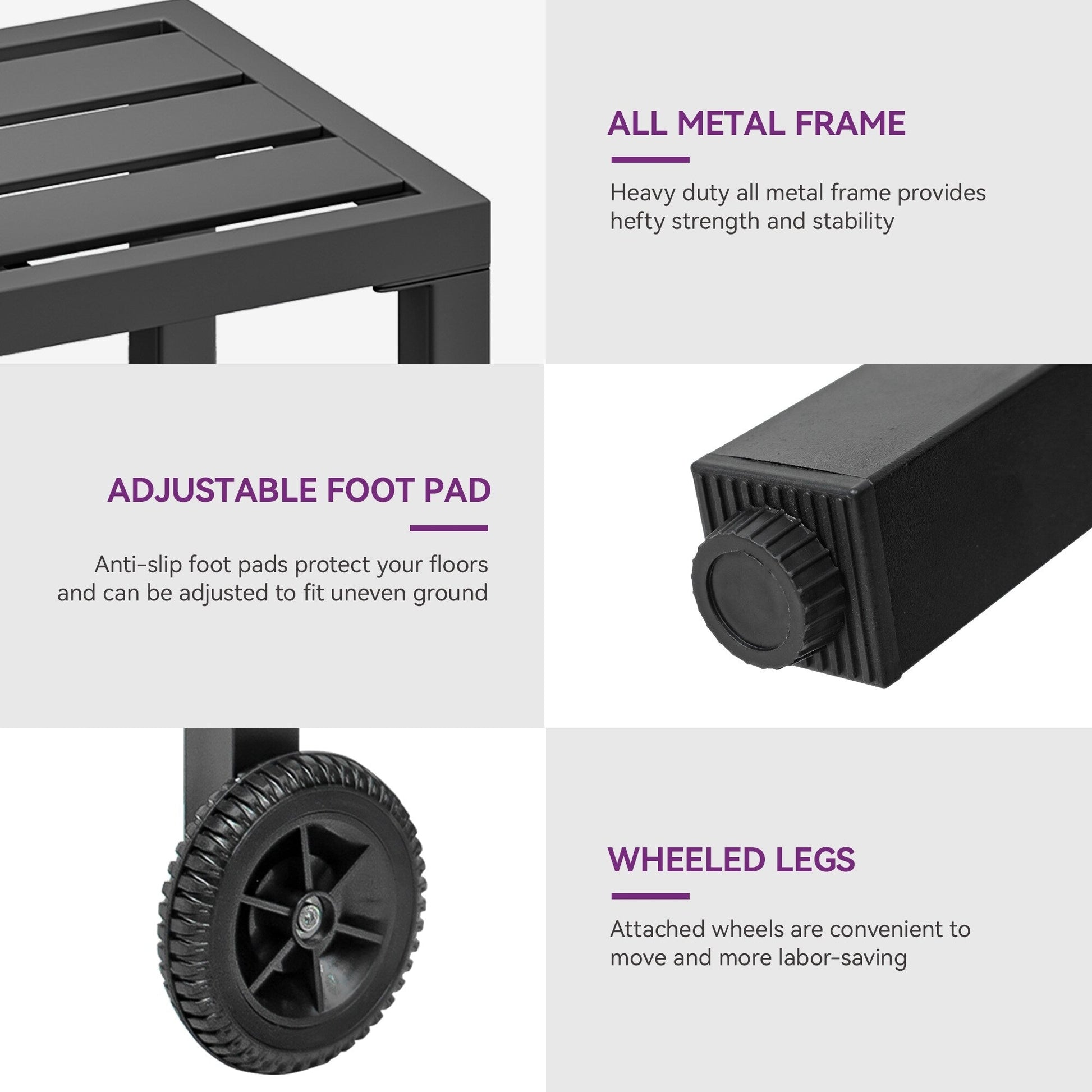 Our Outdoor Bar Table is a sleek and sturdy addition to your outdoor space. Made of high-quality metal with a powder-coated finish, this table is durable and sturdy and boasts 265 lbs weight capacity, thus it can effortlessly withstand heavy loads. Plus, the convenience of having wheels on one side allows for easy mobility and repositioning.