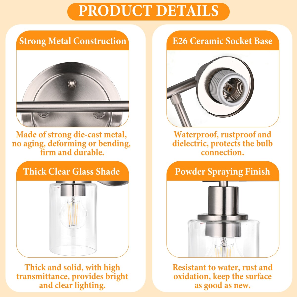 - Easy to install: The bathroom light fixtures comes with all mounting hardware and installation guide for the fast and easy installation process. Bathroom vanity light design allows to be installed pointing up or down