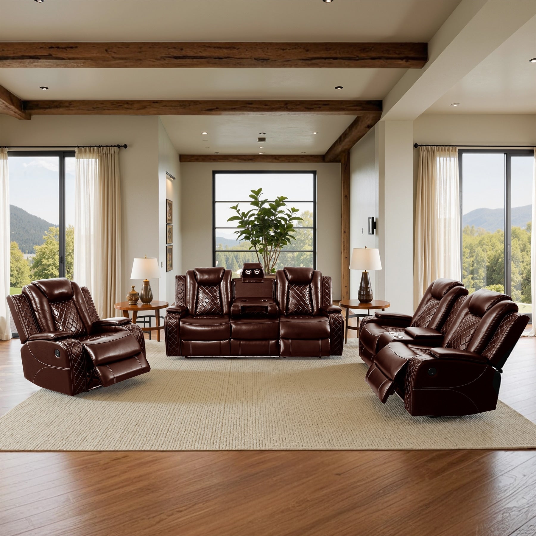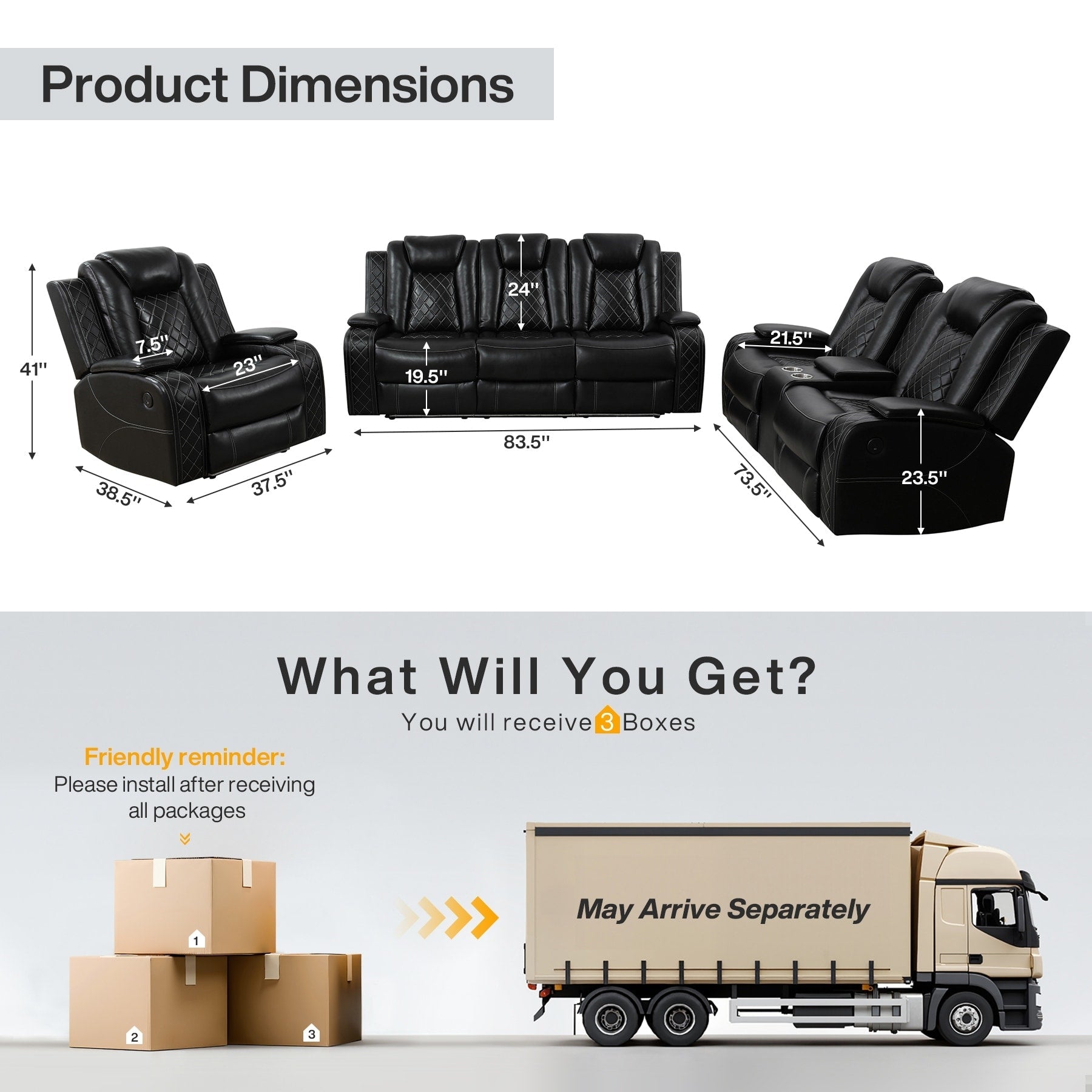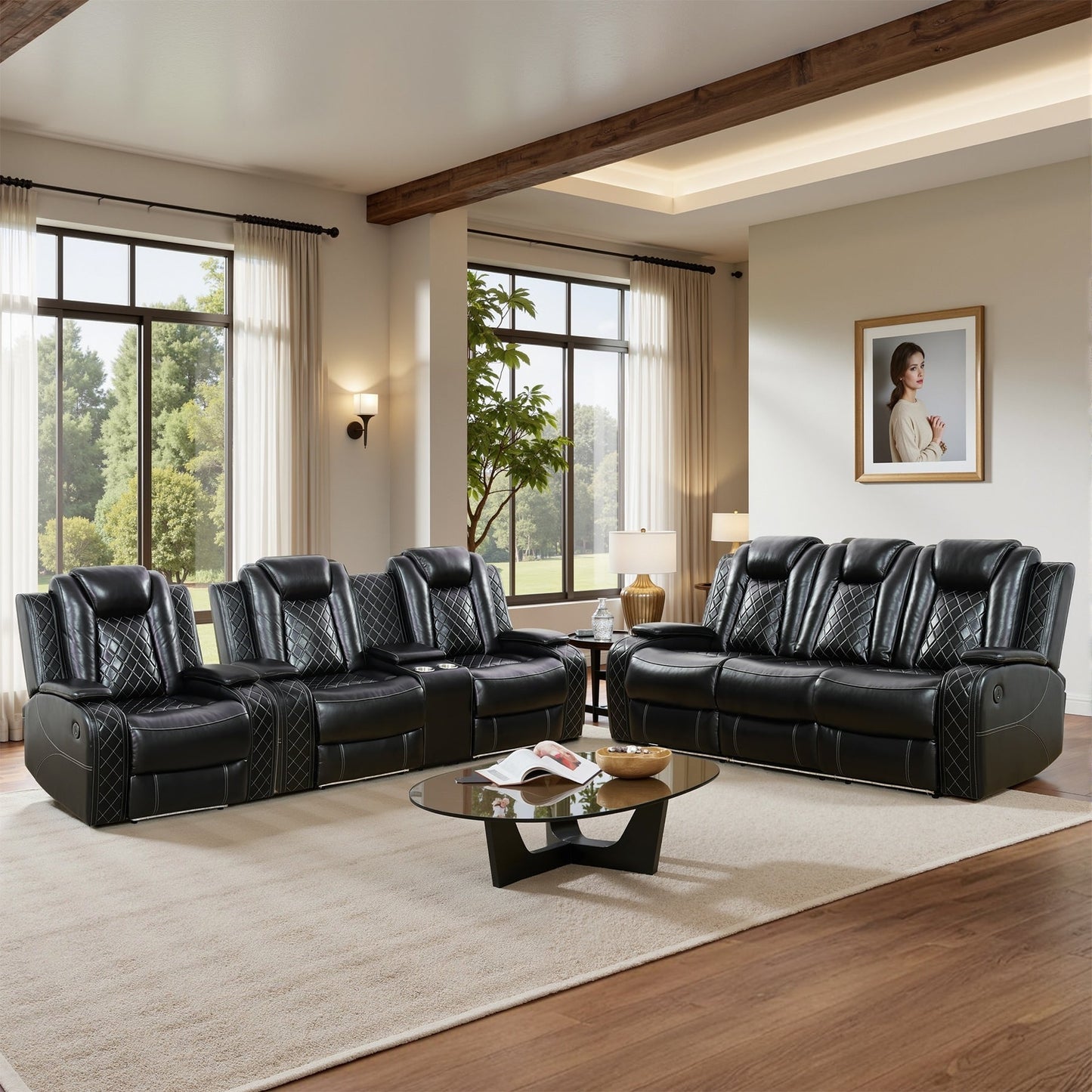 Itâs Friday night. Soft ambient LED lights glow beneath your sleek black sofa as you recline effortlessly at the touch of a button. Your phone charges wirelessly on the built-in coffee table while your drink rests securely in the stainless steel cup holder. Friends laugh beside you, their seats molded to their posture by skin-like, scratch-resistant leather. No creases, no cracksâjust pure, breathable comfort. This isnât just furniture; itâs your sanctuary. Designed for movie nights, lazy Sundays, and impressing guests, this 3-piece set blends modern elegance with genius functionality. Welcome to the future of relaxation.