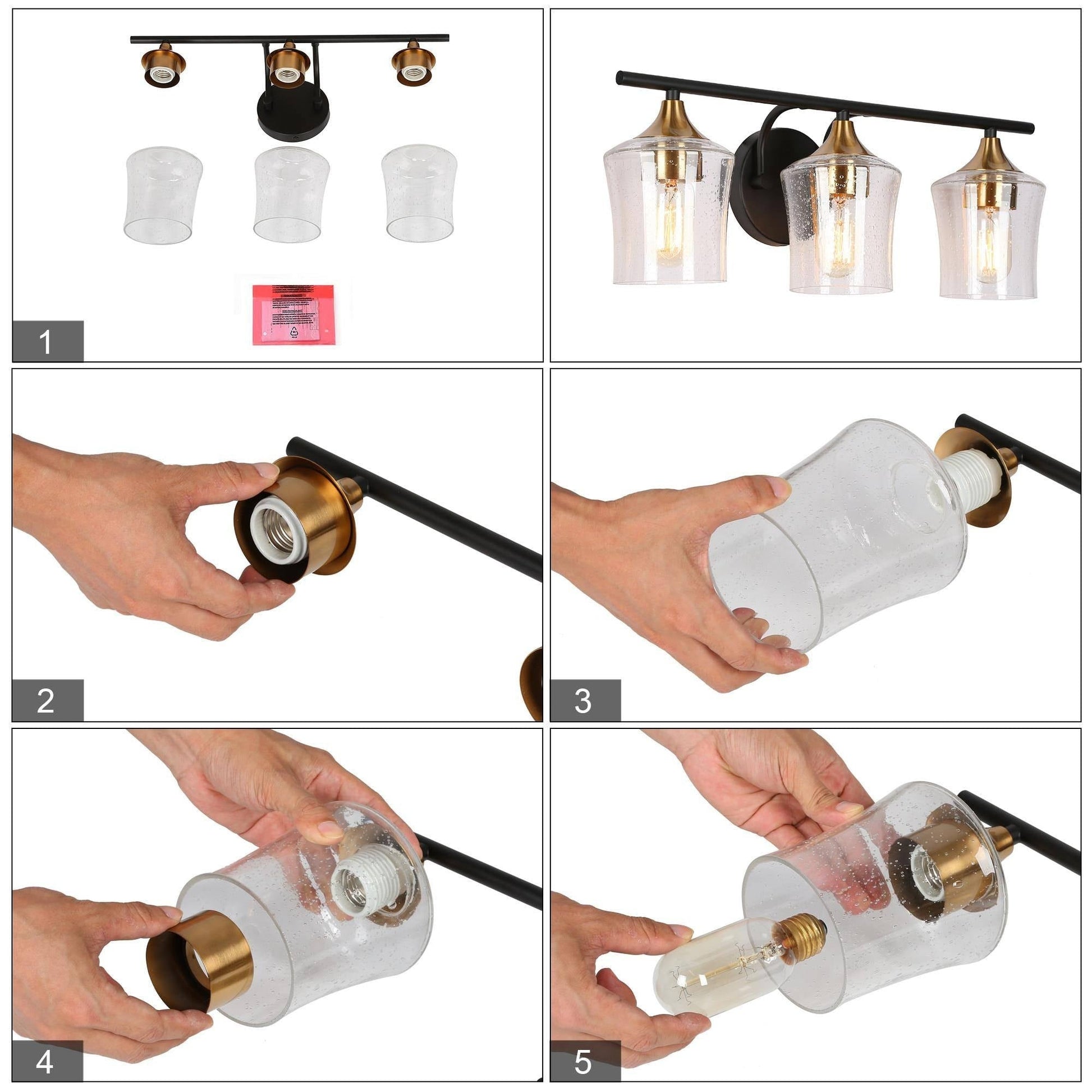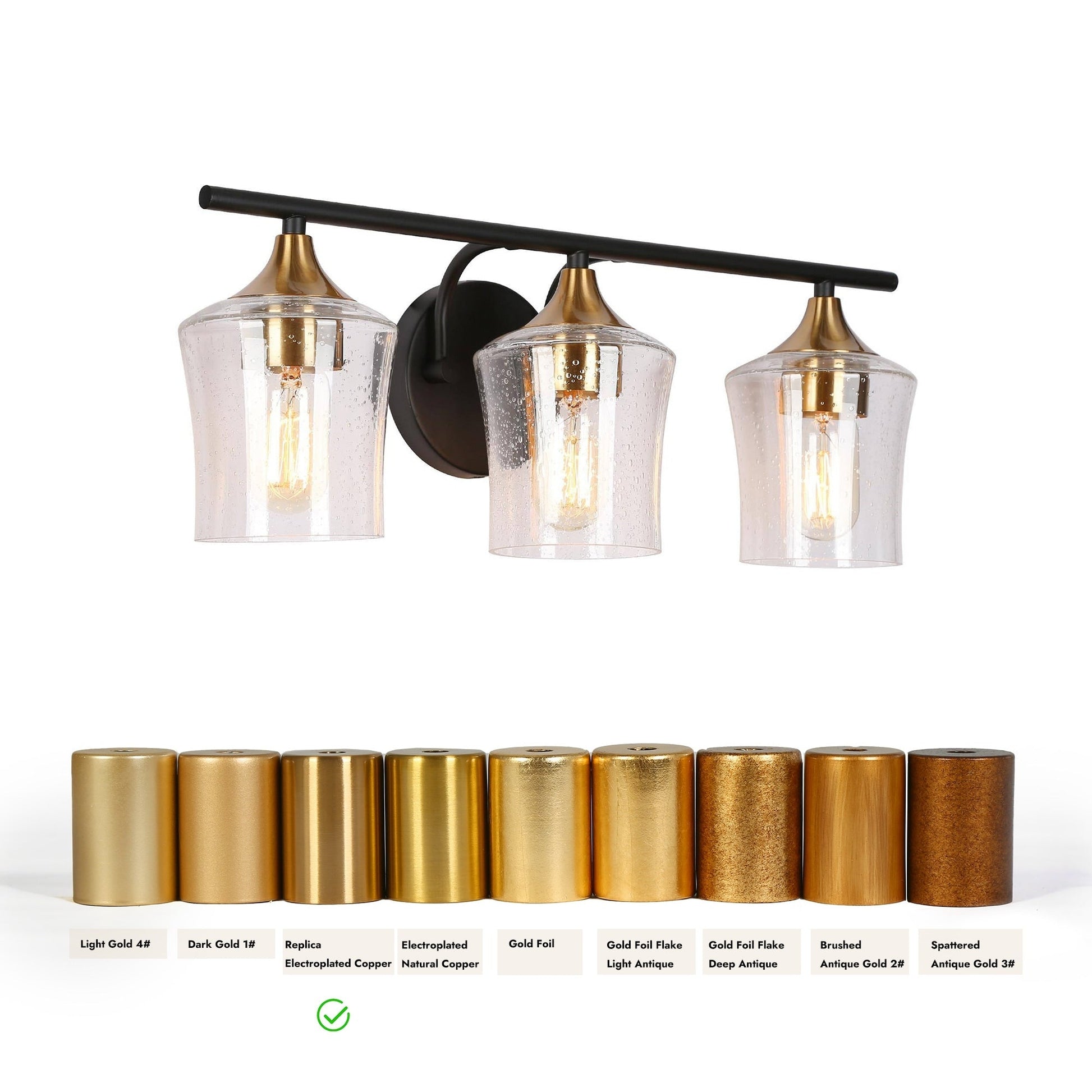 Illuminate your bathroom vanity with this chic and modern black gold light fixture. The seeded glass shades emit a romantic yet bright light, creating a refreshing view in any space. This vanity light features a metal round backplate and arched arms with an electroplated brass finish, adding an elegant touch to your home. Perfect for damp locations, this light fixture is suitable for use in your bathroom, living room, bedroom, and more.