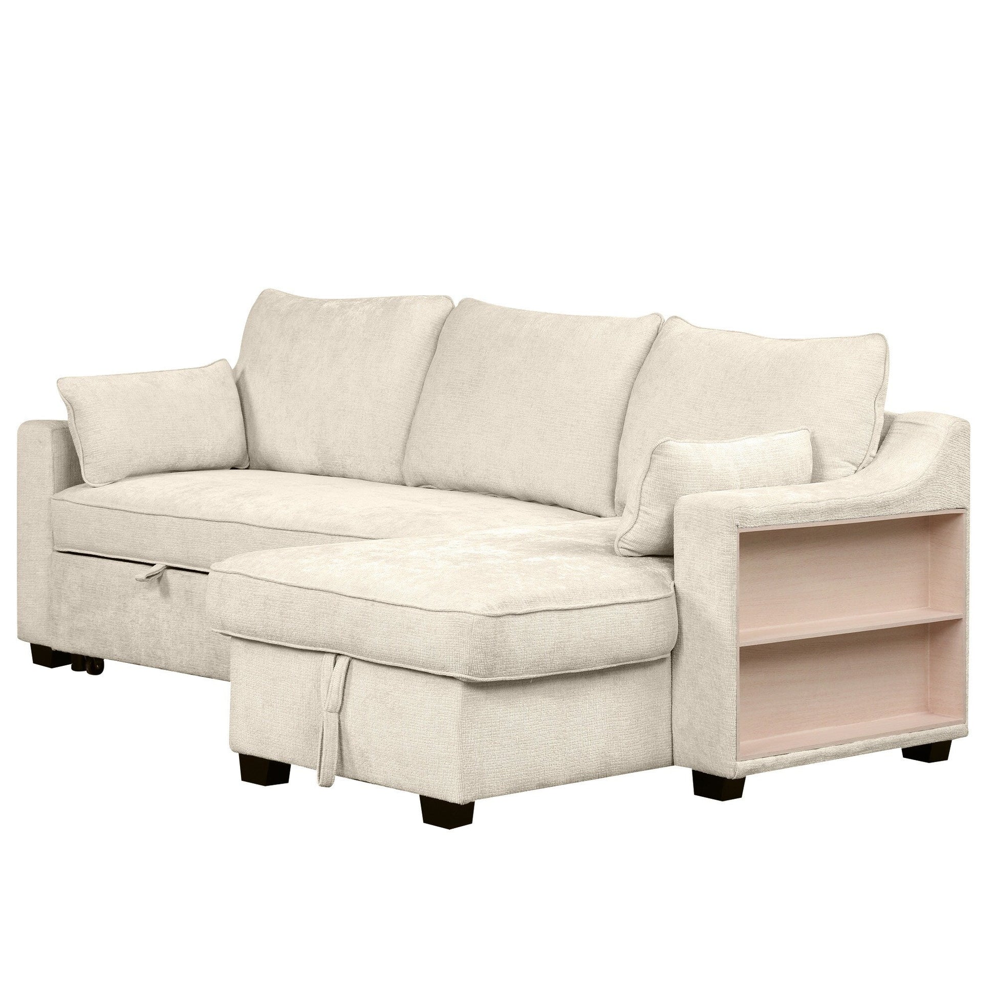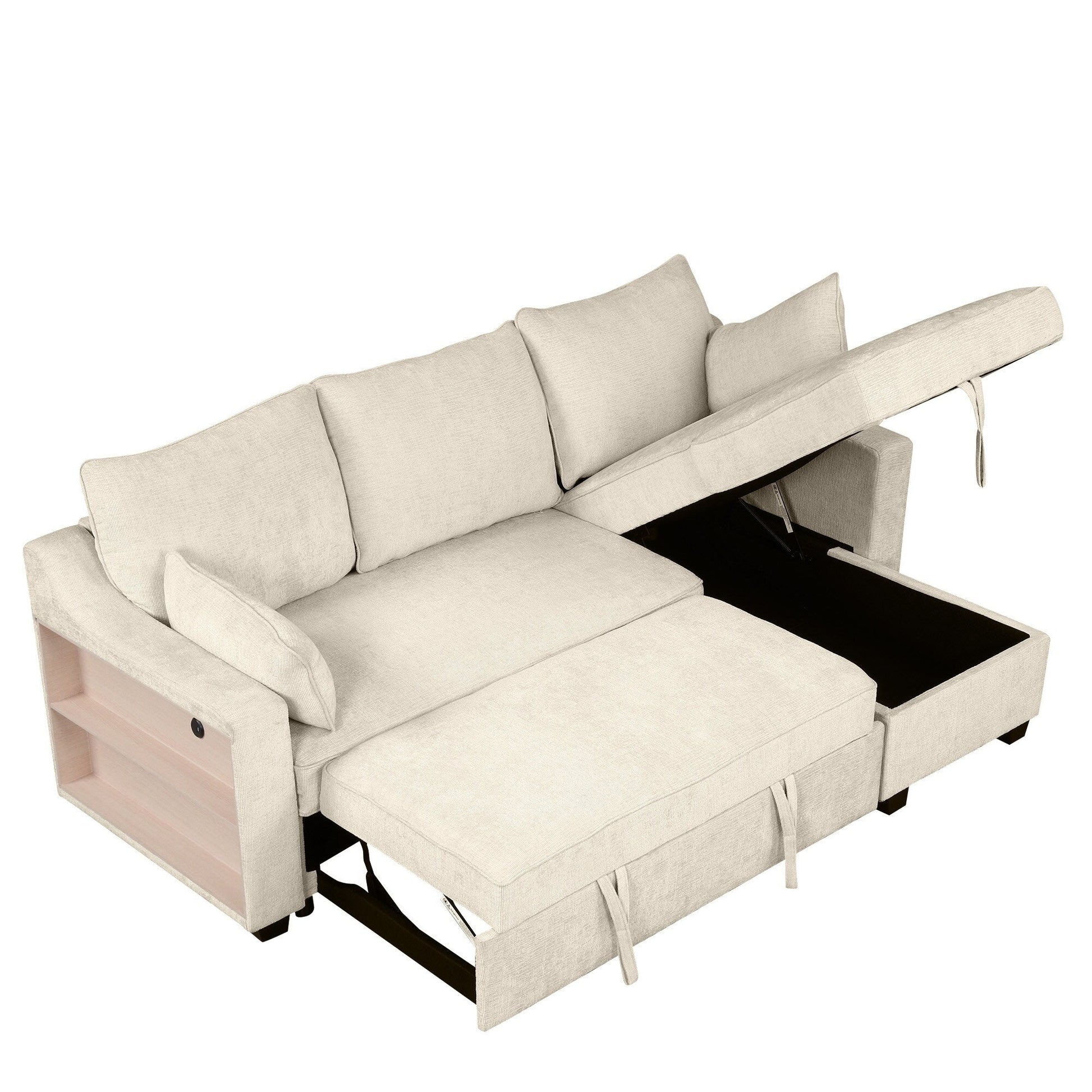 - This L-shaped convertible sofa bed features a pull-out design with wheels and a handle for quick transformation. With a storage chaise, dual shelves, and built-in USB ports, it combines space-saving convenience with soft chenille fabric and supportive cushioning for daily comfort.