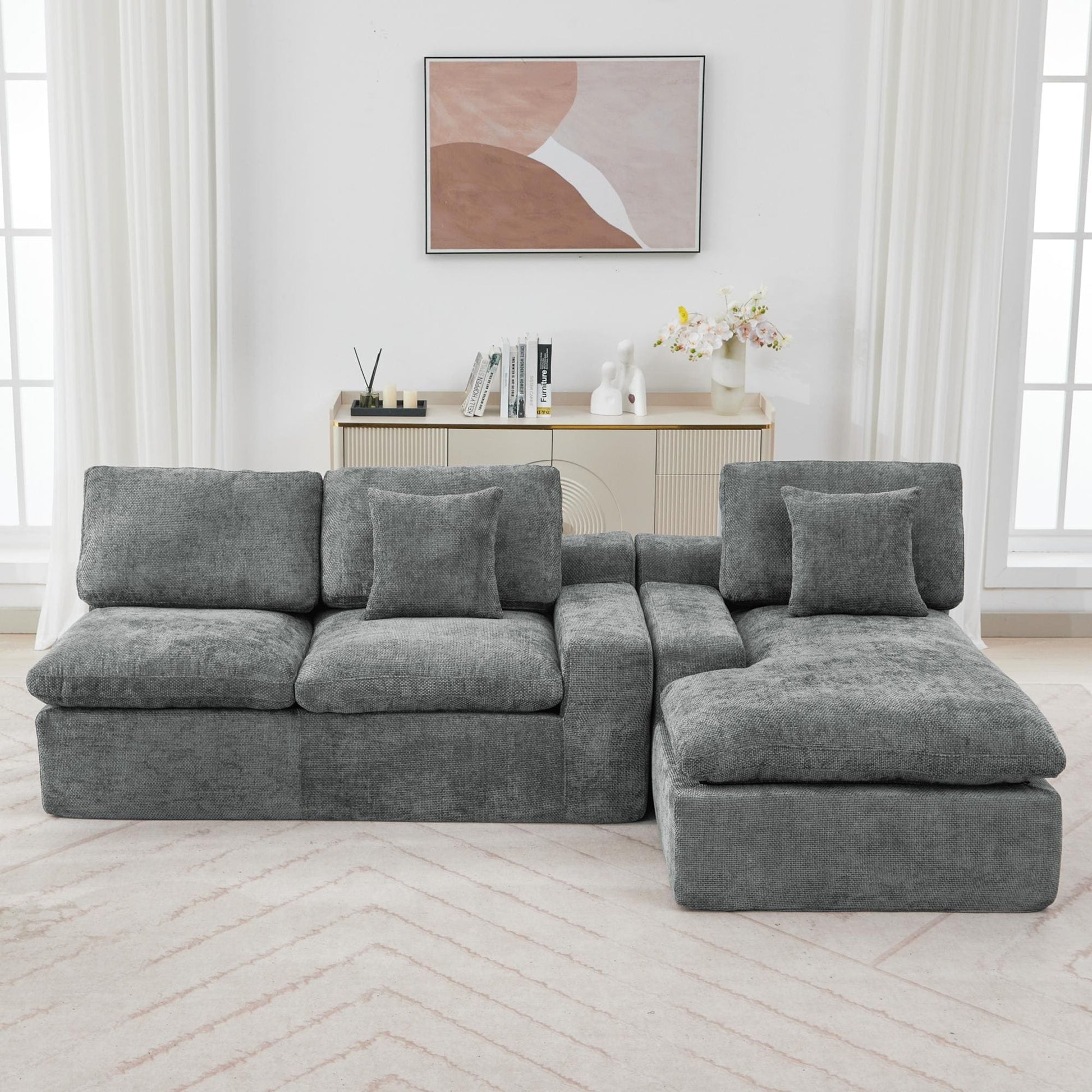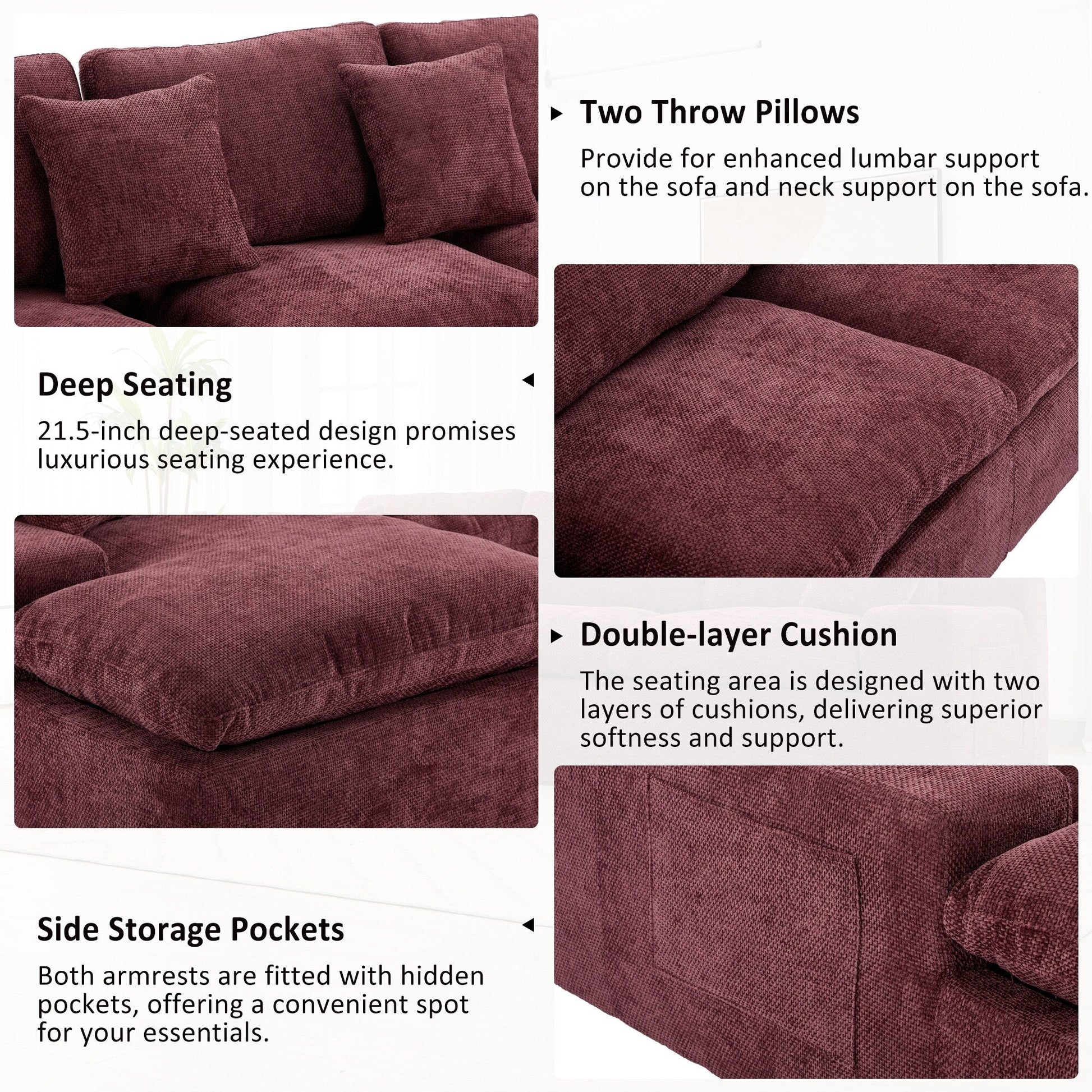 - This modular cloud sectional sofa offers versatile configurations to fit any living space. Featuring double-layer cushions with soft compressed foam and sturdy support, it provides balanced comfort. Upholstered in durable chenille fabric, it includes deep 21.5-inch seats, hidden side storage pockets, and two matching pillows for added convenience and style.