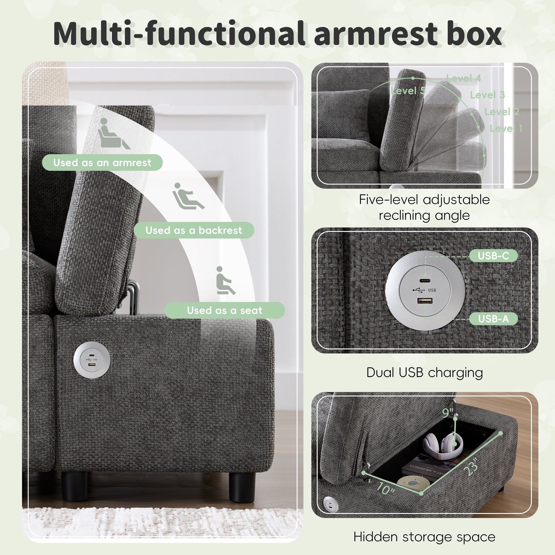 - Adjustable Charging Armrest: Armrest adjusts to 5 angles and includes USB and Type-C ports.