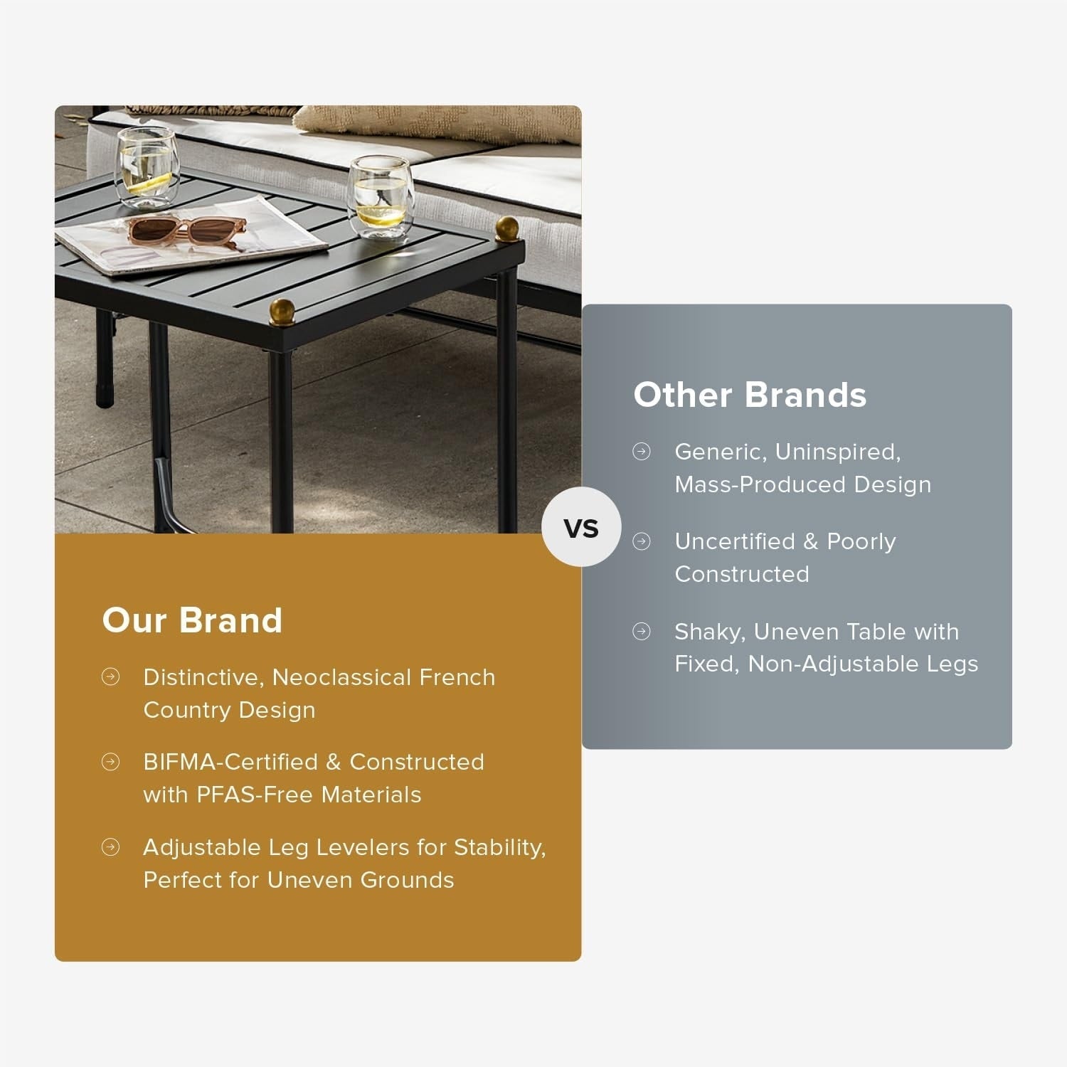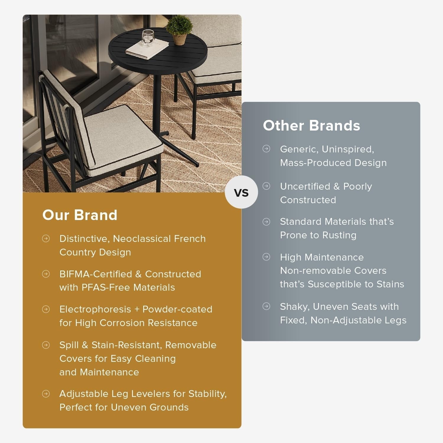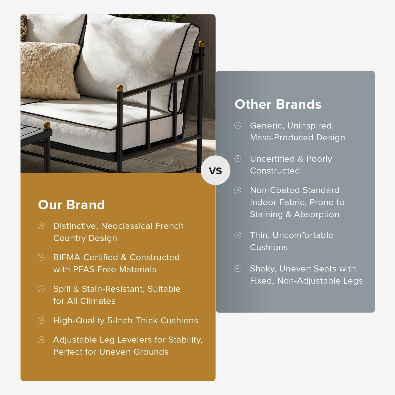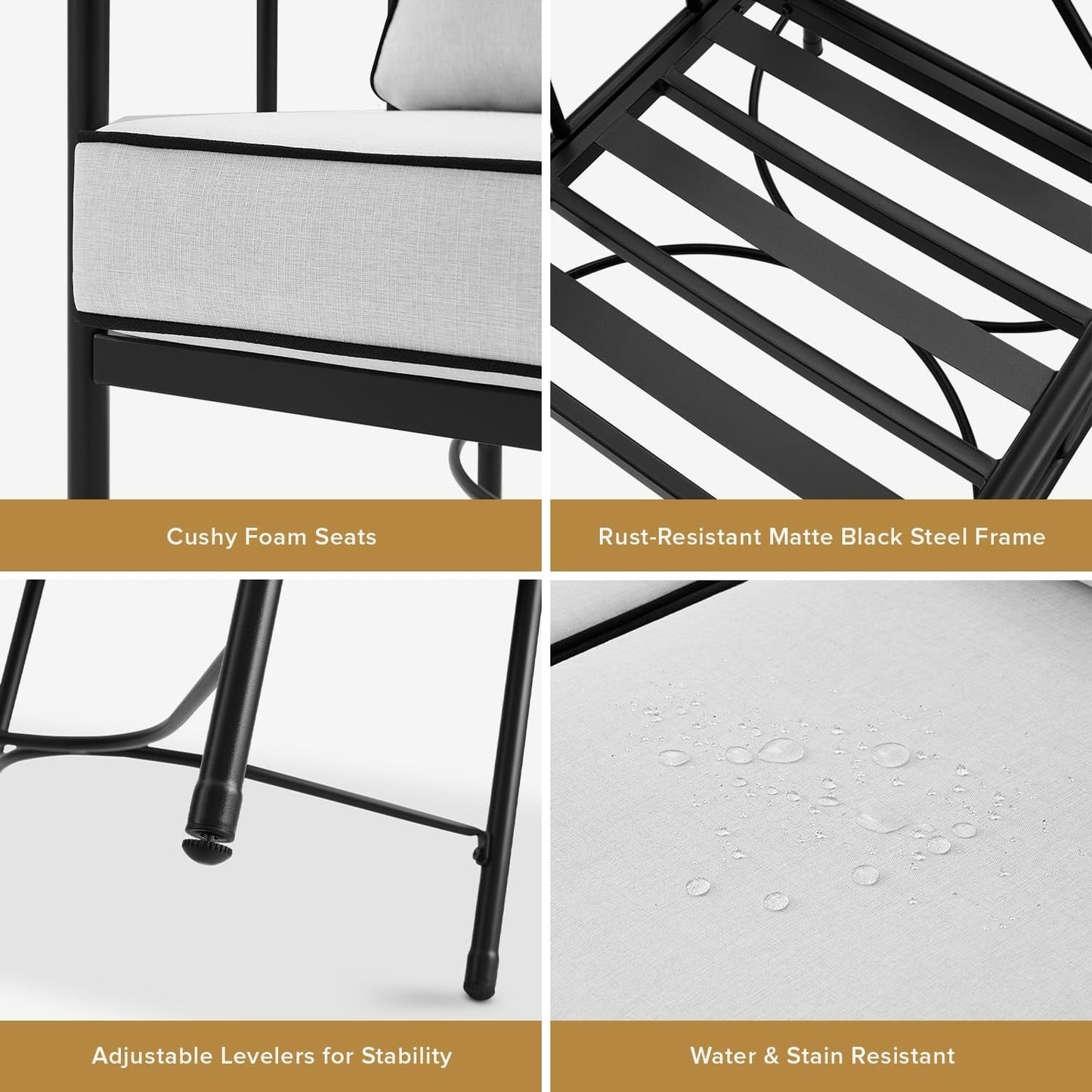 - Sturdy, Reliable & Durable: With user well-being at the forefront, the electro & powder-coated matte black steel frame has undergone rigorous testing and is BIFMA-certified for quality assurance. We prioritize safety and durability by using PFAS-free materials, ensuring resilience against diverse climates. Adjustable leg levelers for enhanced stability, especially useful for uneven outdoor grounds. The armchair, loveseat and table holds up to 275 lbs, 550 lbs, and 60 lbs respectively.