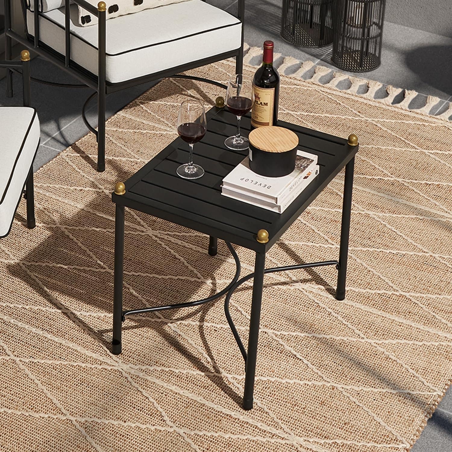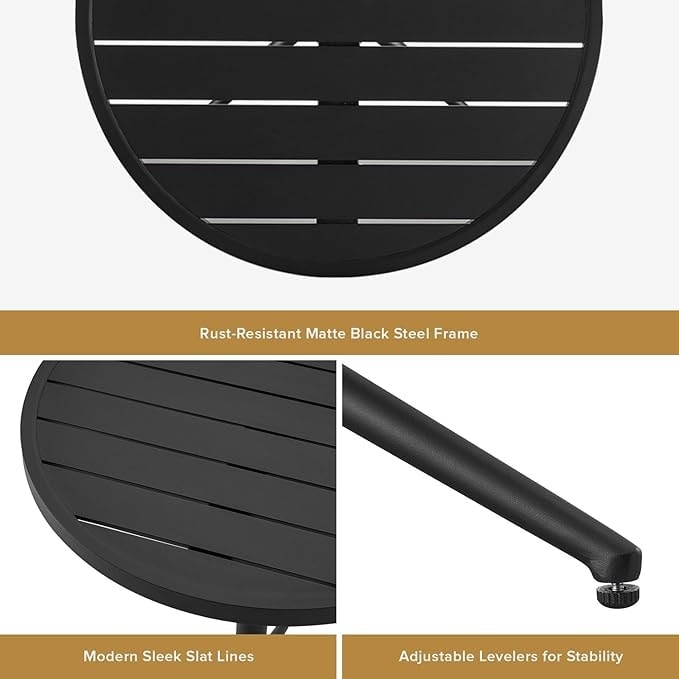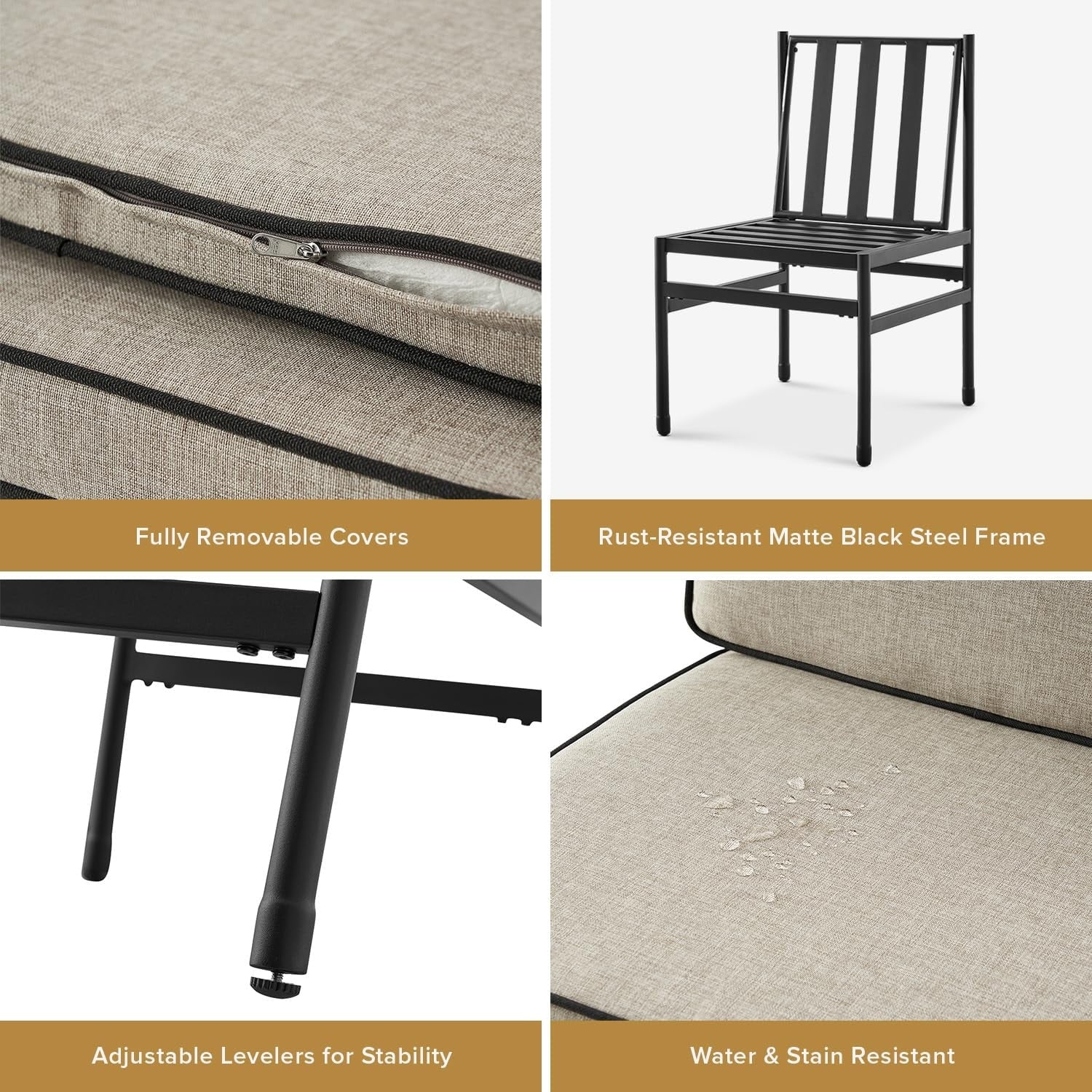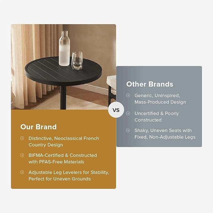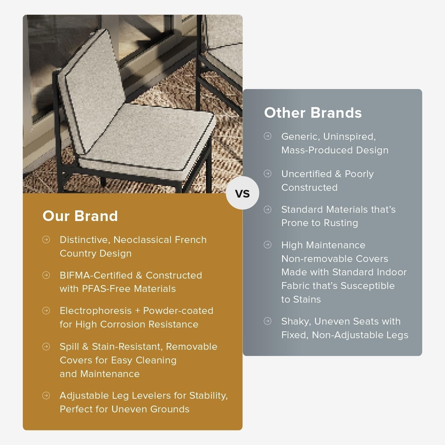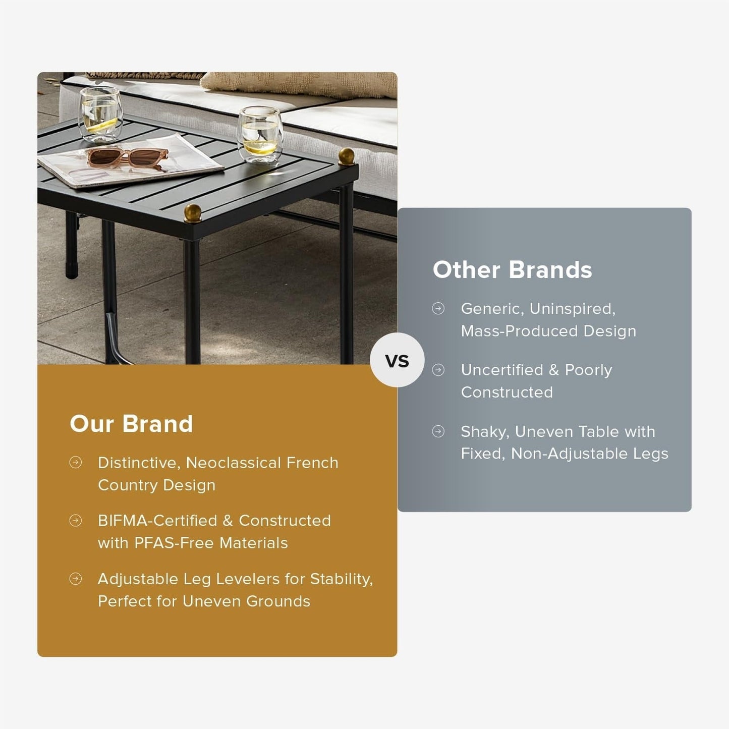 - Sturdy, Reliable & Durable: With user well-being at the forefront, the electro & powder-coated matte black steel frame has undergone rigorous testing and is BIFMA-certified for quality assurance. We prioritize safety and durability by using PFAS-free materials, ensuring resilience against diverse climates. Adjustable leg levelers for enhanced stability, especially useful for uneven outdoor grounds. The armchair, loveseat and table holds up to 275 lbs, 550 lbs, and 60 lbs respectively.