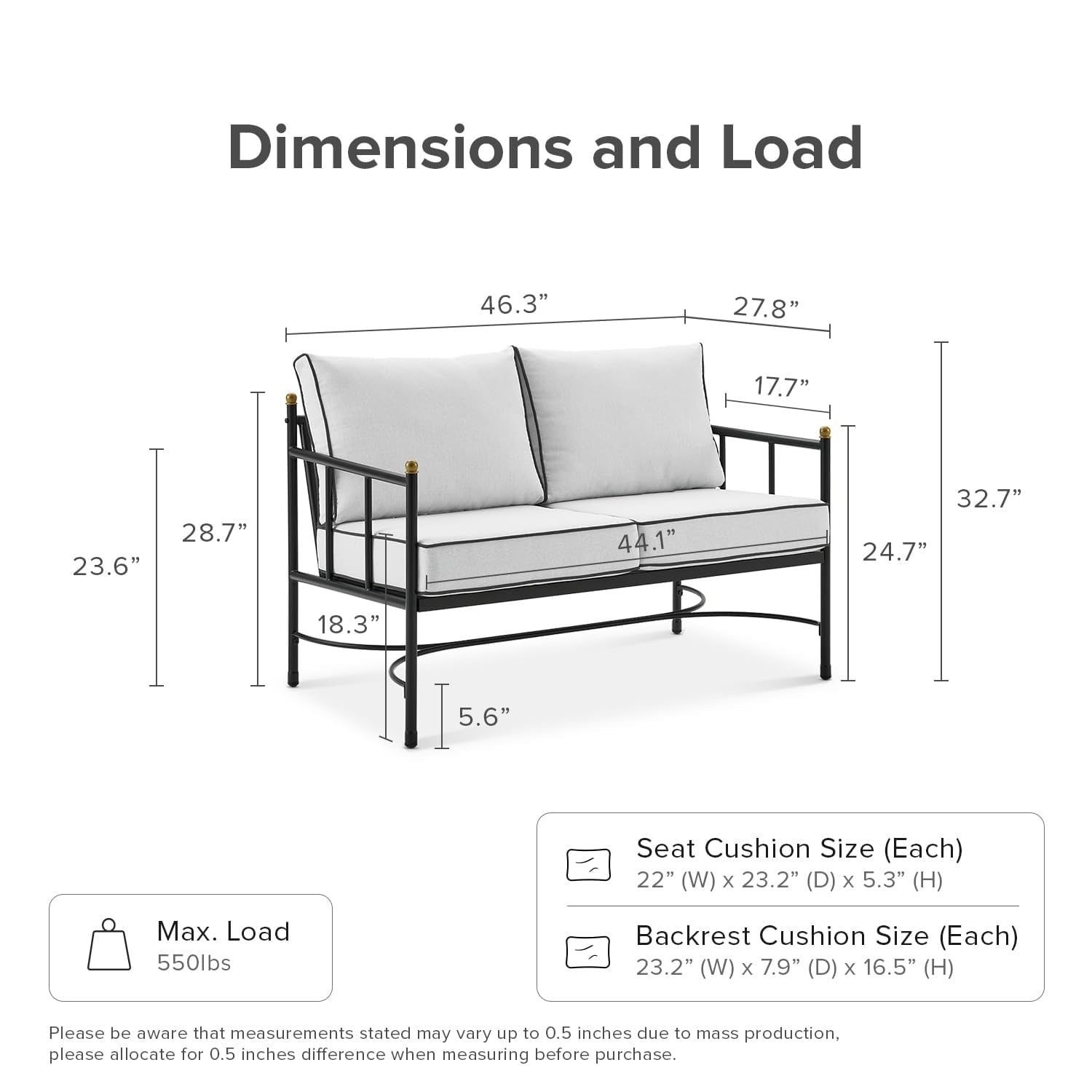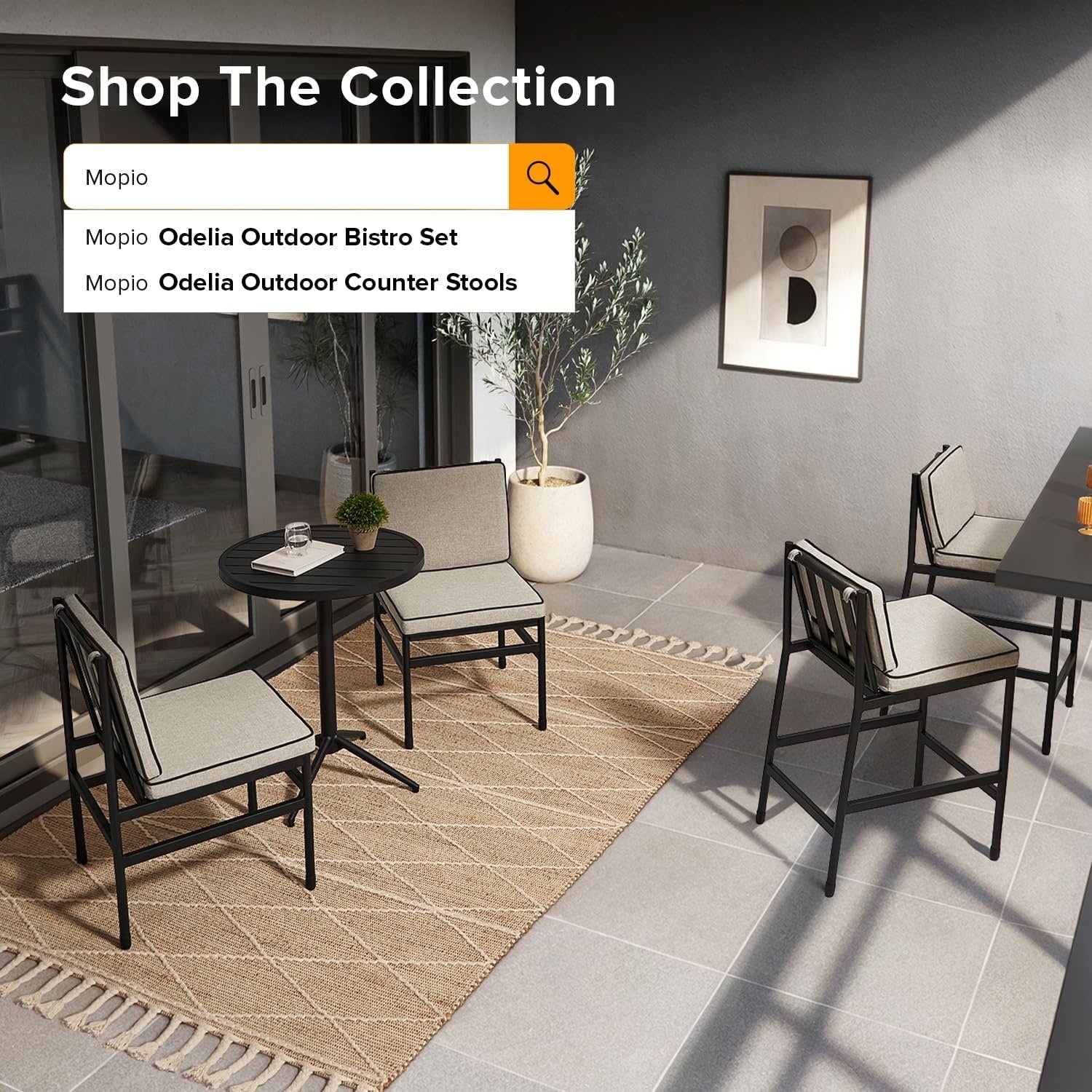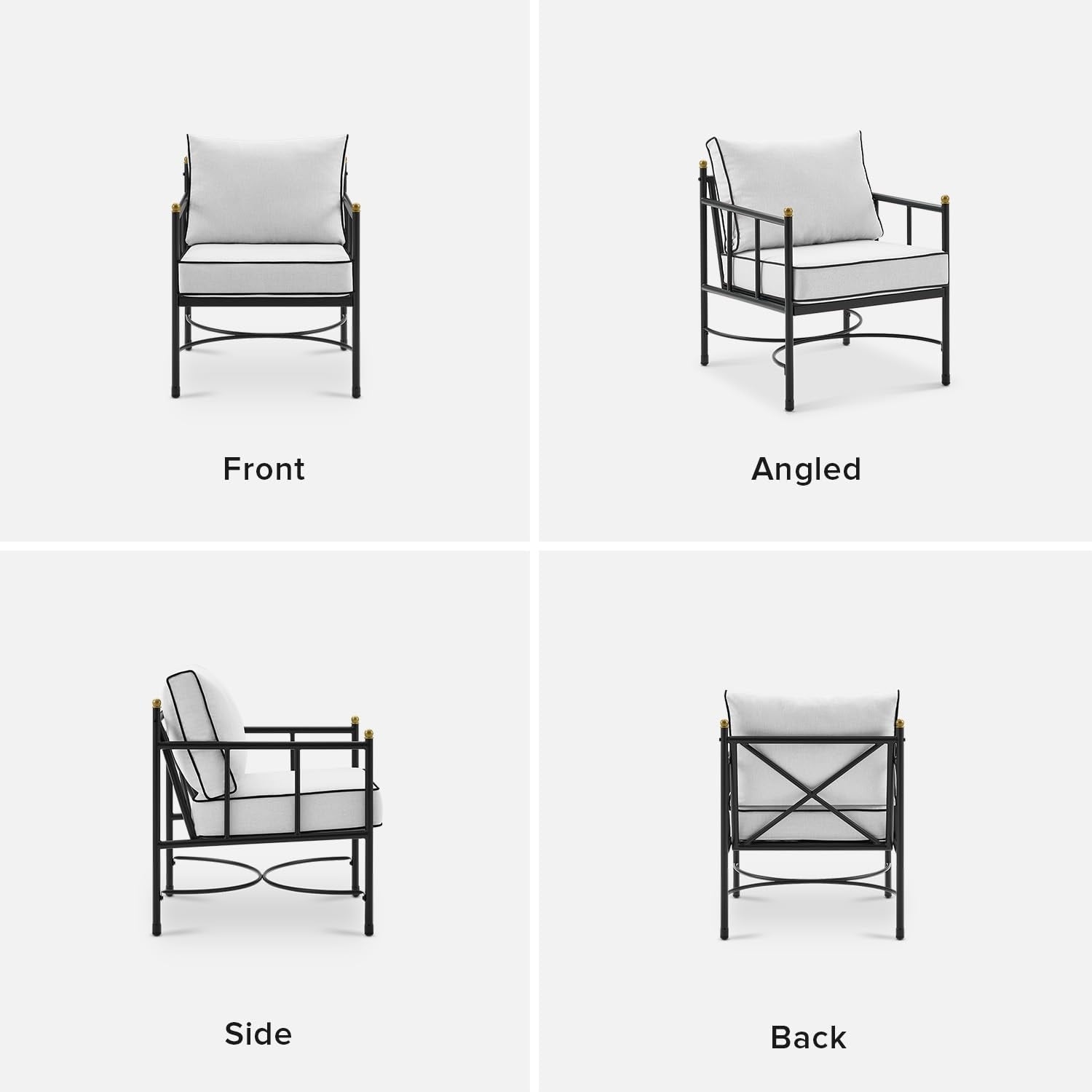 Get Summer ready and bask in the sun in style with the Odelia Patio Outdoor Set. Inspired by the charm of the French countryside and neoclassical style, this set features eye-catching contrast piping upholstery set against a sophisticated dark steel frame adorned with sleek lines, elegant curves and accented with gold knobs. Crafted for maximum comfort, the set boasts plush, high-quality foam seats and is designed to withstand all weather conditions with its rust-resistant steel frame and removable spill and stain resistant upholstery covers, ensuring durability beyond just the summer season. Rigorously tested with BIFMA certification and engineered with PFAS free material for safety and durability. The complete 4-piece set includes a loveseat, two armchairs, and a coffee table, perfect for hosting summer gatherings, or mix and match the armchairs with a table or the loveseat with a table for a cozy setup in smaller outdoor spaces.?