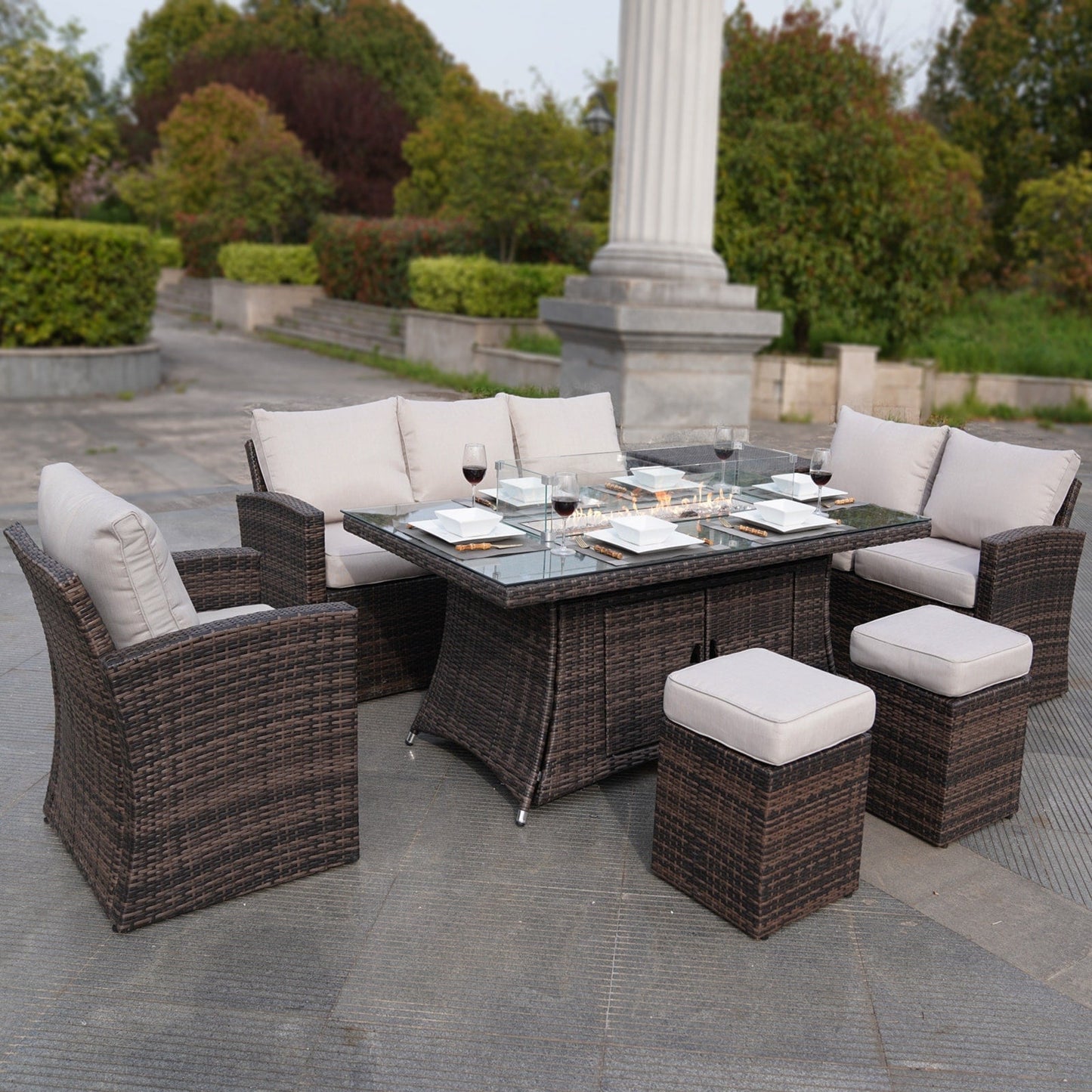 - Set includes: One (1) Three-seater Sofa, One (1) Love Seat, One (1) Single Sofa, One (1) Firepit Table, Two (2) Ottomans, One (1) Storage Box