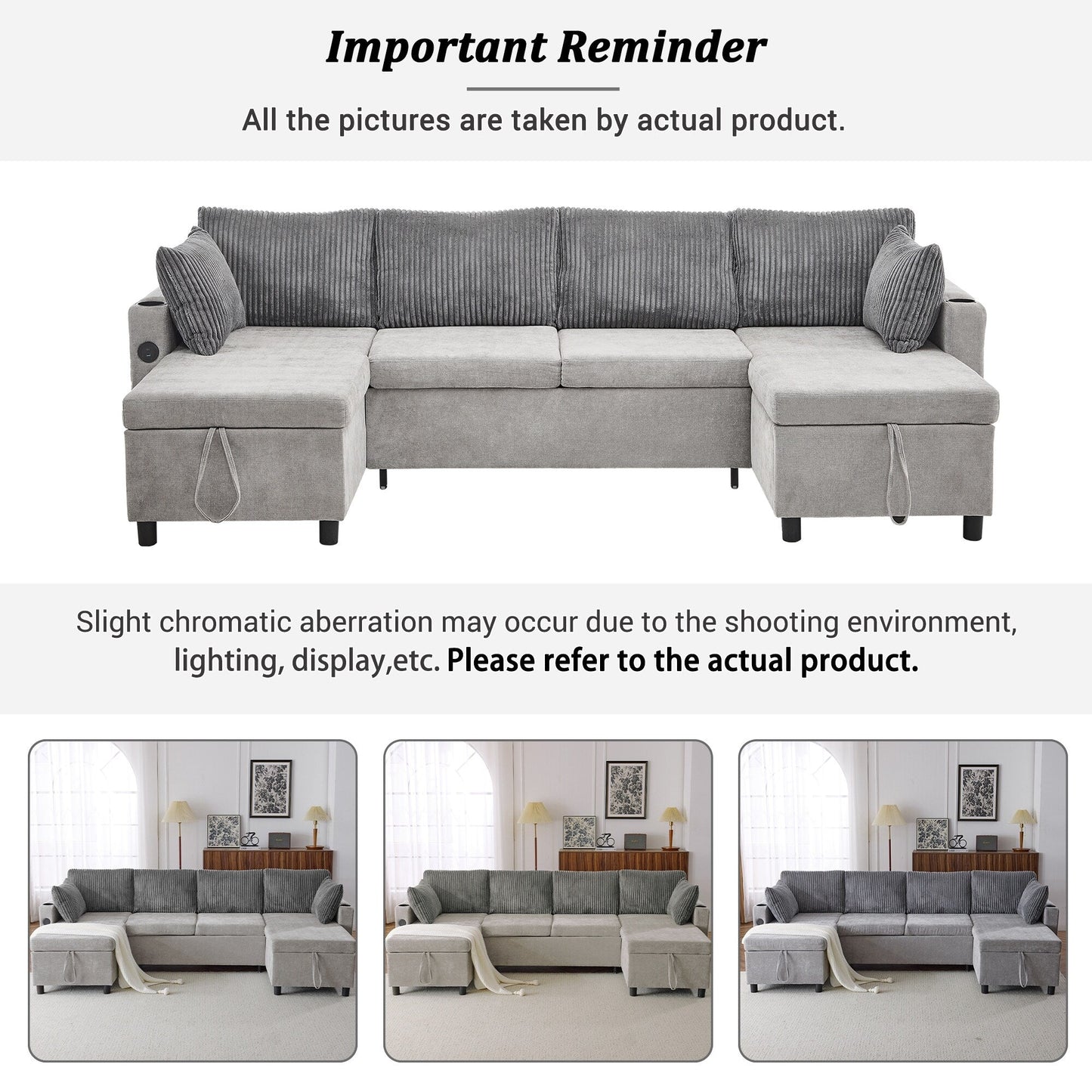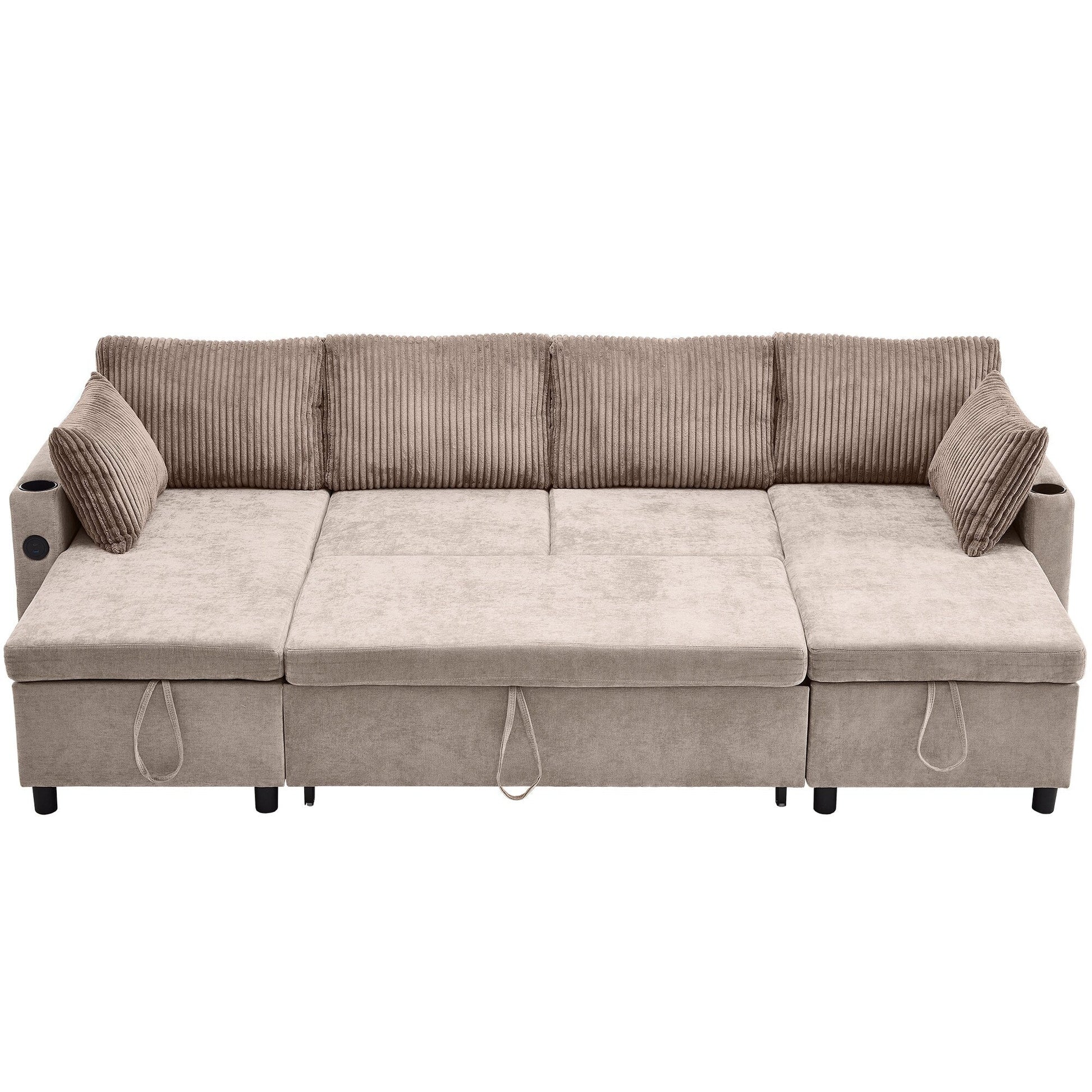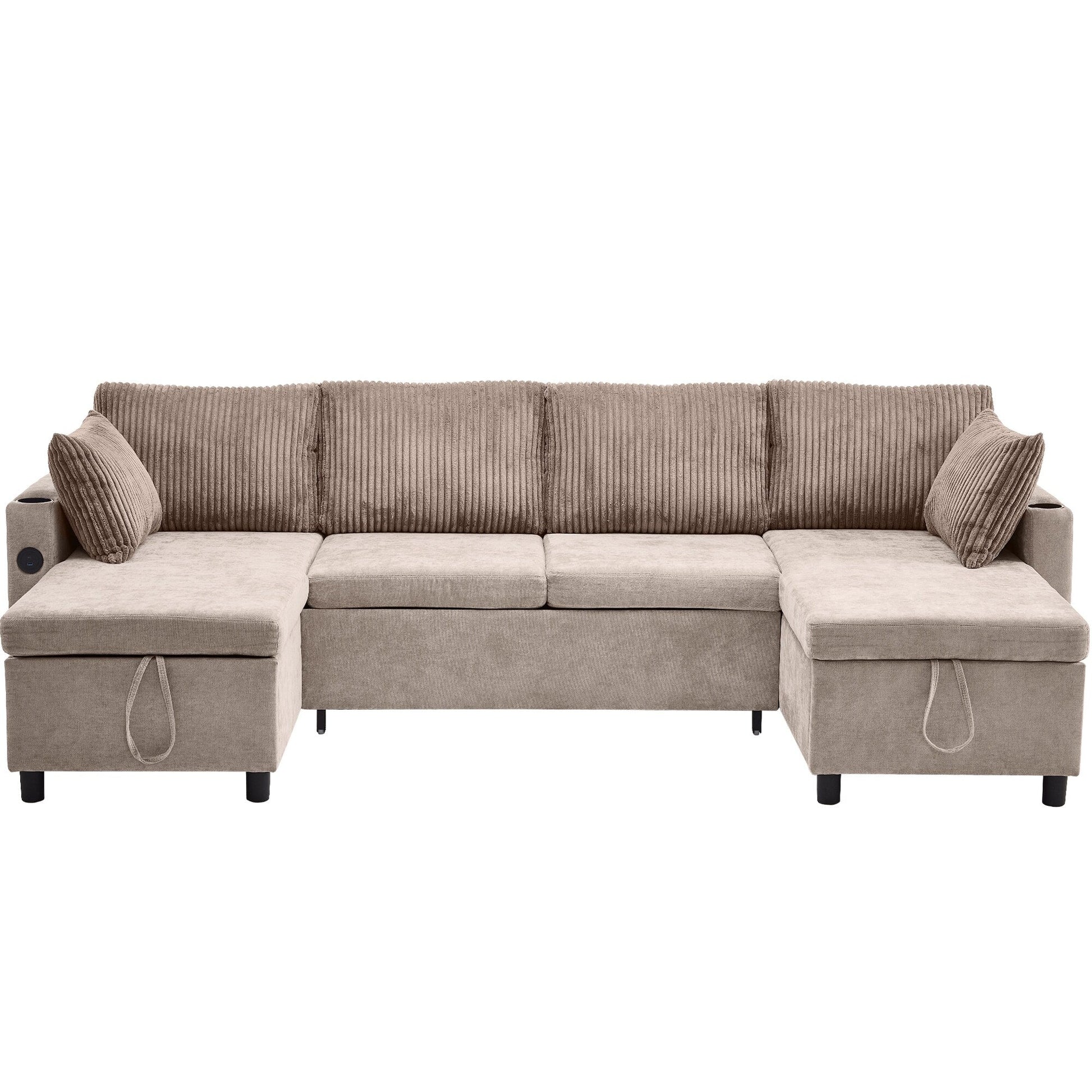 - This multifunctional sectional sofa easily transforms into a pull-out bed or U-shaped seating. With built-in USB ports, cup holders, and double chaise storage, it blends comfort, convenience, and space-saving designâideal for hosting guests or everyday lounging.