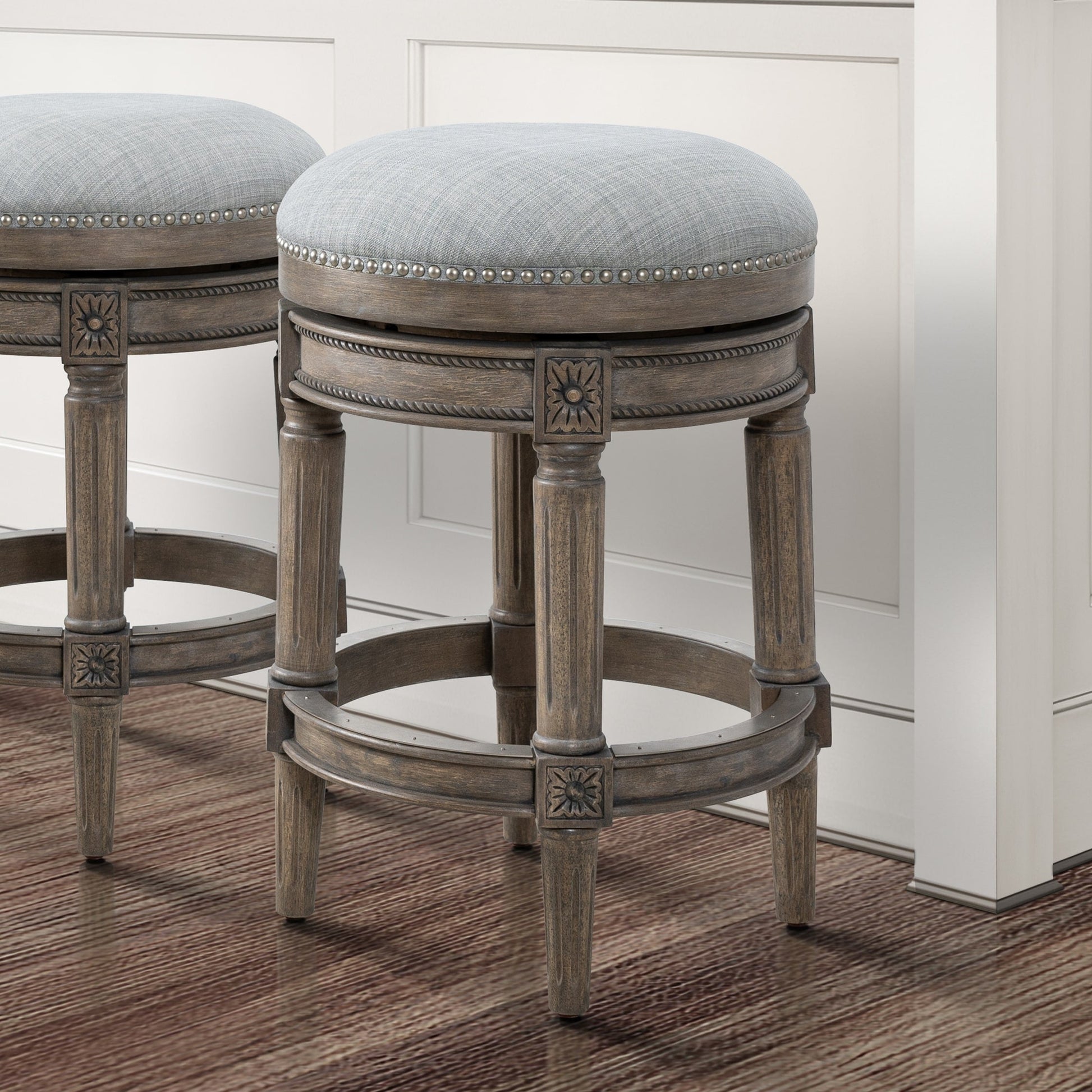 Bring a touch of comfortable sophistication to your dining area or recreation room with our backless barstool. Our 26in. counter-height stool features 360-degree swivel, metal footrests, and hand-applied nail heads to add to the design. With no tools required for assembly, this stool is the perfect addition to any bar or table. Assembly is a breeze with no tools required. Perfect for kitchen counters, this stool stands 26 inches high.