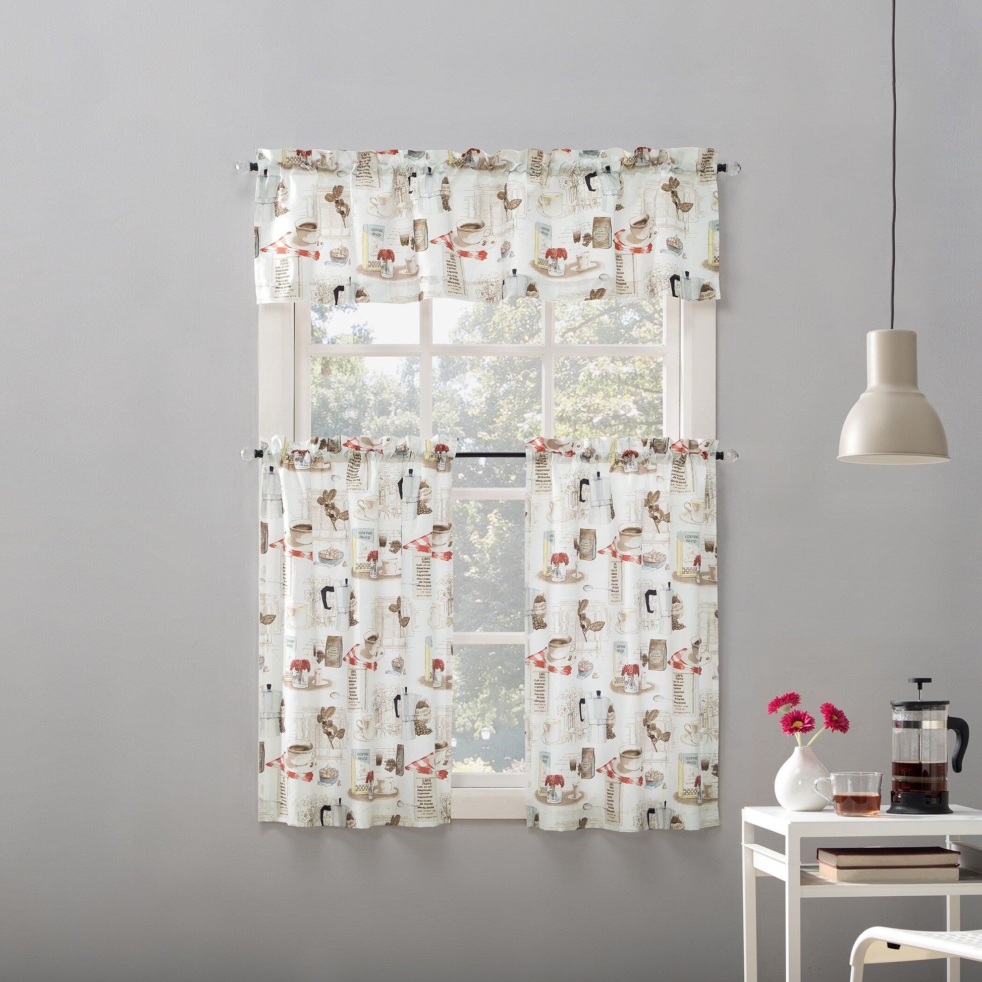 Add a touch of coffee shop charm to your kitchen with the No. 918 Brew Semi-Sheer Rod Pocket Kitchen Curtain Valance and Tiers Set. This three piece set includes one valance and two tier curtains, each featuring coffee shop motifs that will make your kitchen feel cozy and inviting. The semi-sheer fabric gently filters light while also enhancing privacy, and the rod pocket design makes it easy to hang these curtains on a standard curtain rod. Not just for the kitchen, this set is also perfect for bathroom windows. Plus, it's machine washable for easy care.
