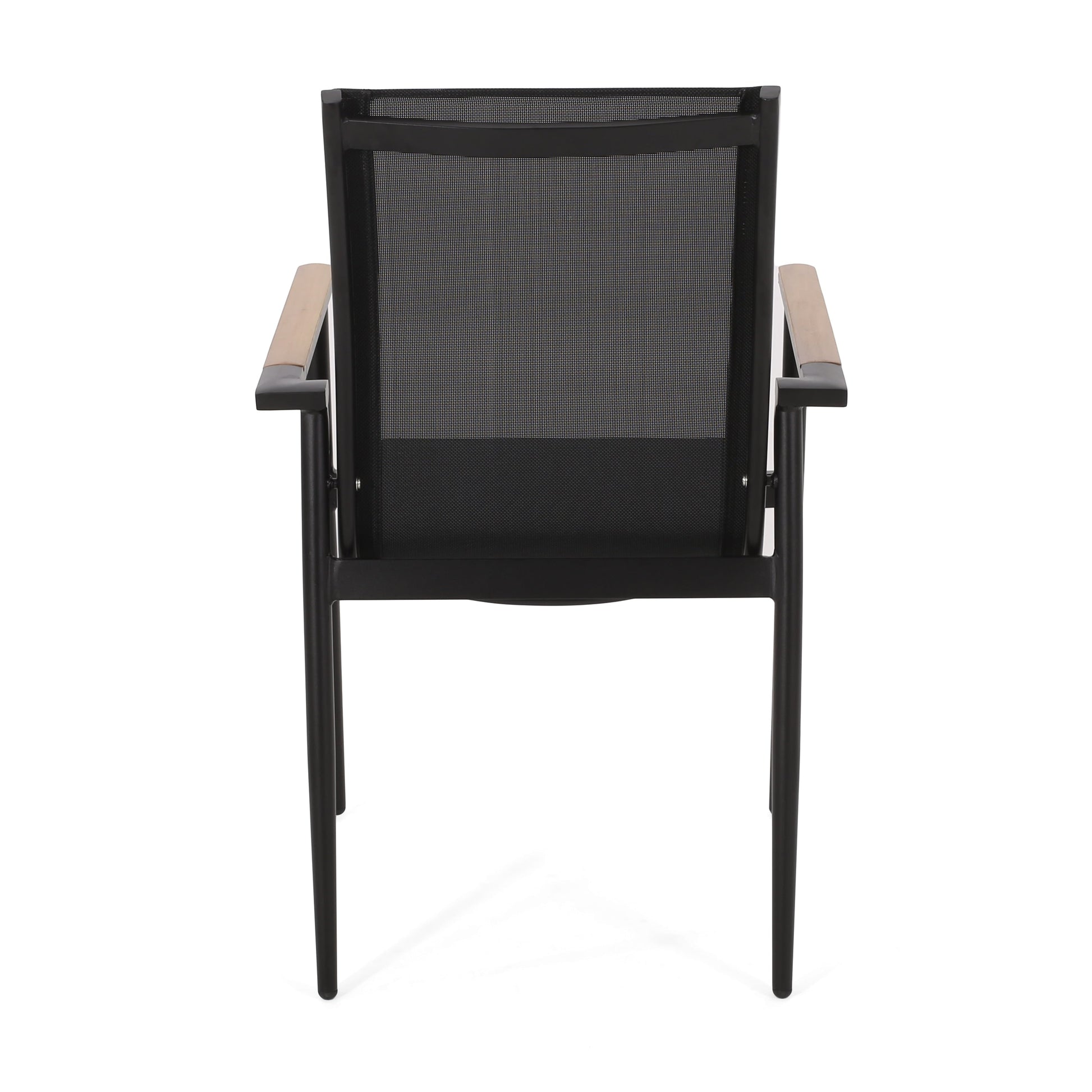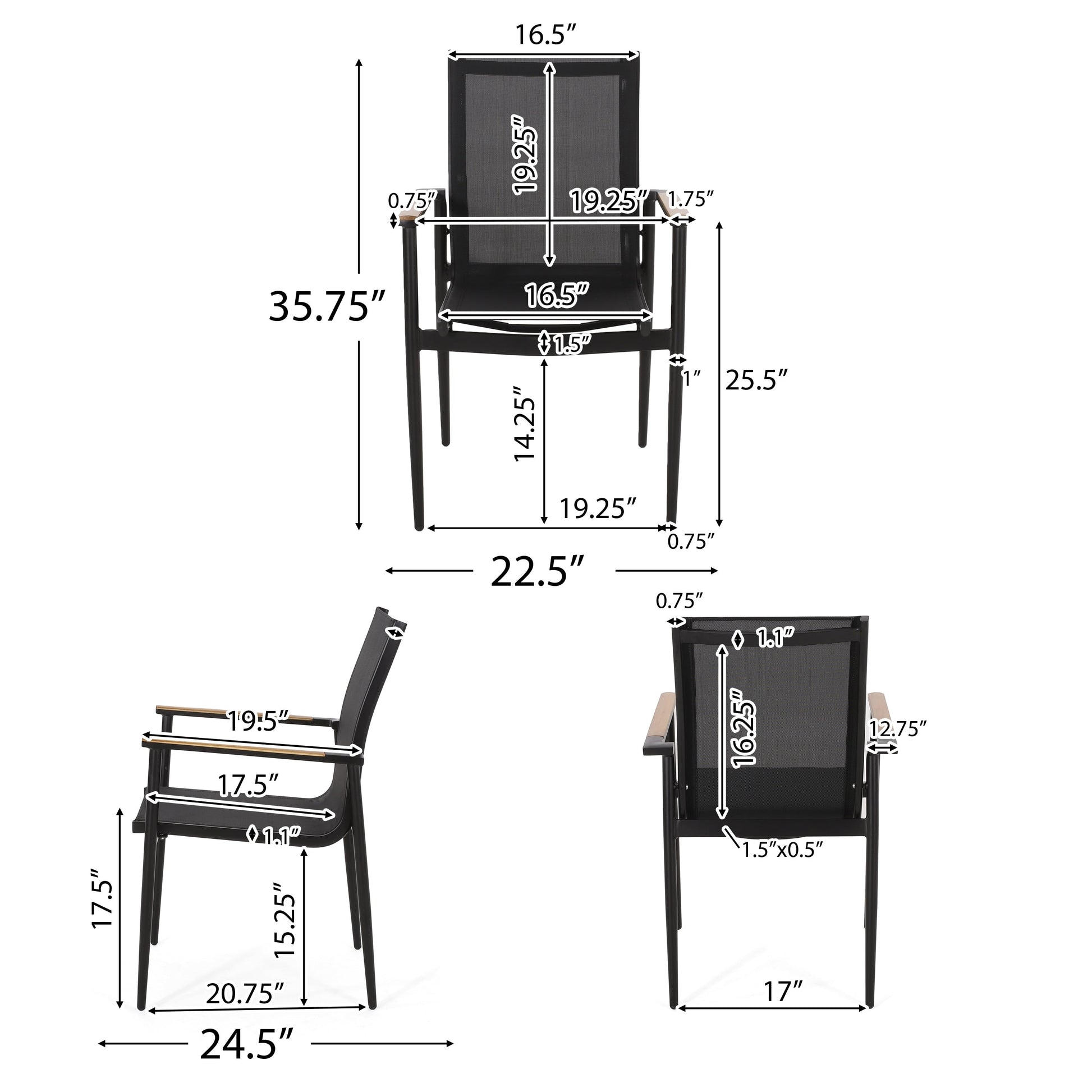 Gear up for afternoon barbeques and host weekend brunches with ease. Taking modern aesthetics and combing them with industrial influences, our dining set takes function and design to create the perfect dinner party or afternoon luncheon for all your guests. Featuring a slat-panel tabletop made from sturdy faux wood and complementing chairs made with aluminum and mesh seating, our seven-piece dining set is crafted for both durability and impressive luxury while offering enough space for even the most extravagant meal.