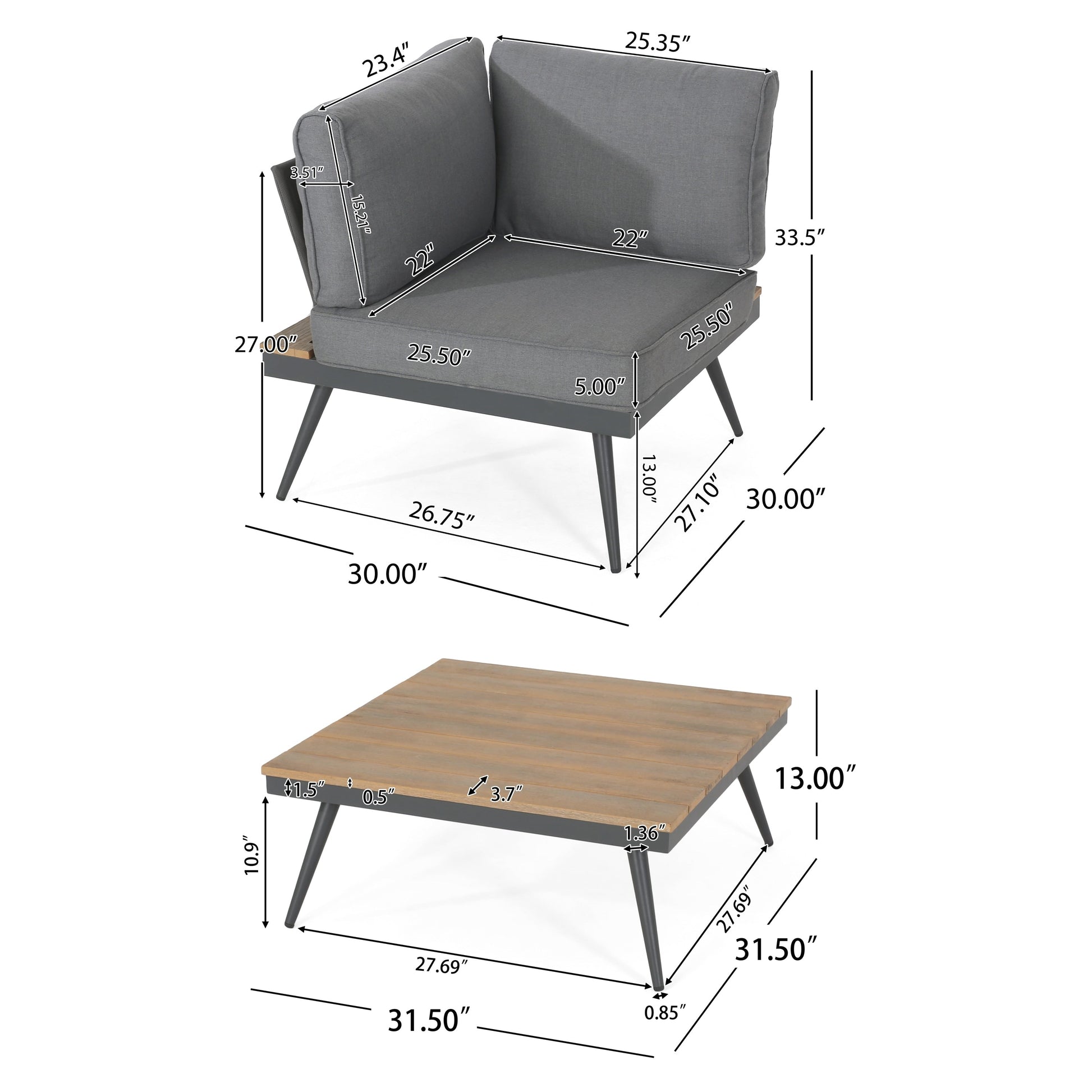 - Includes: One (1) left arm sectional, one (1) right arm sectional, one (1) corner seat sectional, and one (1) table