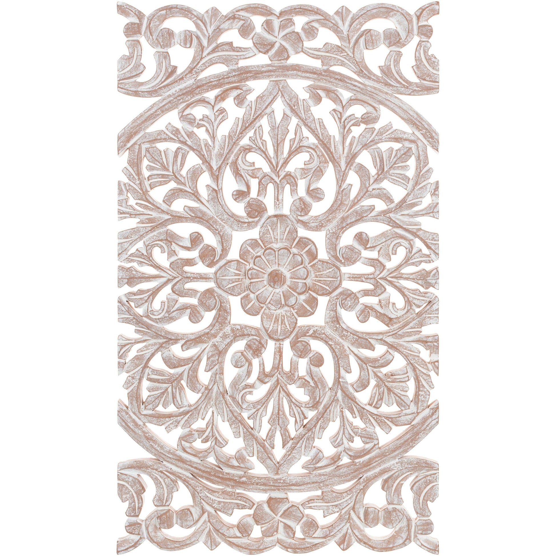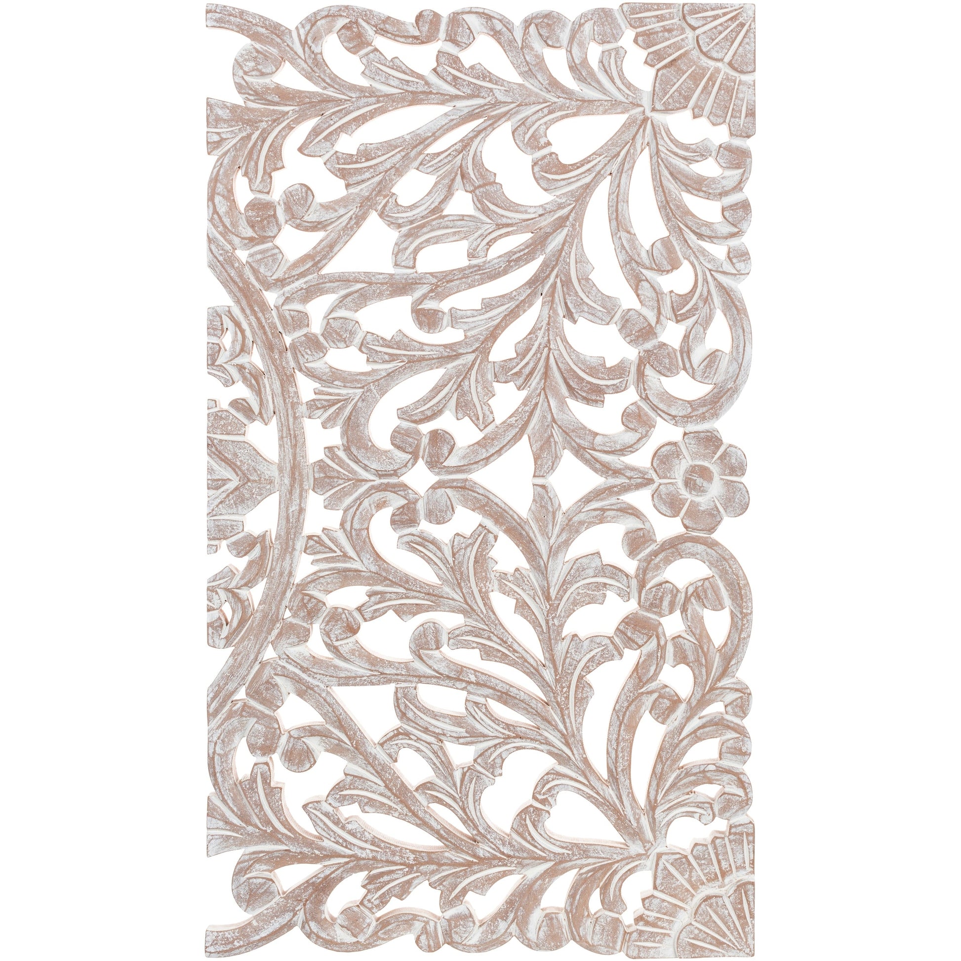 The elevated look of the Norma wall panels brings a wow factor to any space. This ornately-carved wood wall decor consists of 3 large wood panels. Each panel is hand-carved by an artisan giving it an antique feel. The intricate motif consists of festoon and acanthus in a distressed finish. It reinterprets the original, iconic Indian wood carving to an understated yet substantial motif. At 48 by 30 inches in total, it is an impressive addition to any room. To give it a modern appeal these panels are hand-finished by an artisan in tasteful, distressed finishes. Available in in a natural finish. Individual panels are 16 inches wide. Wipe clean with a dry cloth.