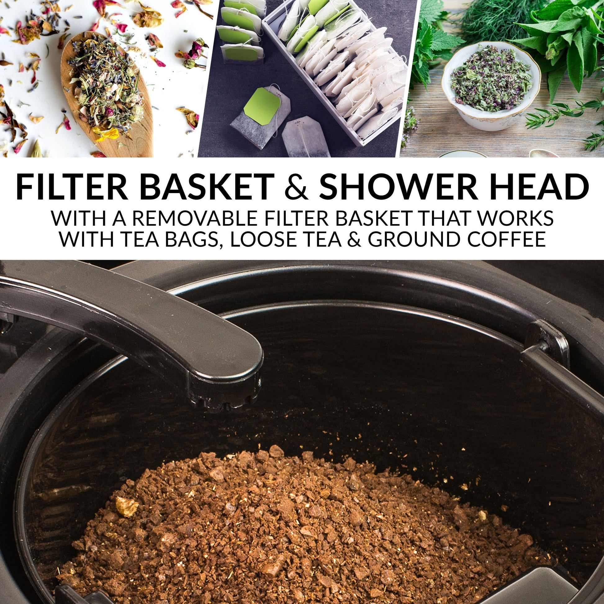 - FILTER BASKET & SHOWER HEAD: The removable filter basket works with fresh ground coffee, tea bags and loose leaf teas, while the shower head is designed for complete saturation and optimal flavor extraction