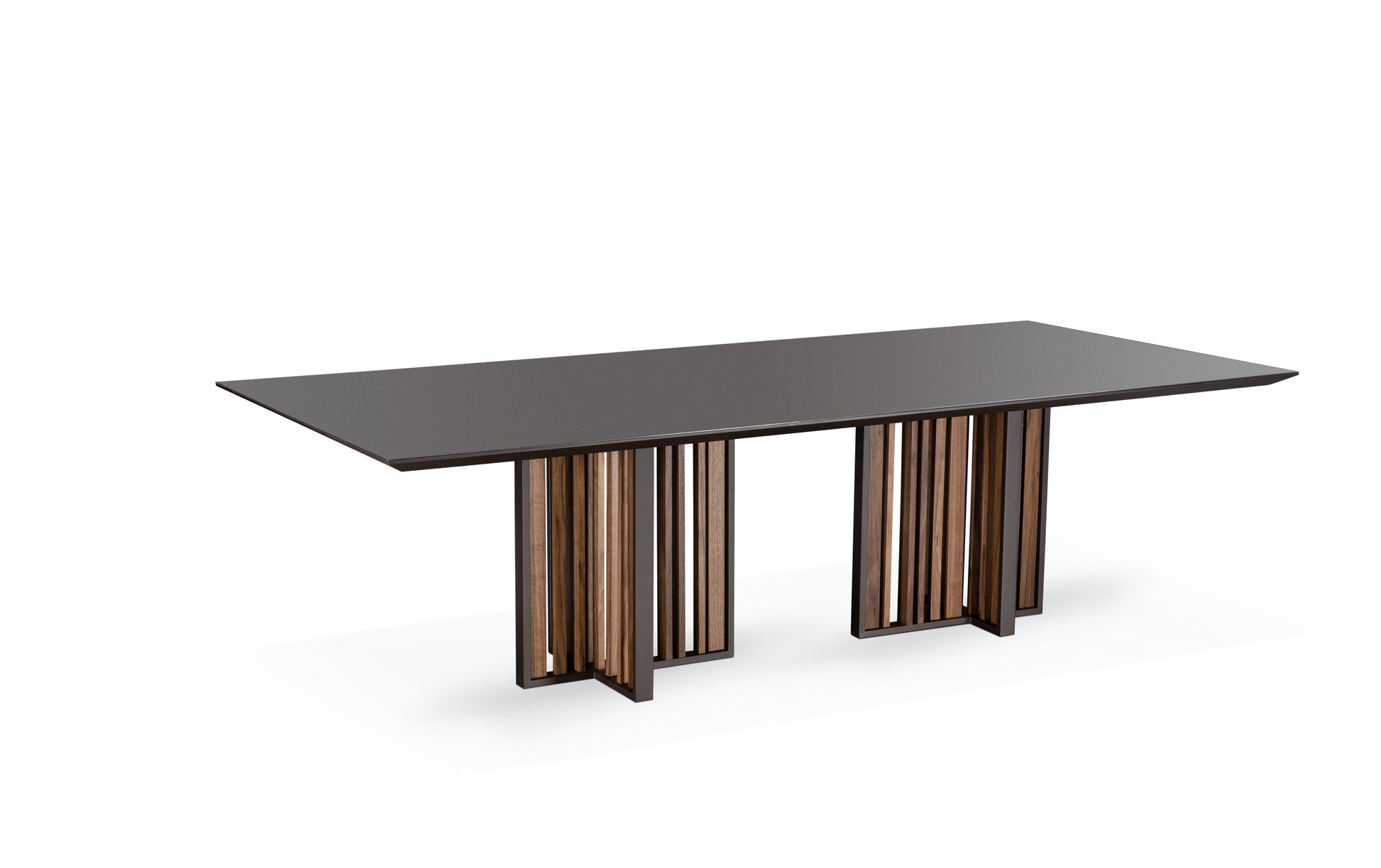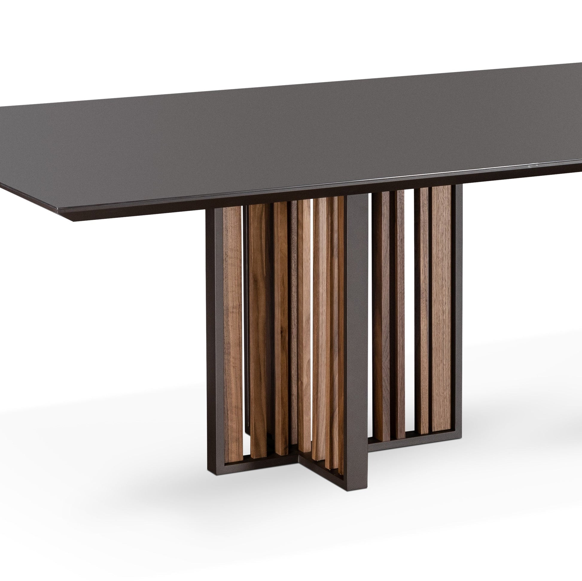 [description] La table à manger Oliver est un meuble au design contemporain, alliant caractère et originalité. Votre salle à manger se démarquera grâce à cette superbe table. Son plateau biseauté en verre coloré et bois laqué repose sur deux pieds associant métal thermolaqué et bois de noyer. Associez-la à des chaises modernes pour créer la salle à manger de vos rêves.