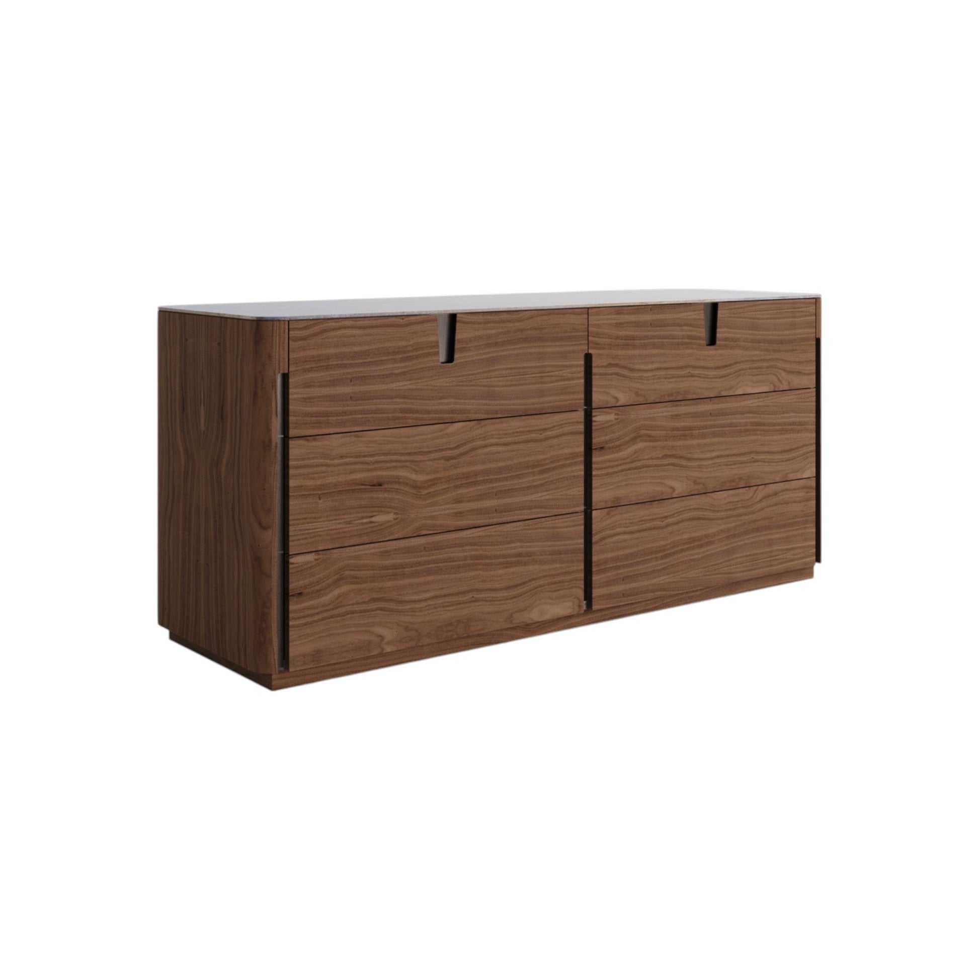 [description] La commode Opera en noyer se distingue par son style contemporain et la sophistication de ses matériaux. Ce meuble dispose de 6 tiroirs de rangement. Fabriqué en placage de noyer aux bords arrondis, il est doté d'un plateau en travertin et de finitions en acier bronze brossé. Associez-le aux tables de chevet Opera pour une chambre moderne.