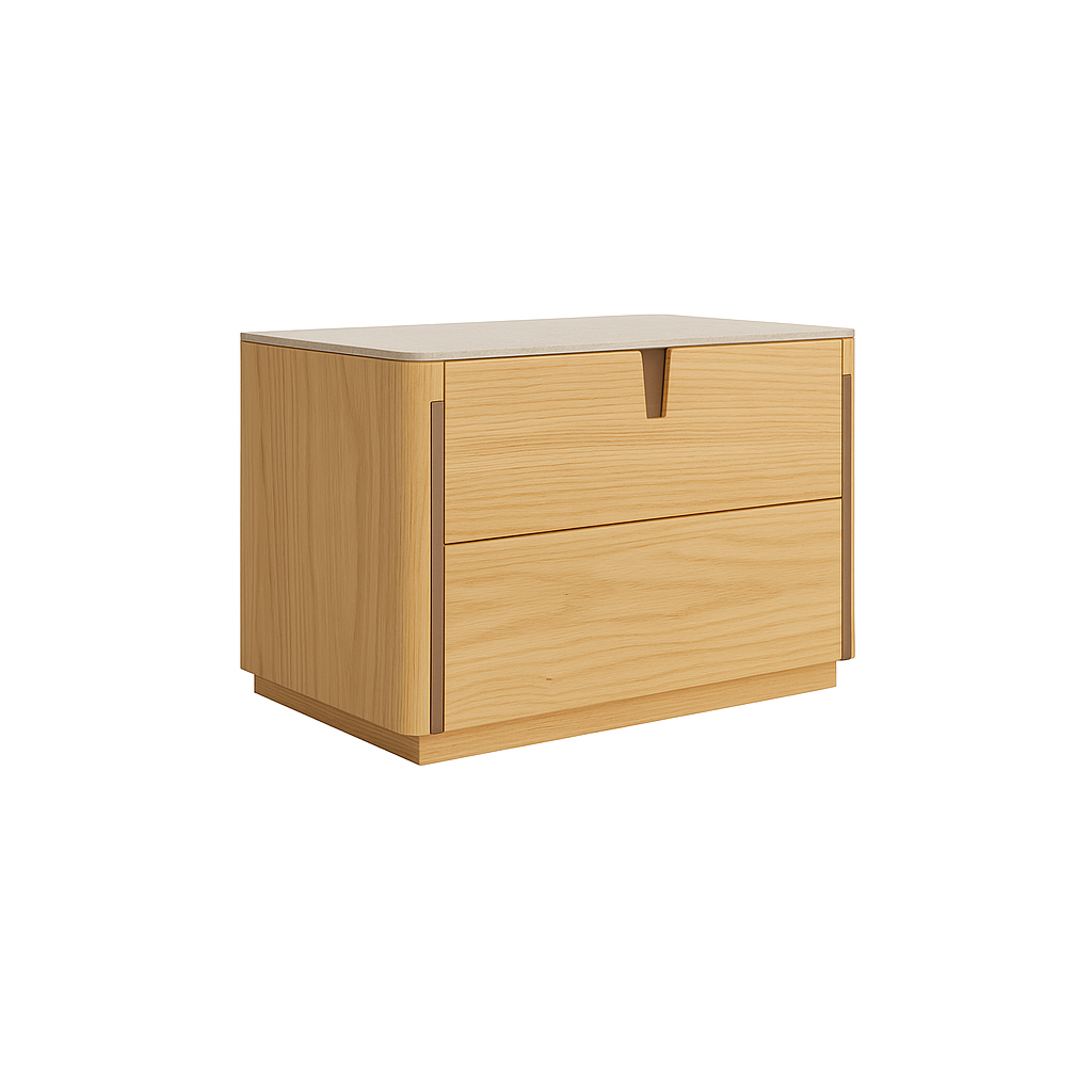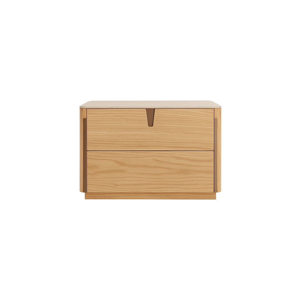 élégant et contemporain élégant et ample 2 tiroirs avec système de fermeture en douceur Finition en bois plaqué chêne naturel Dessus en porcelaine travertin Détails en métal bronze brossé grande taille |
