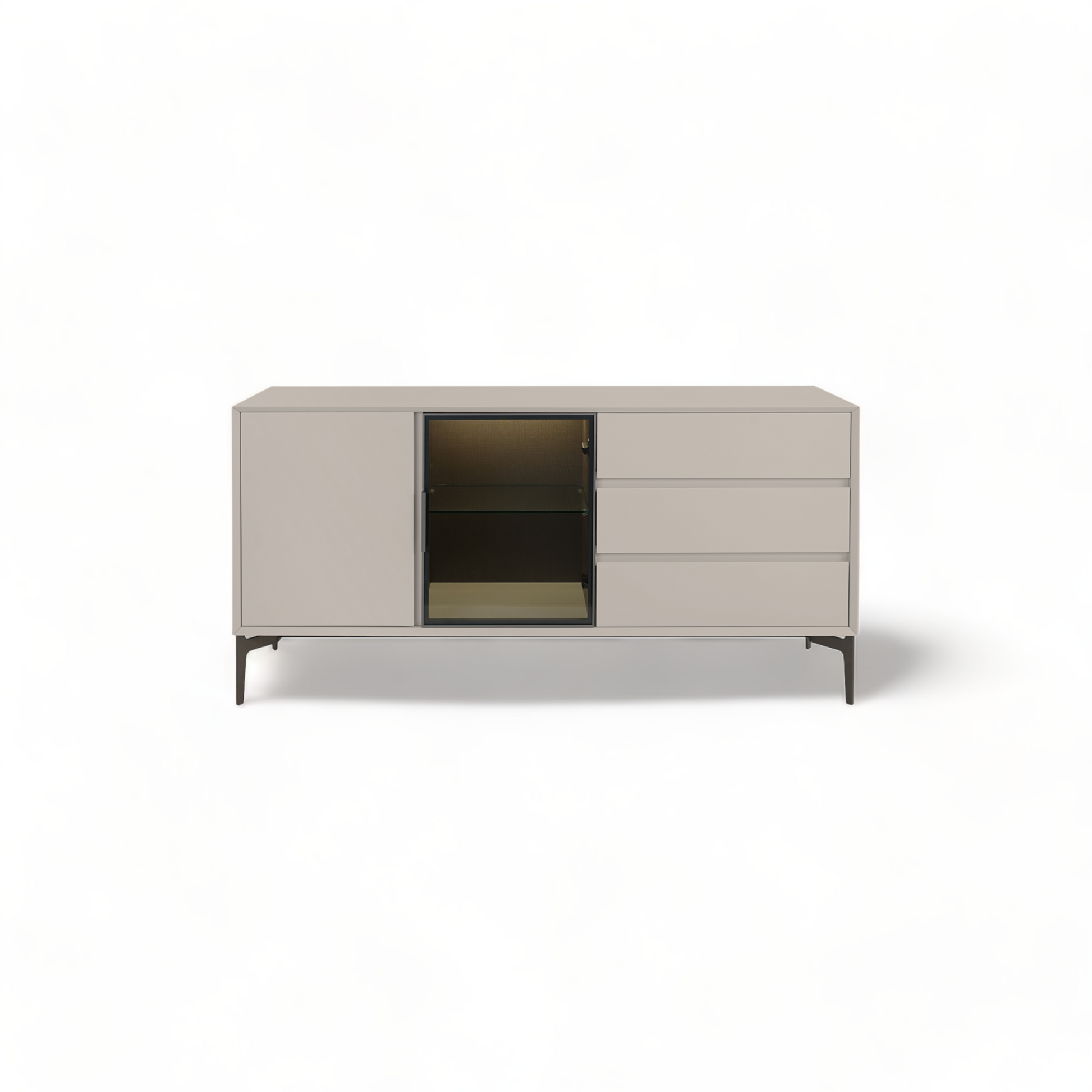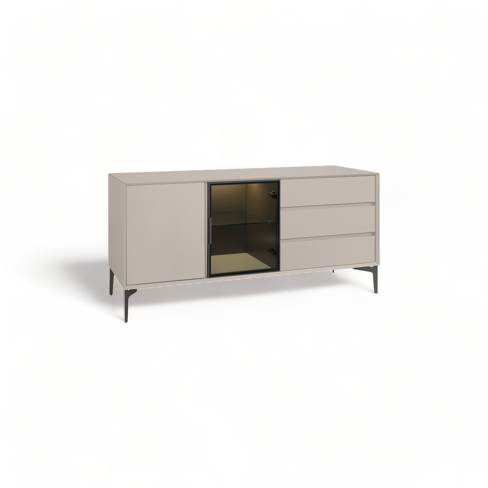 [description] Le buffet Origin se distingue par son design épuré et sa fonctionnalité. Il offre un grand espace de rangement. Il est doté d'une porte en bois, d'une porte en verre fumé et de trois tiroirs, idéal pour ranger vos couverts et votre vaisselle. Le meuble est entièrement laqué beige-gris mat et repose sur des pieds en métal au design moderne, finition thermolaquée gris foncé graphite. Le buffet Origin est un excellent choix pour votre salle à manger.