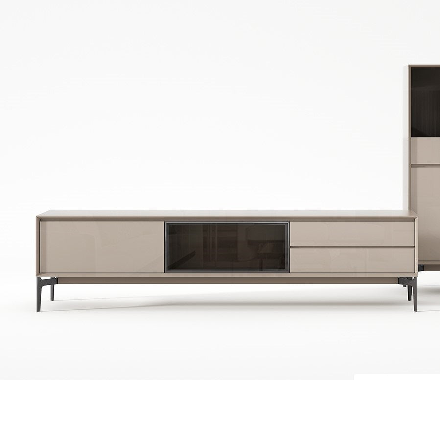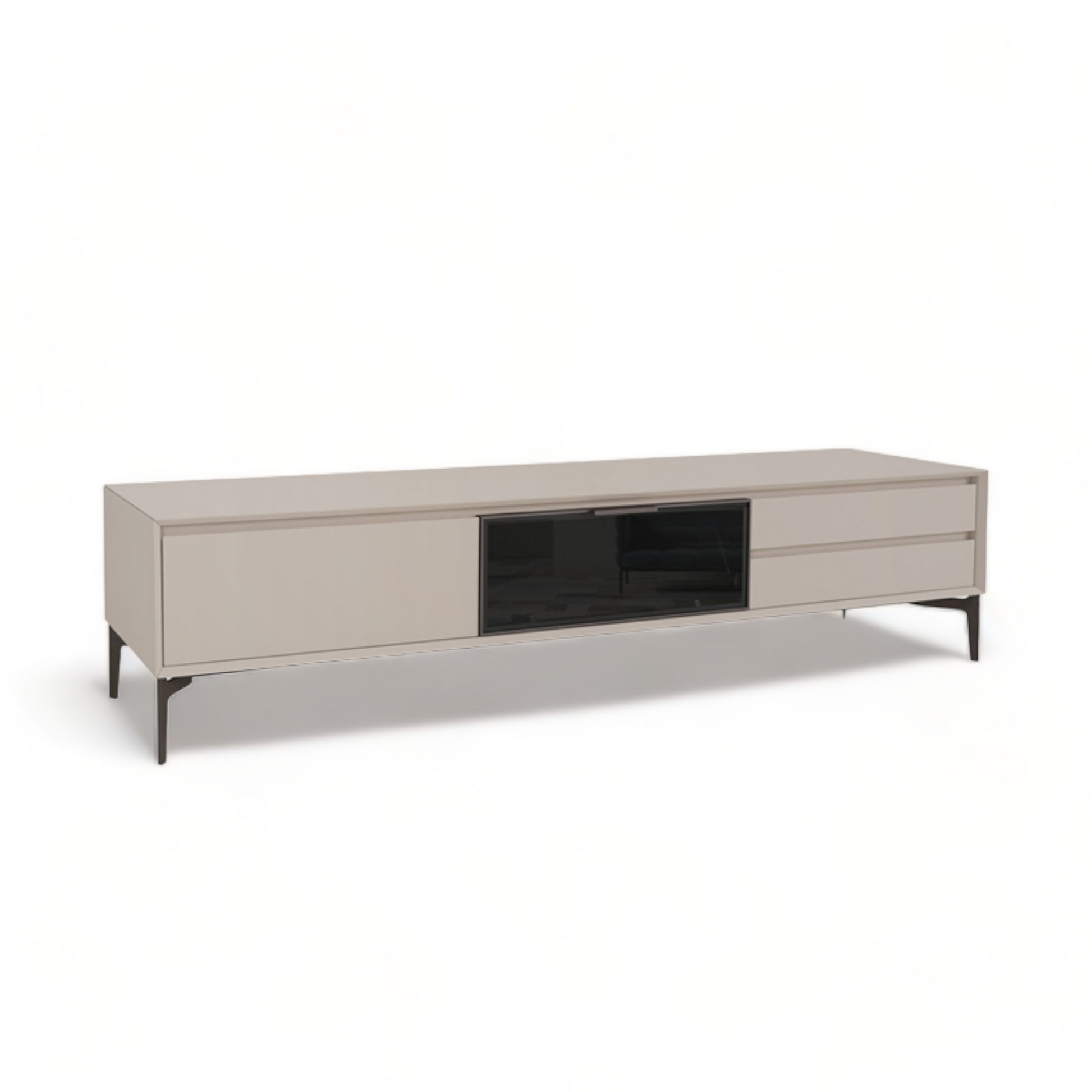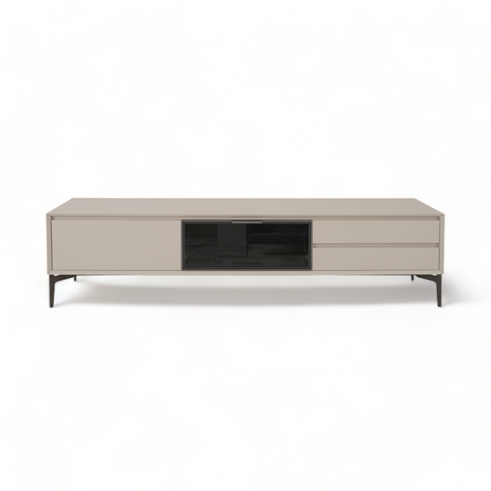 [description] Le meuble TV Origin est le meuble idéal pour votre espace contemporain. Il est doté d'un meuble au design élégant et moderne avec tiroirs, une porte laquée et une porte battante en verre fumé, soutenu par d'élégants pieds gris foncé. Entièrement laqué beige-gris mat, ce meuble TV sera le choix idéal pour votre salle multimédia et votre salon.